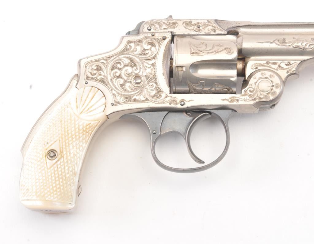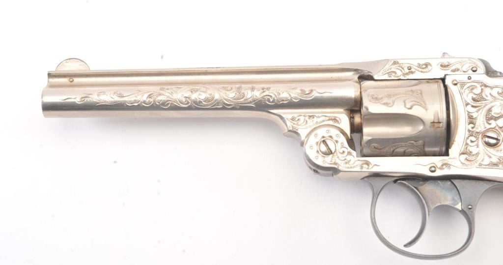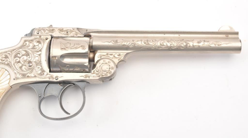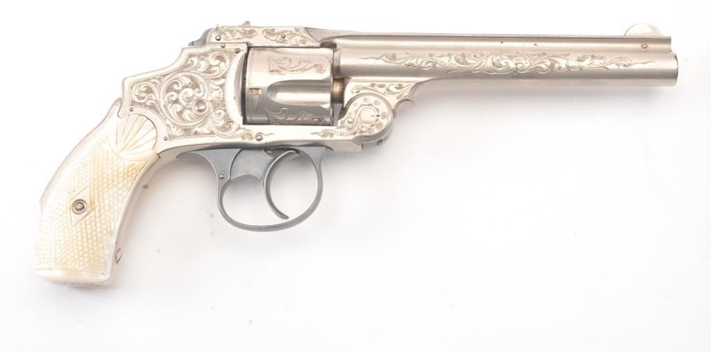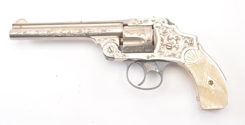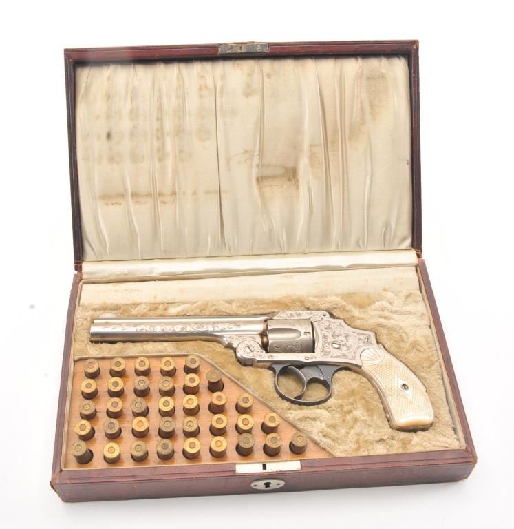 Deluxe engraved and cased Smith & Wesson "New Departure" .38 S&W caliber revolver S/N 55743 and made pre-1898. Fine carved and checkered pearl grips with New York scroll style engravings. 5" barrel and retaining90%-95% soft original unpolished nickel with excellent grips. Considerable blue and case colors on small parts. Interior and bore is about fine and tight action. Schuyler, Hartley and Graham style casing with satin in lid and leather covered case. The case is good with minor staining, fraying and some aging. The latch to the box was pried open. An exceptional example of this model. Est.: $2000-$4000