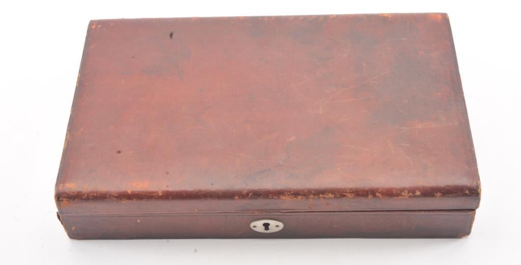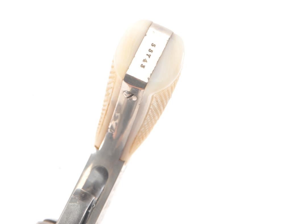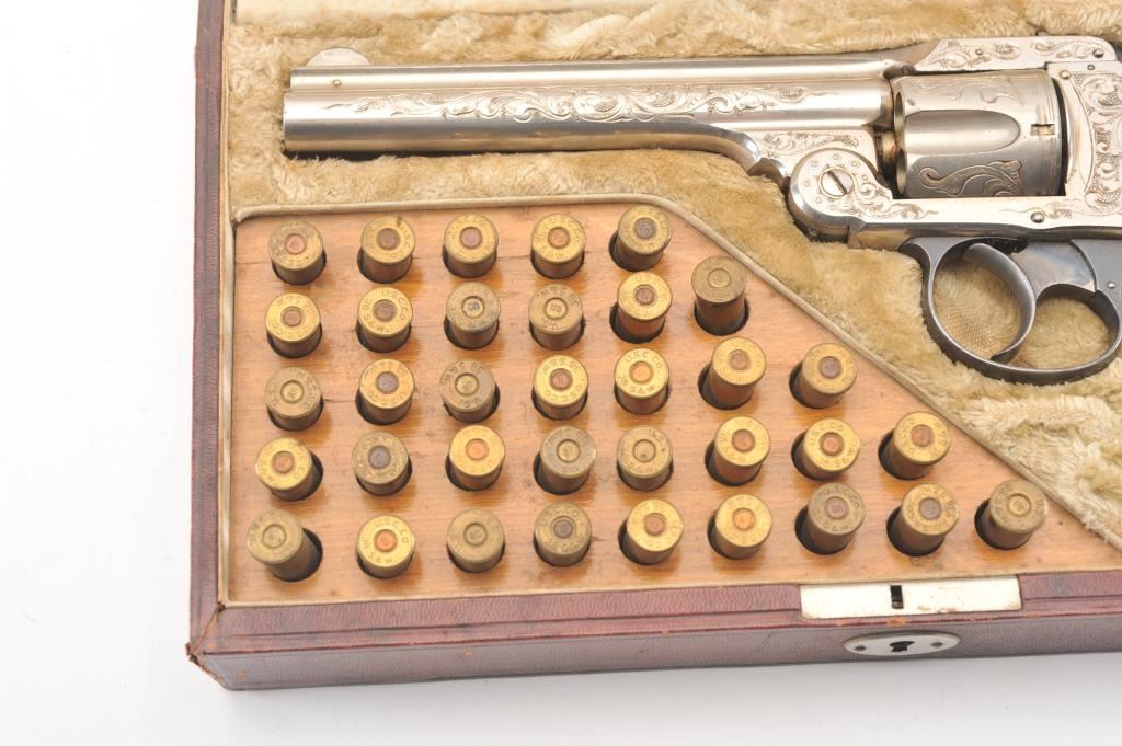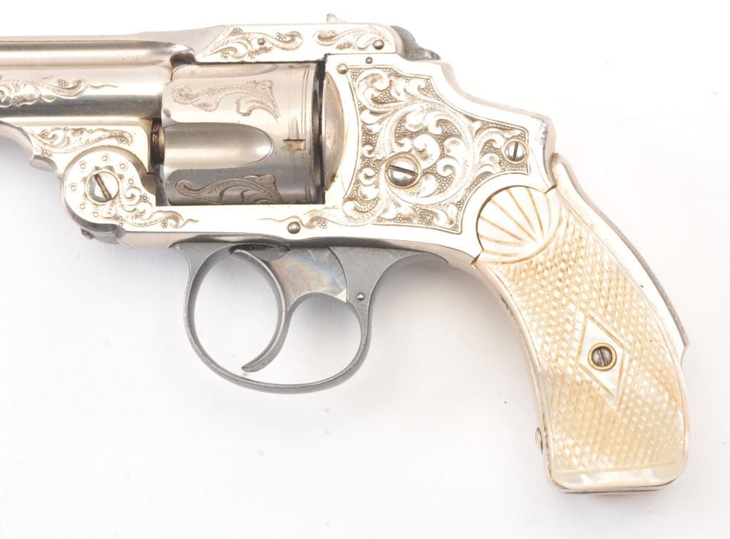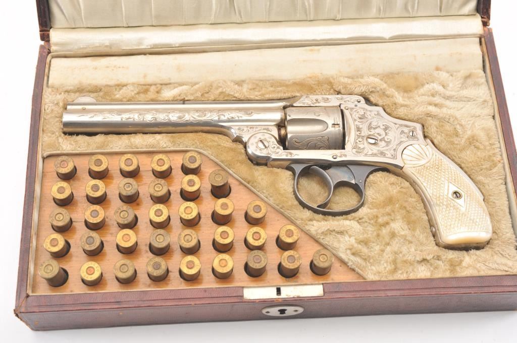 Deluxe engraved and cased Smith & Wesson "New Departure" .38 S&W caliber revolver S/N 55743 and made pre-1898. Fine carved and checkered pearl grips with New York scroll style engravings. 5" barrel and retaining90%-95% soft original unpolished nickel with excellent grips. Considerable blue and case colors on small parts. Interior and bore is about fine and tight action. Schuyler, Hartley and Graham style casing with satin in lid and leather covered case. The case is good with minor staining, fraying and some aging. The latch to the box was pried open. An exceptional example of this model. Est.: $2000-$4000