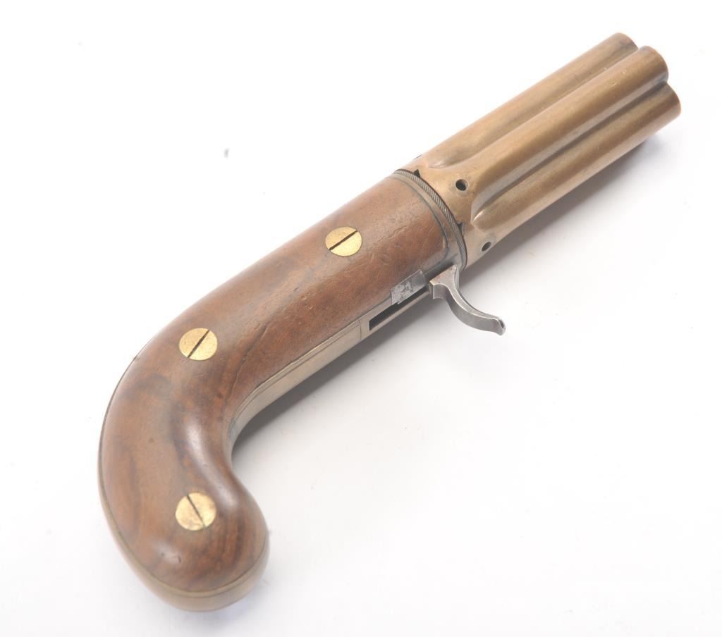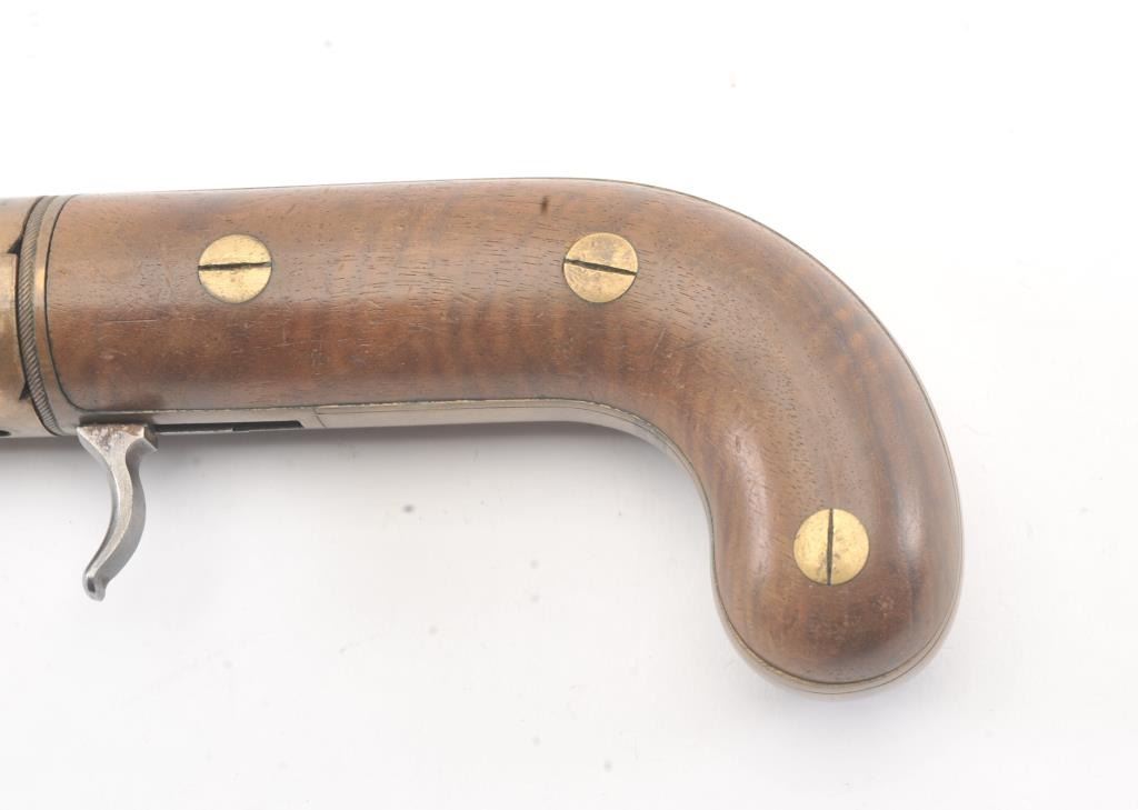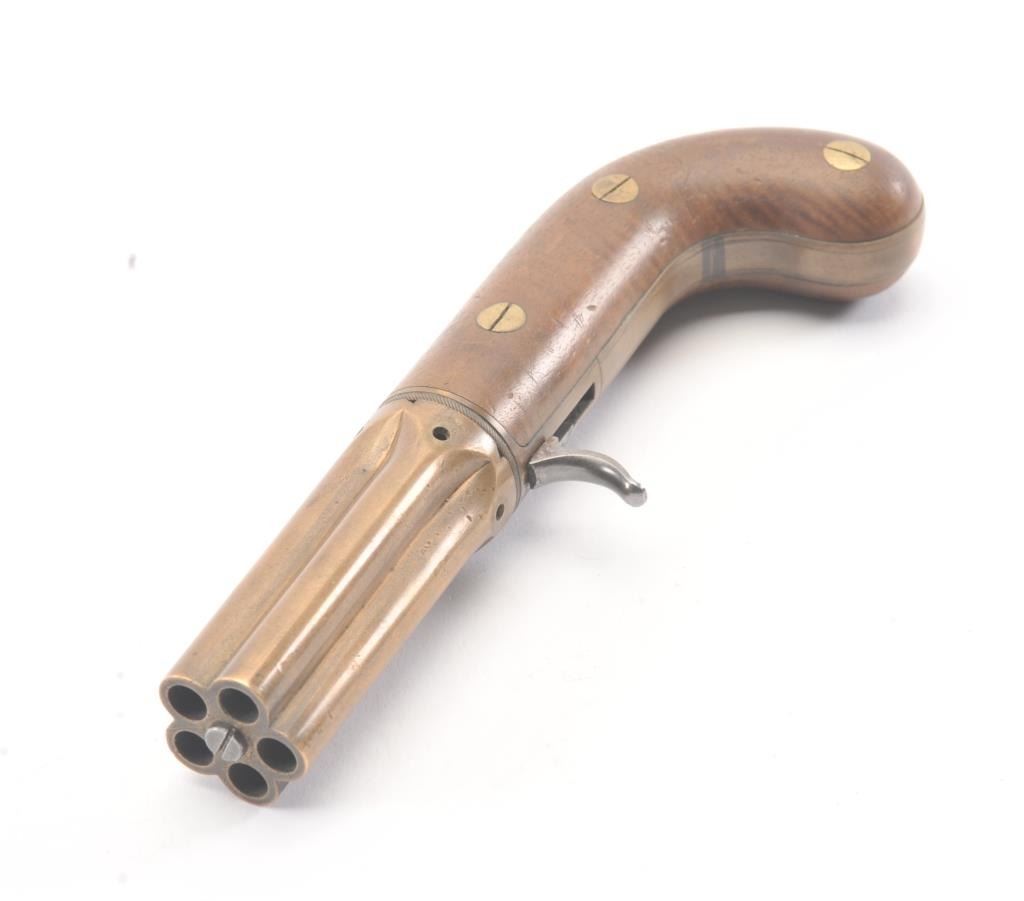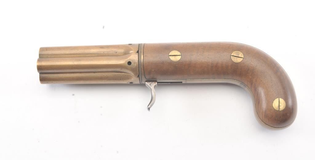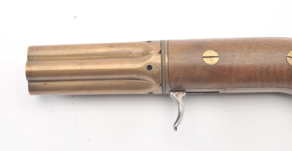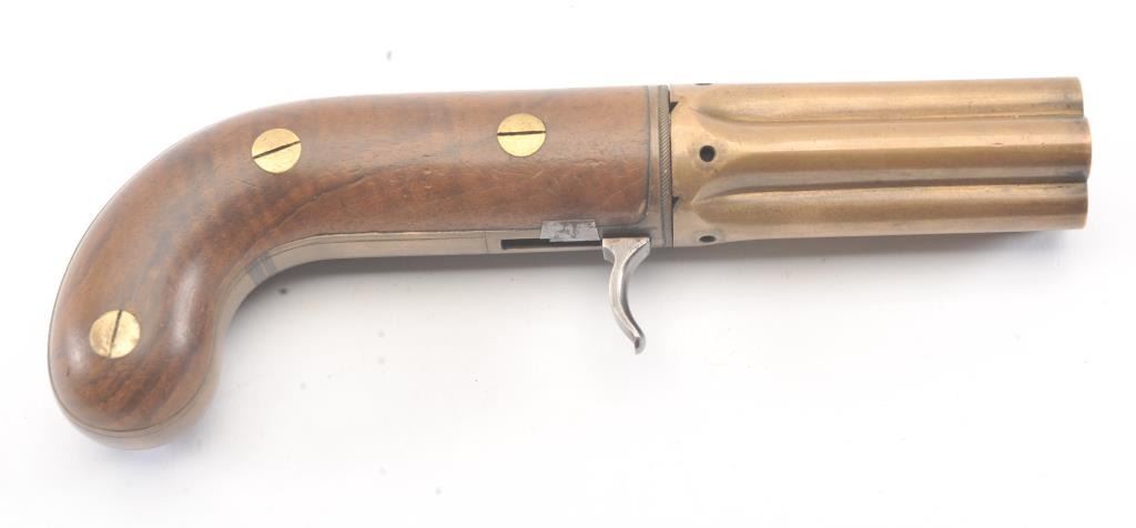 Rare American pepperbox signed "Budding Maker" measuring 8" overall with a 3 1/2" fluted barrel group of approximately .31 caliber smoothbore 6 shot. Hand revolved barrel and trigger locks to side and ispushed off to fire. American stripped wood stock with brass screws. Fine to near excellent condition and possibly a prototype. Provenance "Dick" Bowen collection. (Antique) Est.: $3000-$6000