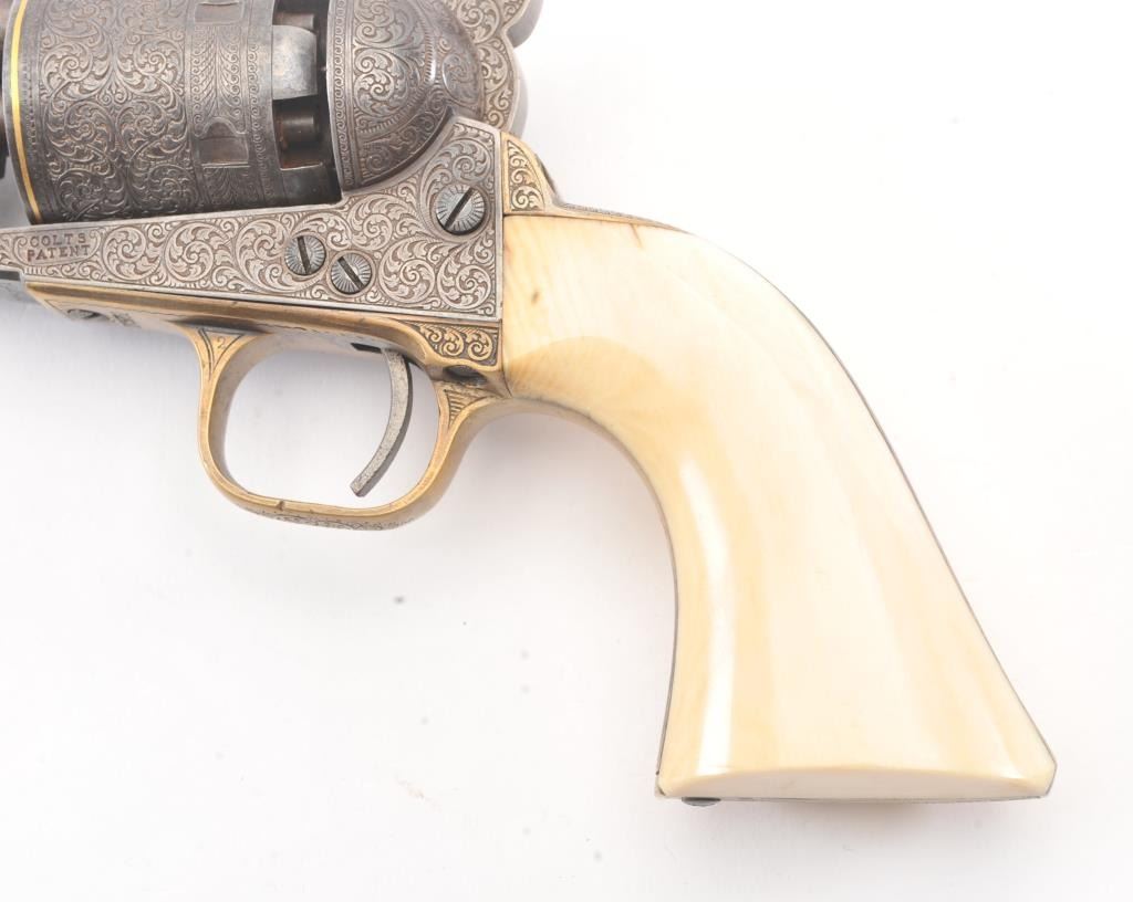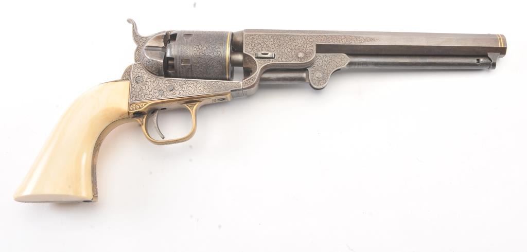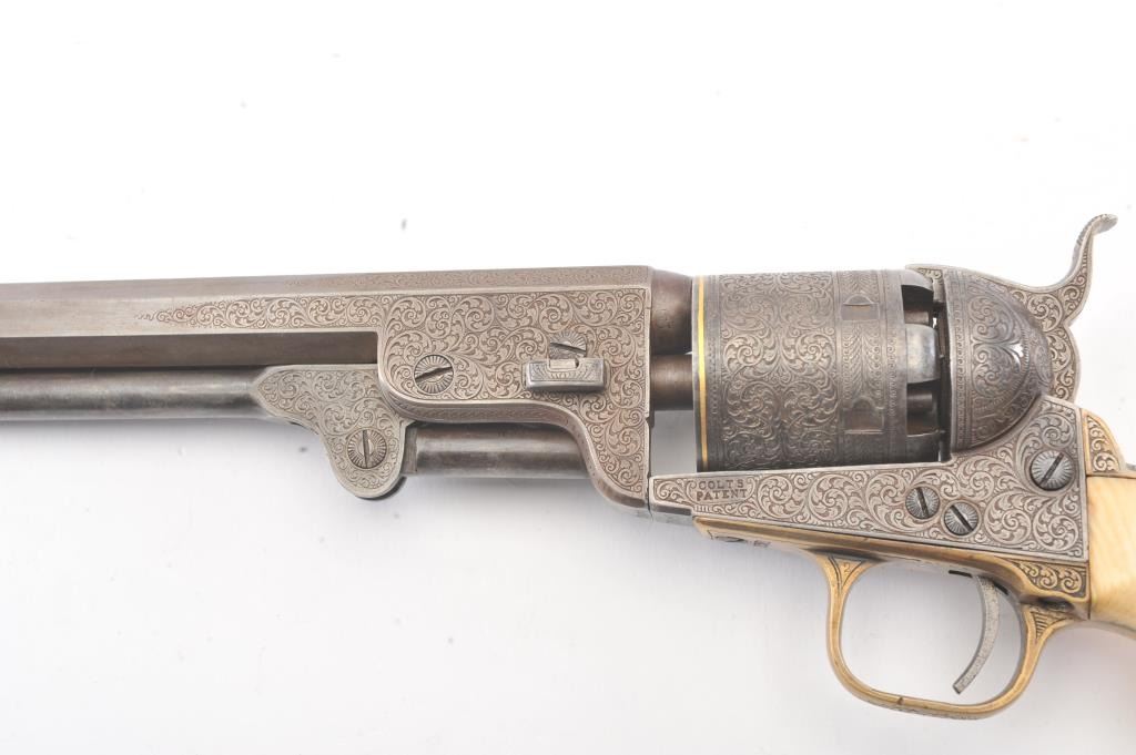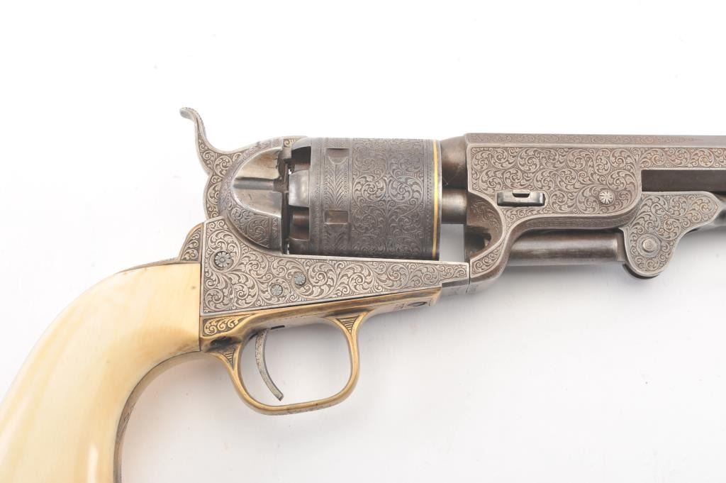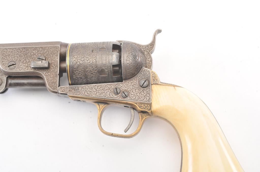 Colt 1851 Navy percussion revolver in .36 caliber finely bank note scroll engraved, gold banded, ivory grips, S/N 175761. Gray to brown patina finish with good markings and near fine grips with pleasant patina that are original to the era. Safety pins remain and sharp markings. The engraving is English in style and of the best quality. The gold inlay is similar to a set presented to Capt. West from Sam’L Colt on the cover of Joe MurphyCollection book. All matching numbers. A period engraved and gold inlaid Navy Colt. (Antique) Est.: $3000-$6000