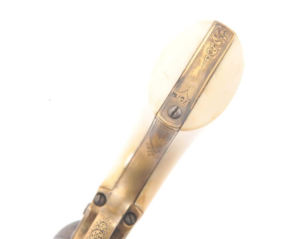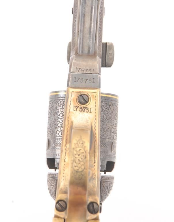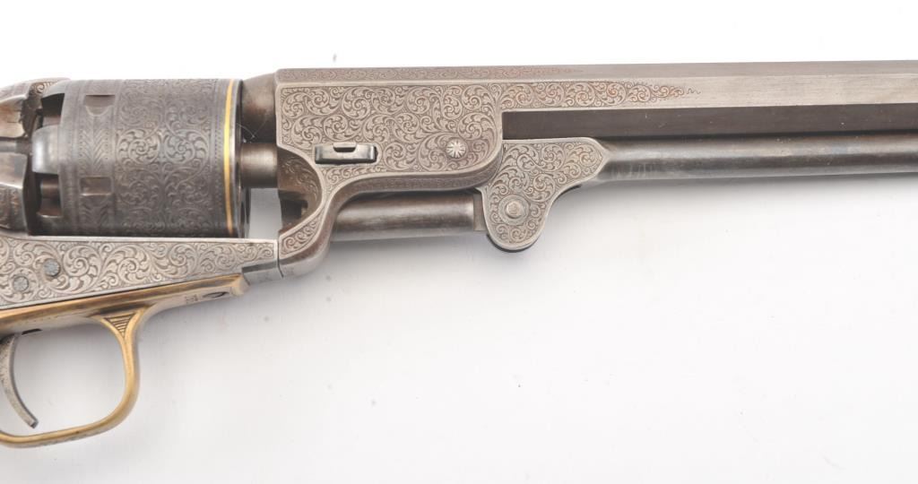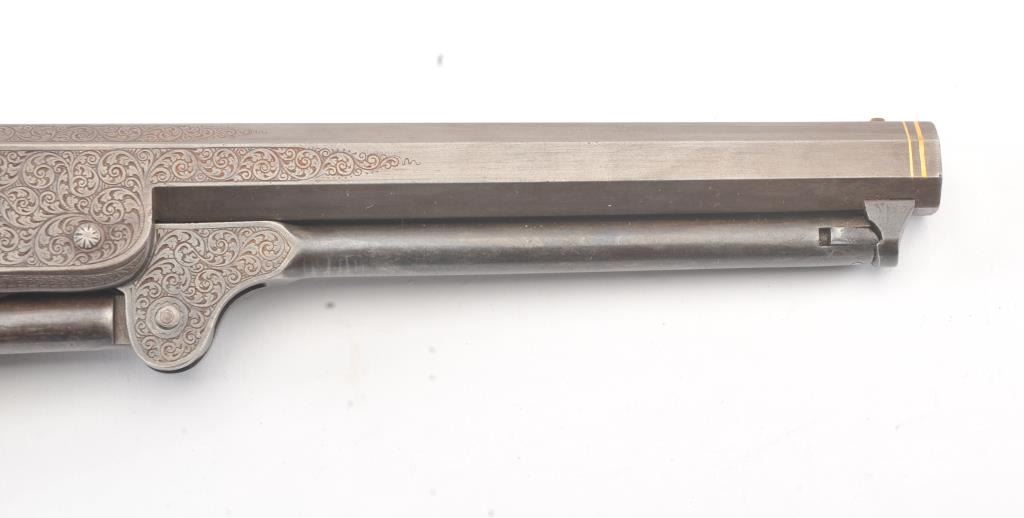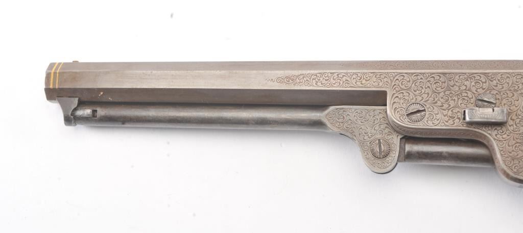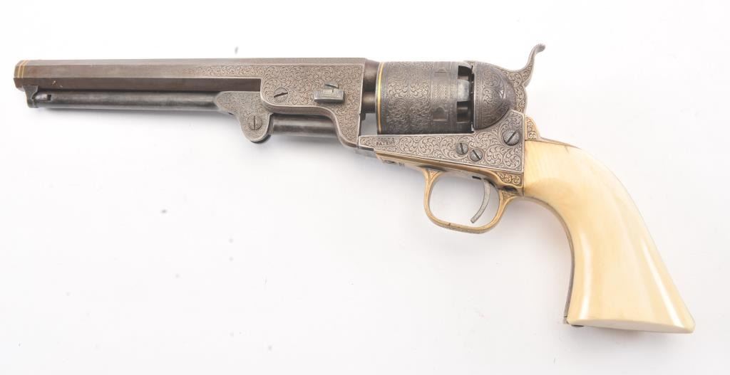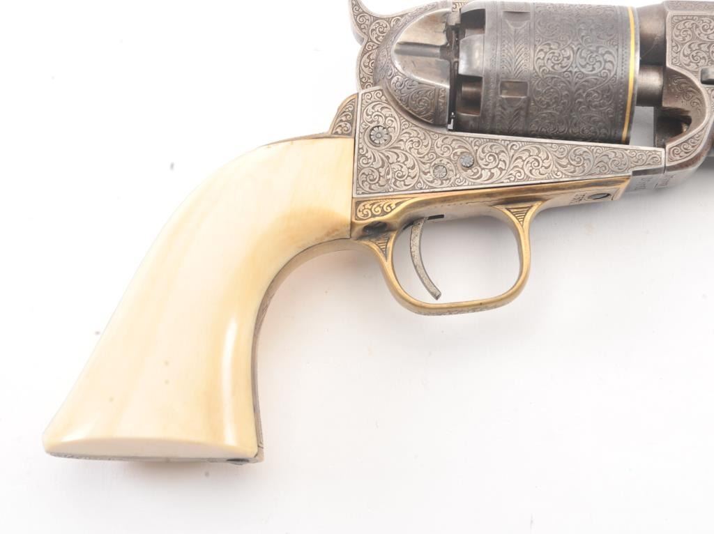 Colt 1851 Navy percussion revolver in .36 caliber finely bank note scroll engraved, gold banded, ivory grips, S/N 175761. Gray to brown patina finish with good markings and near fine grips with pleasant patina that are original to the era. Safety pins remain and sharp markings. The engraving is English in style and of the best quality. The gold inlay is similar to a set presented to Capt. West from Sam’L Colt on the cover of Joe MurphyCollection book. All matching numbers. A period engraved and gold inlaid Navy Colt. (Antique) Est.: $3000-$6000