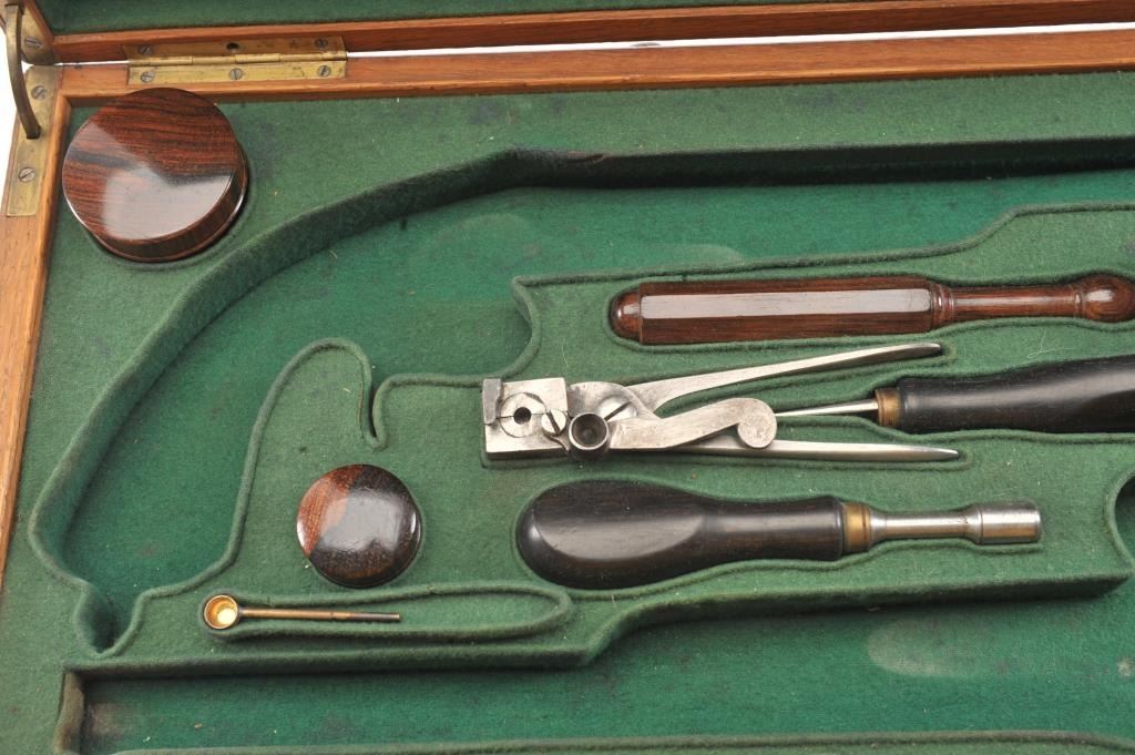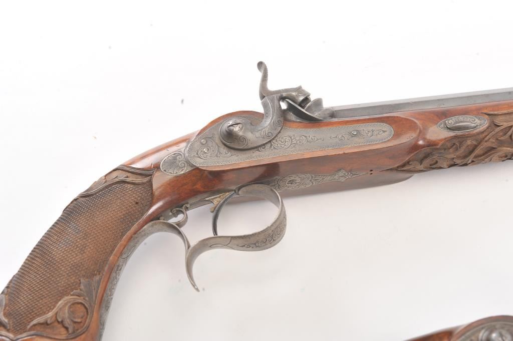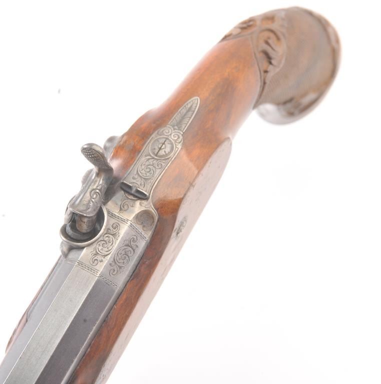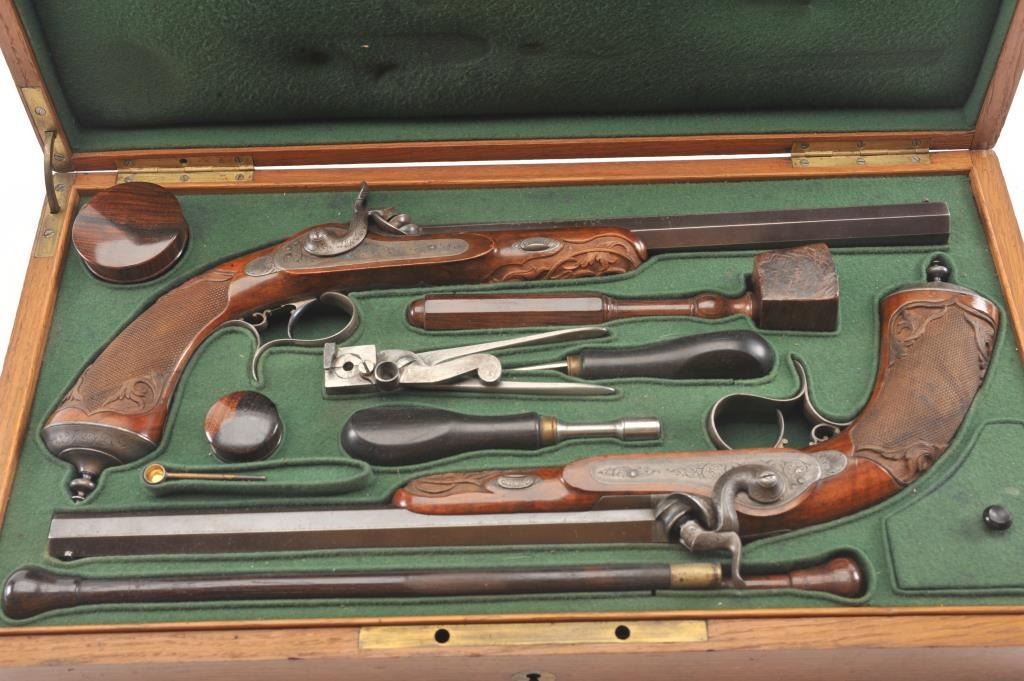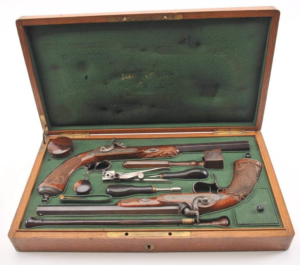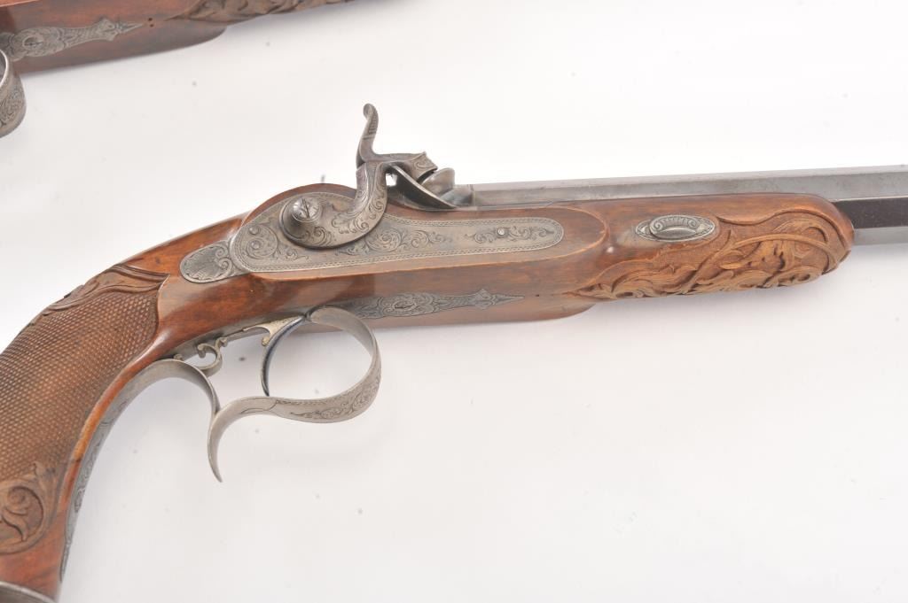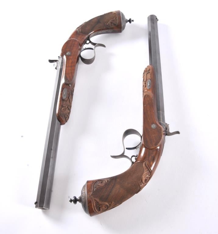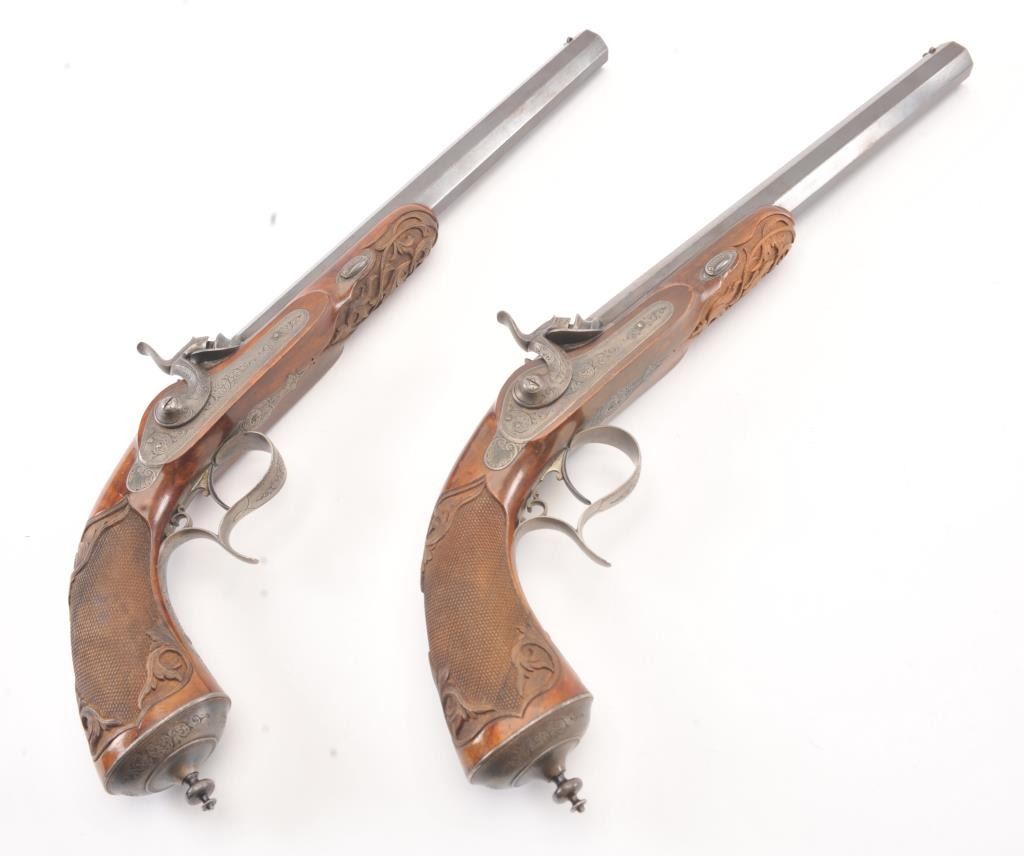 Pair of cased target pistols by Gastinne Renette of Paris. Measures 17” overall with a 10 ½” barrels of approximately .45 caliber rifled. 75%-85% original browned finish on the barrels with a similar amount of casehardening on the locks and mounts. Nicely carved and checkered stocks. The pair are near fine showing minor use. The felt lined French style case is very good plus condition with correct mold and full complement ofaccessories. The powder dipper is replaced and original lost. The oak exterior of the case is very good plus also with just minor scratches. Gastinne Renette was a top maker in the late percussion era and ran a schooldueling in Paris. (Antique) Est.: $3000-$6000