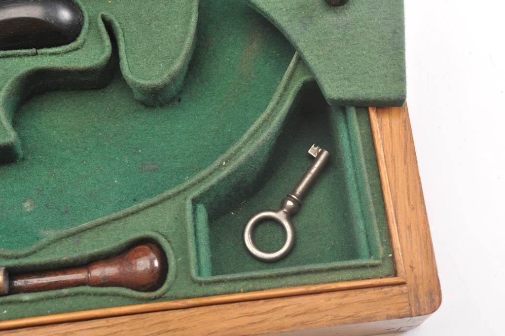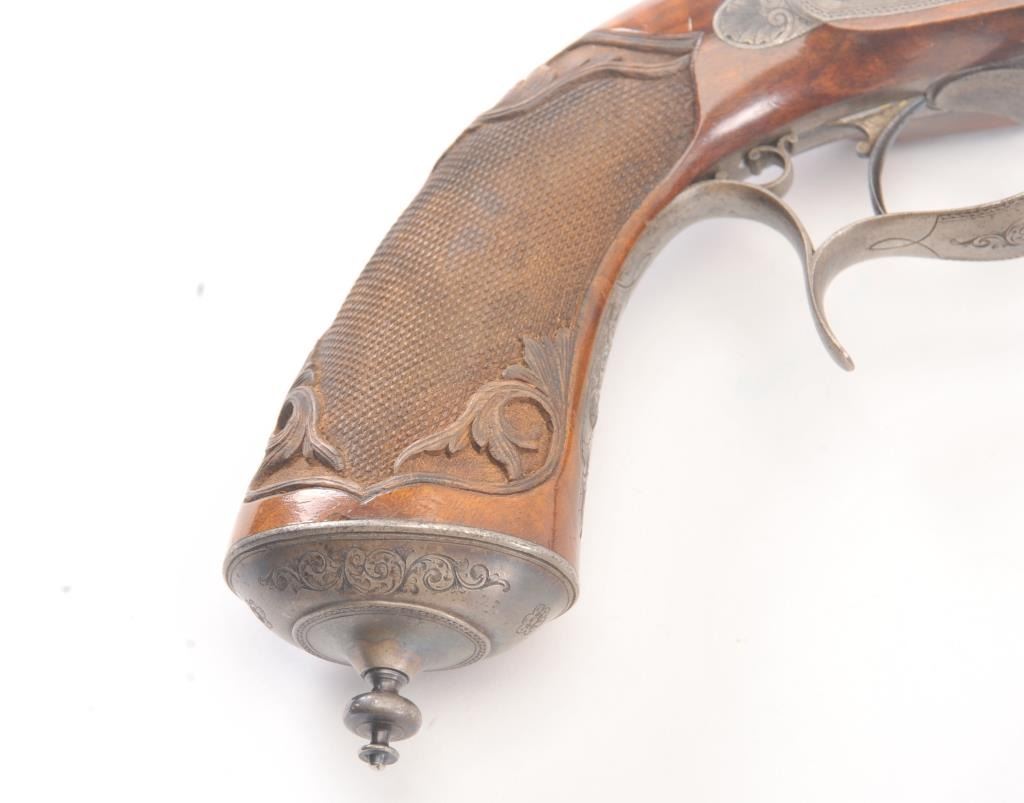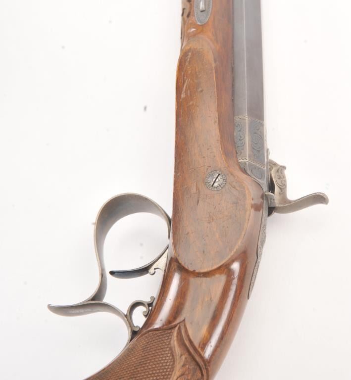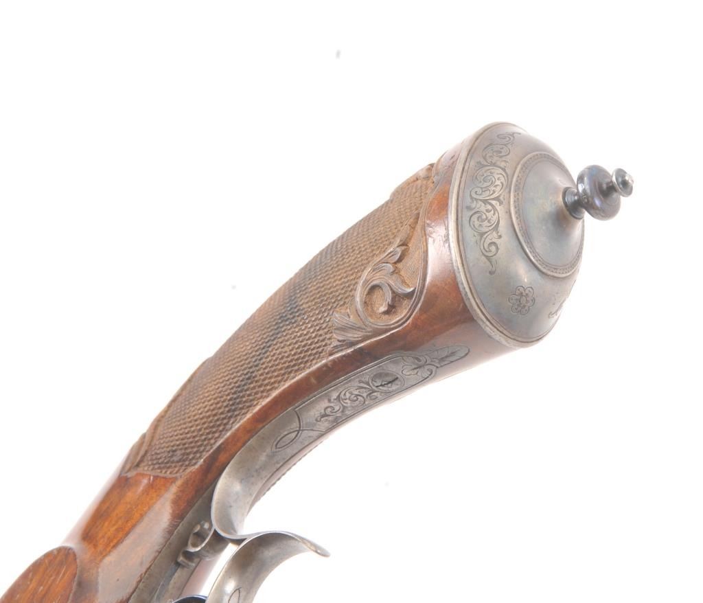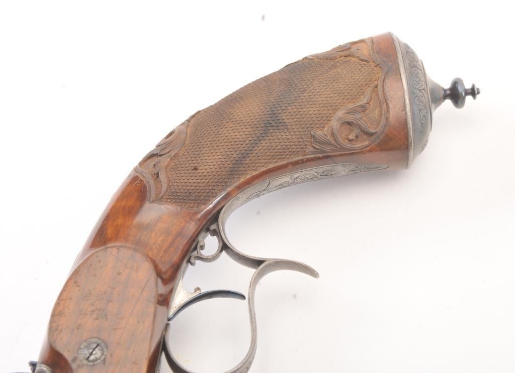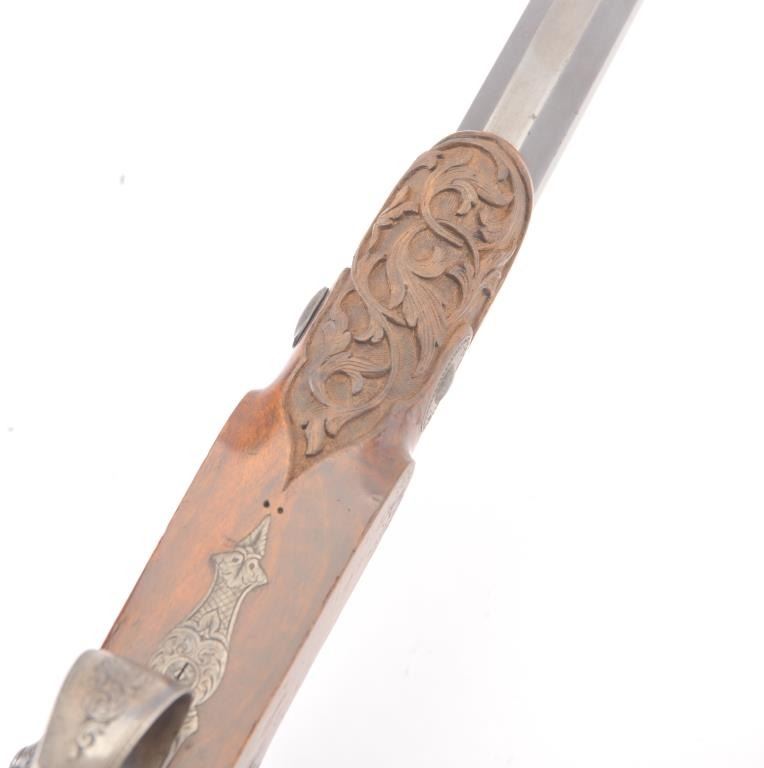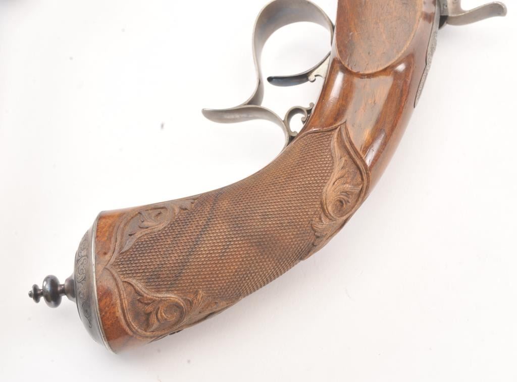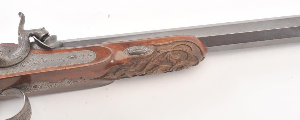 Pair of cased target pistols by Gastinne Renette of Paris. Measures 17” overall with a 10 ½” barrels of approximately .45 caliber rifled. 75%-85% original browned finish on the barrels with a similar amount of casehardening on the locks and mounts. Nicely carved and checkered stocks. The pair are near fine showing minor use. The felt lined French style case is very good plus condition with correct mold and full complement ofaccessories. The powder dipper is replaced and original lost. The oak exterior of the case is very good plus also with just minor scratches. Gastinne Renette was a top maker in the late percussion era and ran a schooldueling in Paris. (Antique) Est.: $3000-$6000