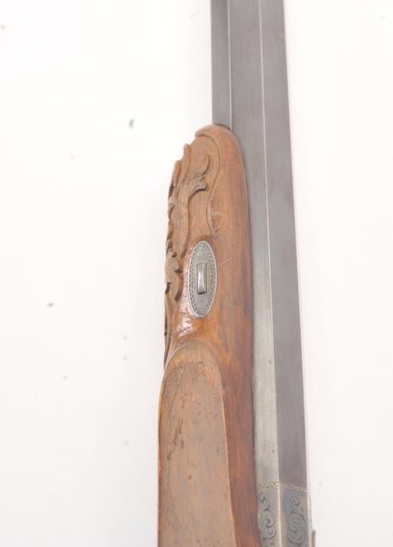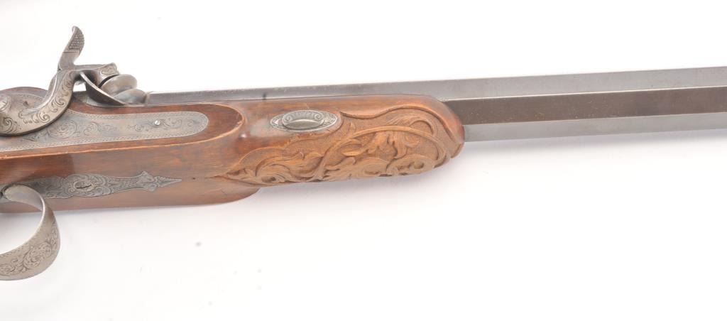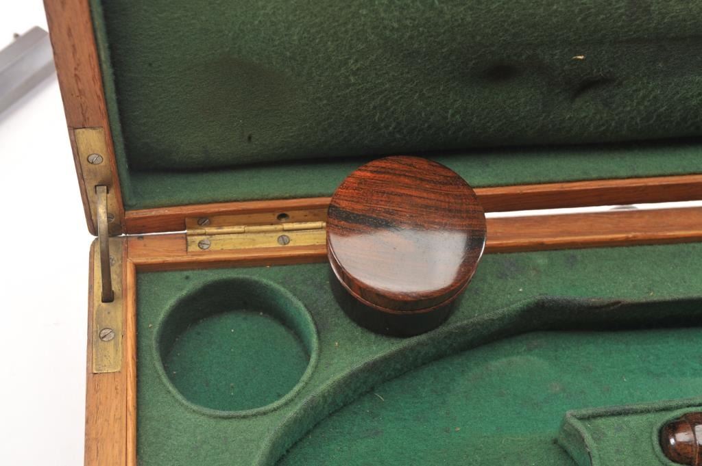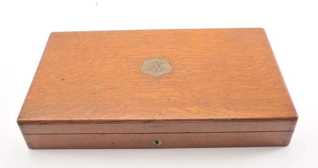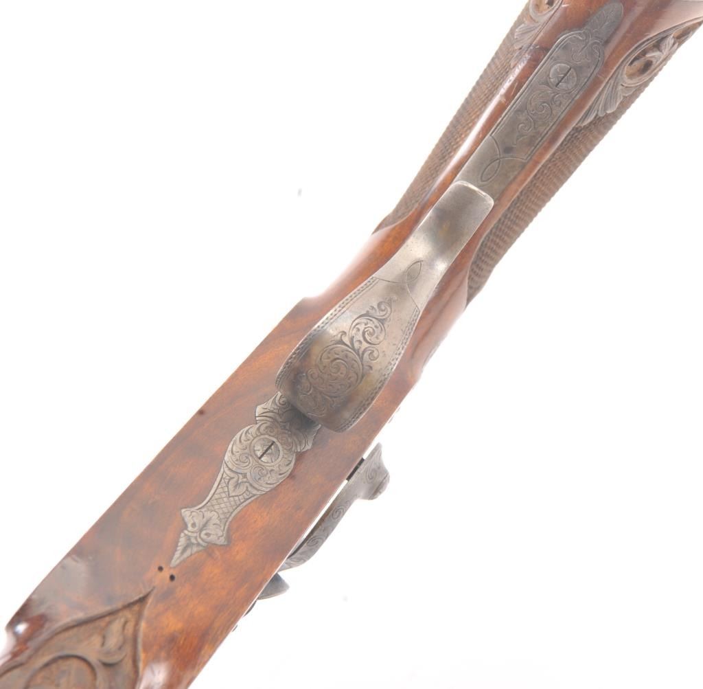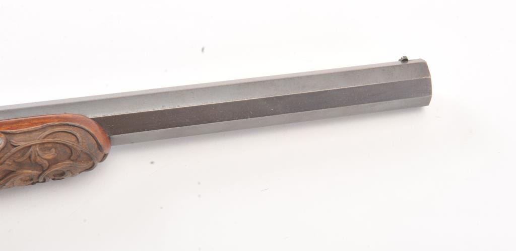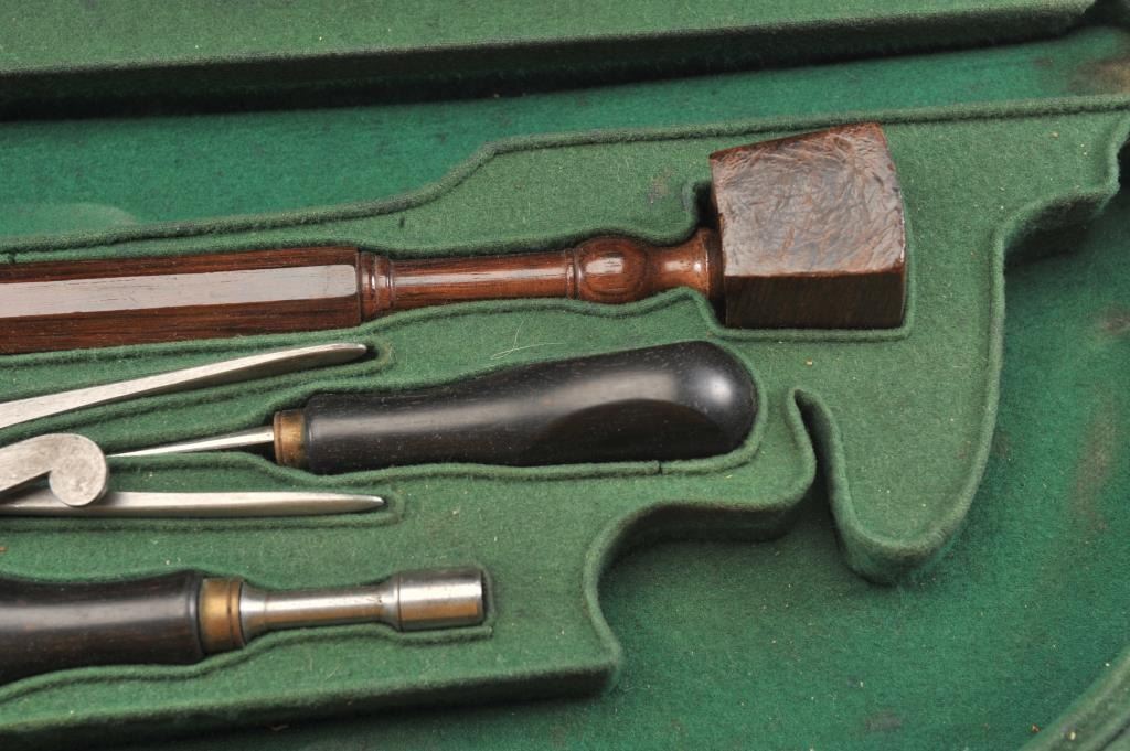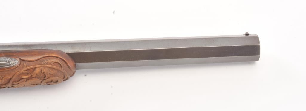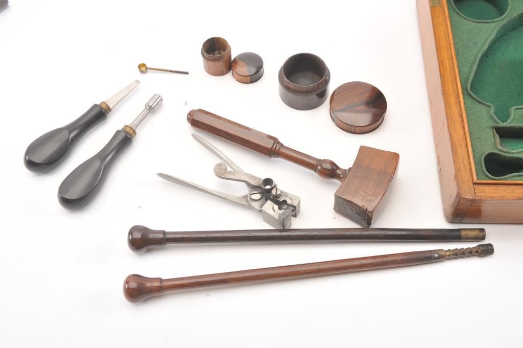 Pair of cased target pistols by Gastinne Renette of Paris. Measures 17” overall with a 10 ½” barrels of approximately .45 caliber rifled. 75%-85% original browned finish on the barrels with a similar amount of casehardening on the locks and mounts. Nicely carved and checkered stocks. The pair are near fine showing minor use. The felt lined French style case is very good plus condition with correct mold and full complement ofaccessories. The powder dipper is replaced and original lost. The oak exterior of the case is very good plus also with just minor scratches. Gastinne Renette was a top maker in the late percussion era and ran a schooldueling in Paris. (Antique) Est.: $3000-$6000
