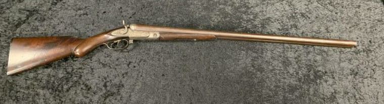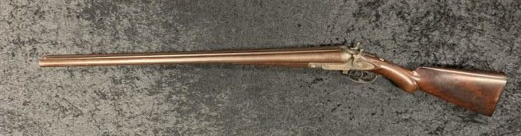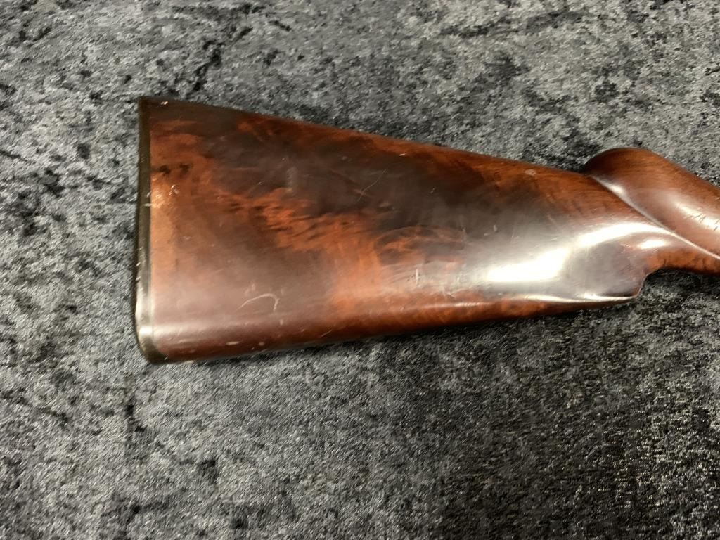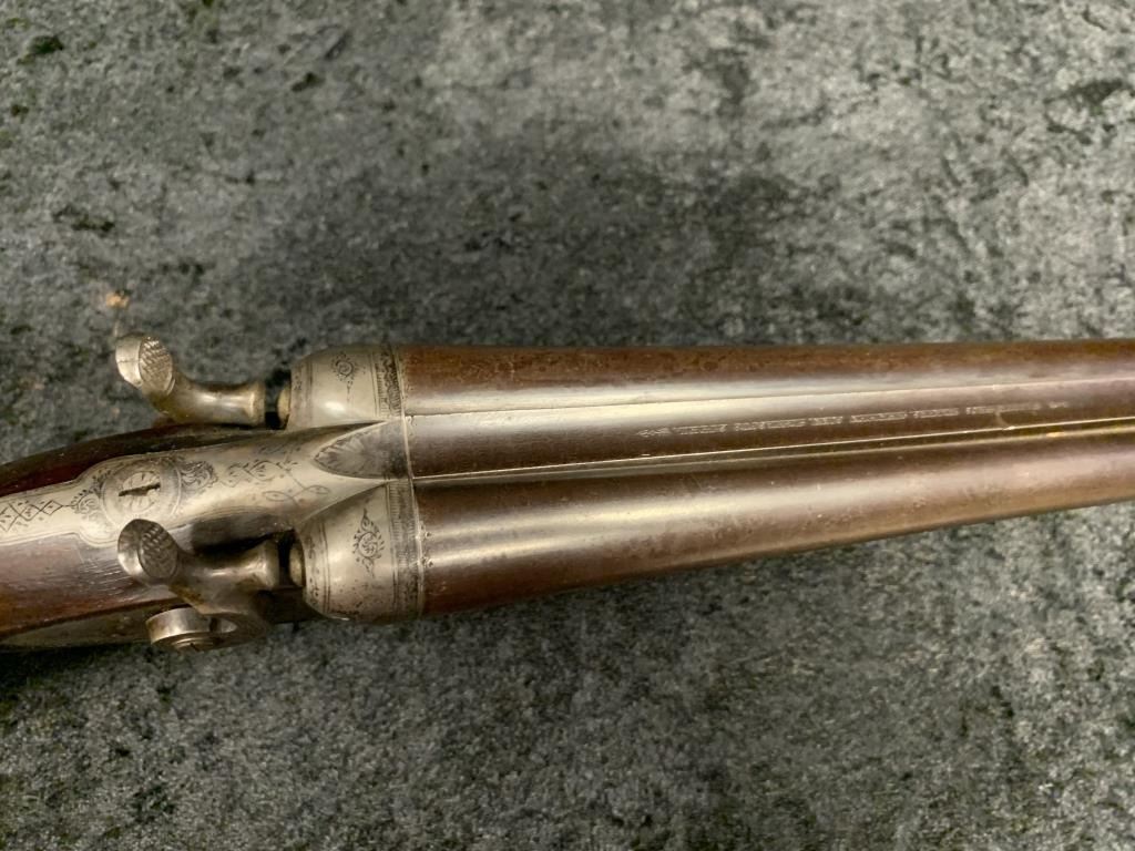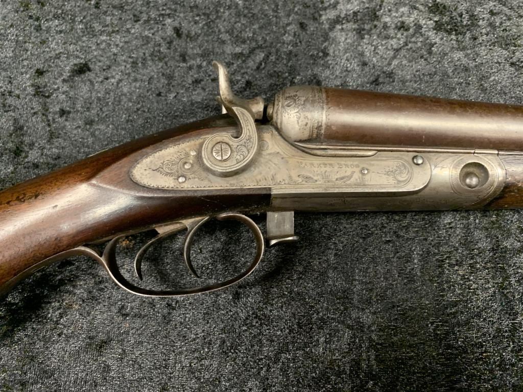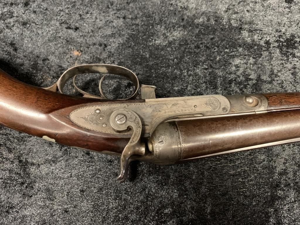 Spectacular special order high grade Parker Bros. under lifter double barrel 12 GA shotgun, S/N 26510 for 1881. 30” damascus barrels. The locks are finely engraved with game birds and lovely script ‘Parker Bros”.The hammers are finely engraved with scrolls. Checkered hammer spurs. The frame is engraved with scrolls and a panel with game bird. The triggerguard is engraved. The screws are finely engraved. 30” barrels withcentral rib and full Parker Bros. address. Silver bead front sight. Special order finely figured deluxe unchecked walnut buttstock with superb grain throughout. Shield thumb piece with owner’s initial “M”. OriginalParker Brothers ‘Dog” gutta percha butt plate. The condition of this 141 year old Parker is remarkable. The locks and frame show little or no wear to engraving and have strong traces of faded casehardening. Thebarrels are not refinished and have much original damascus brown finish. The left barrel with several dents. The bores are bright and shiny with no pitting. The interior parts have some color casehardening.