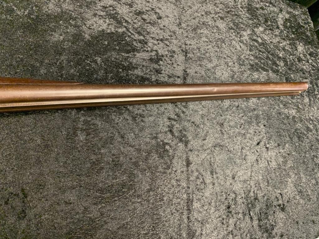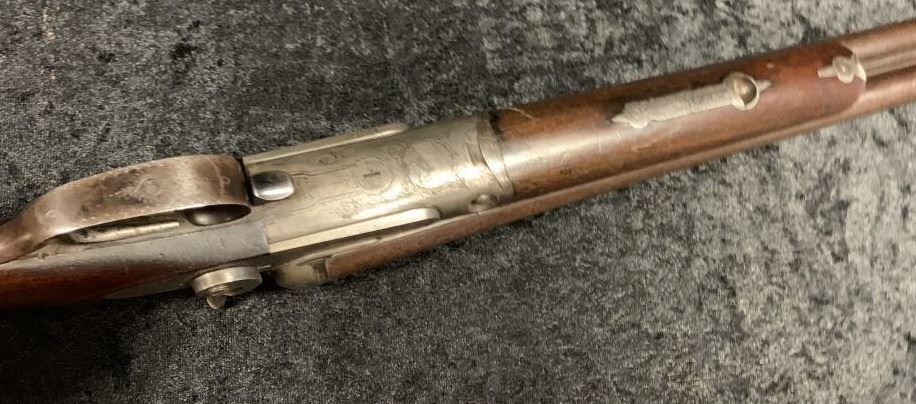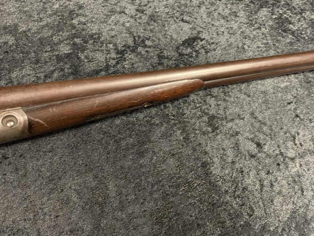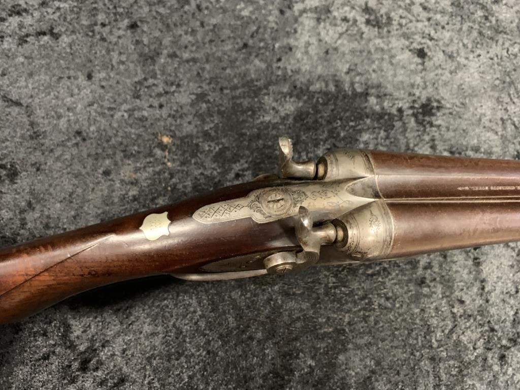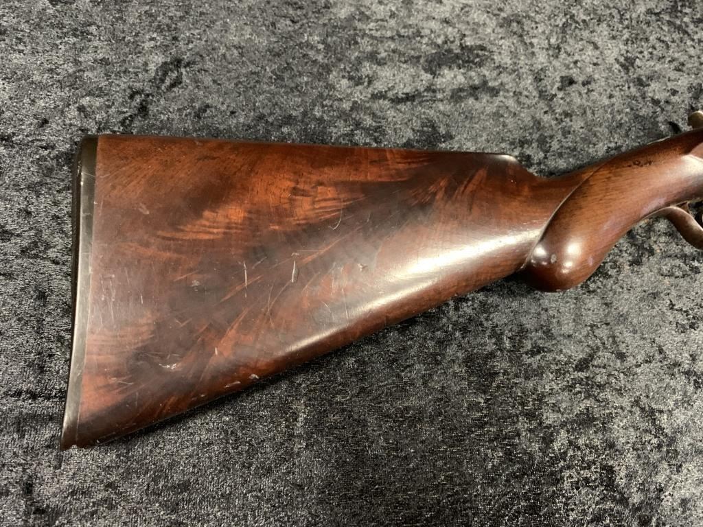 Spectacular special order high grade Parker Bros. under lifter double barrel 12 GA shotgun, S/N 26510 for 1881. 30” damascus barrels. The locks are finely engraved with game birds and lovely script ‘Parker Bros”.The hammers are finely engraved with scrolls. Checkered hammer spurs. The frame is engraved with scrolls and a panel with game bird. The triggerguard is engraved. The screws are finely engraved. 30” barrels withcentral rib and full Parker Bros. address. Silver bead front sight. Special order finely figured deluxe unchecked walnut buttstock with superb grain throughout. Shield thumb piece with owner’s initial “M”. OriginalParker Brothers ‘Dog” gutta percha butt plate. The condition of this 141 year old Parker is remarkable. The locks and frame show little or no wear to engraving and have strong traces of faded casehardening. Thebarrels are not refinished and have much original damascus brown finish. The left barrel with several dents. The bores are bright and shiny with no pitting. The interior parts have some color casehardening.