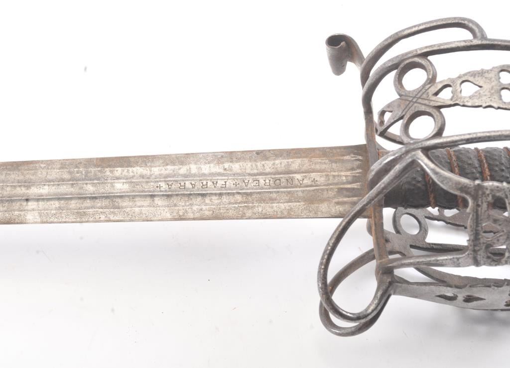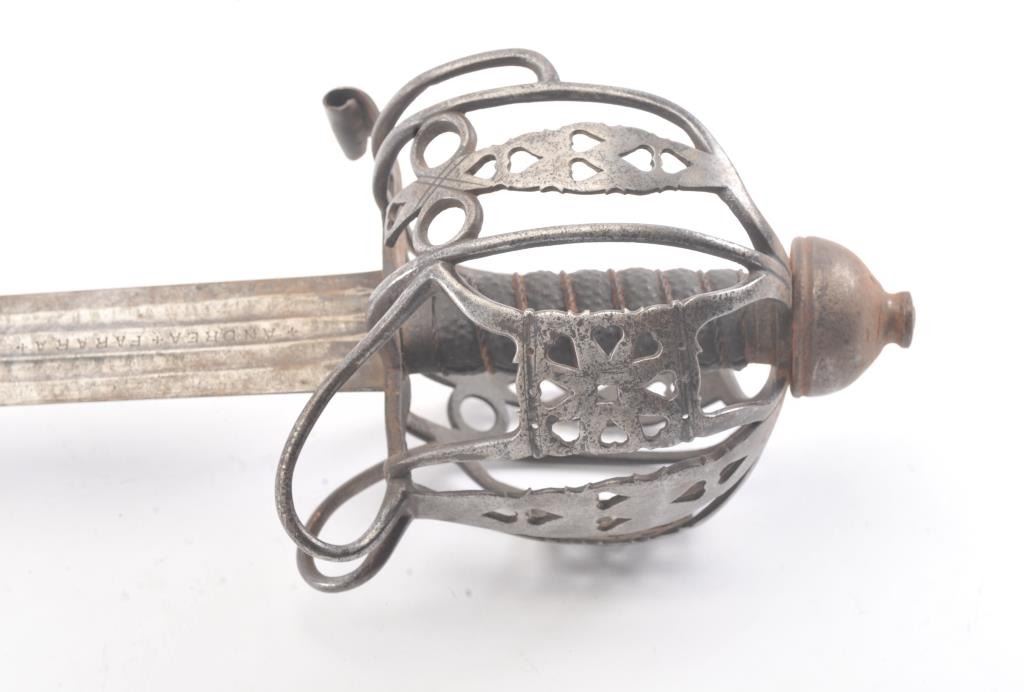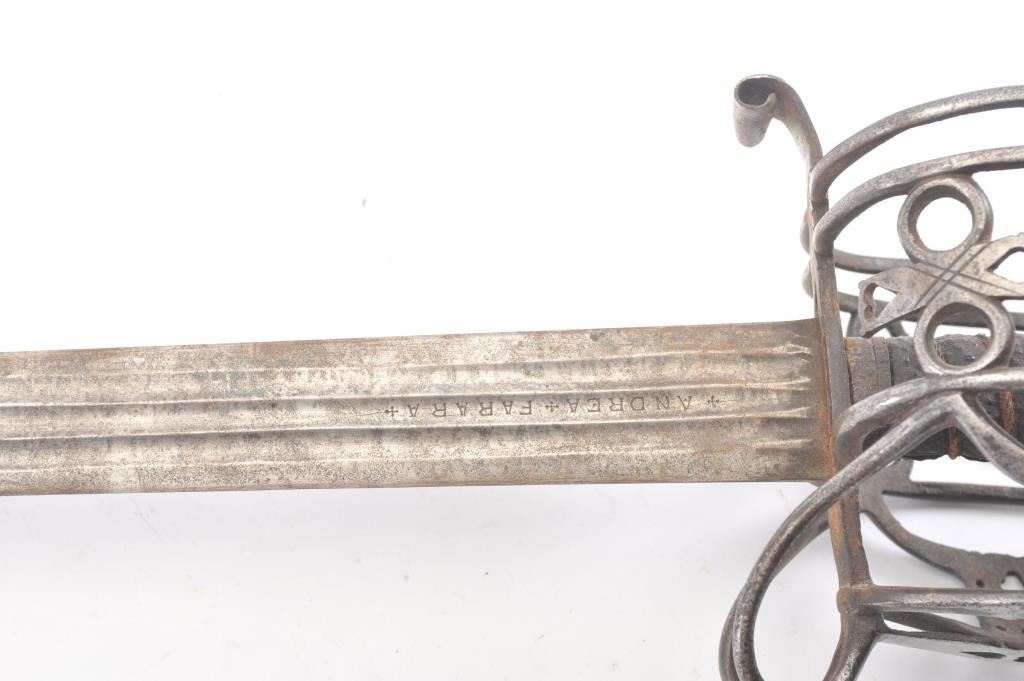 Authentic and good quality basket hilted Scottish broadsword with "Andrea Farara" marked blade from 18th century. Measures 38" overall with a 32" blade. Light to moderate pitting and erosion. Good grip. All correctand matching elements. An exceptional sword. Est.: $2000-$4000