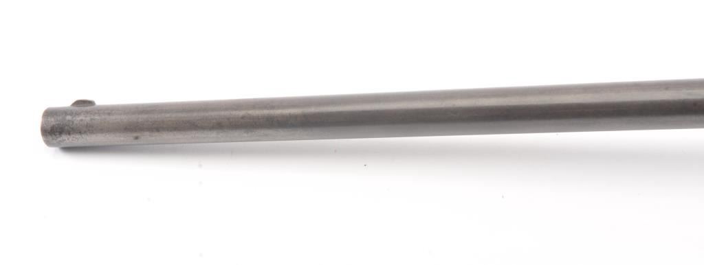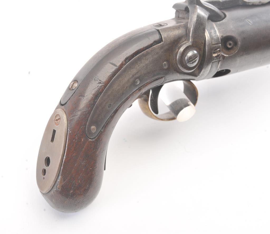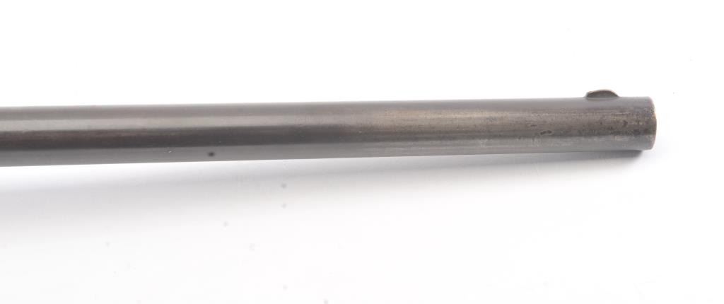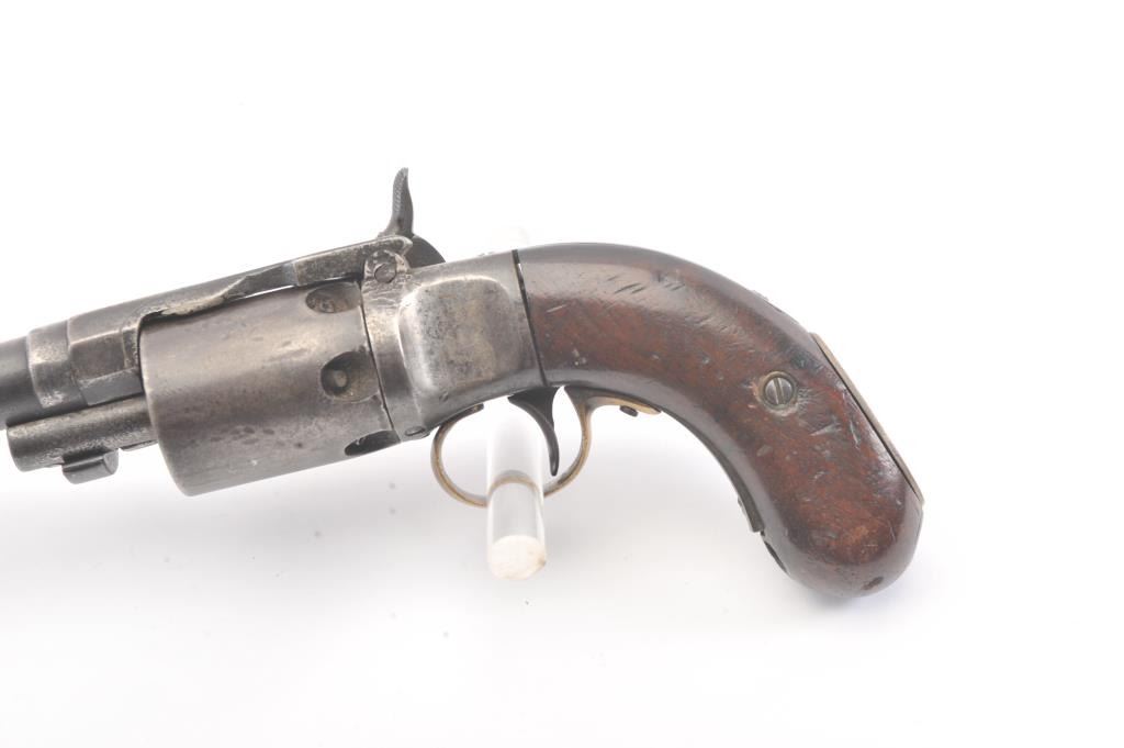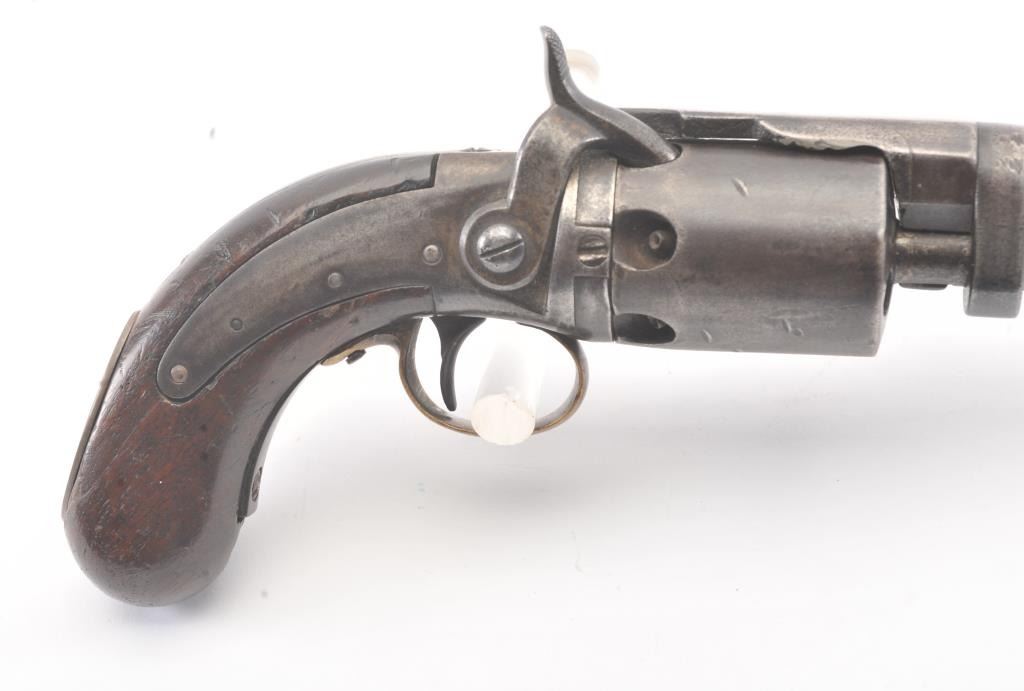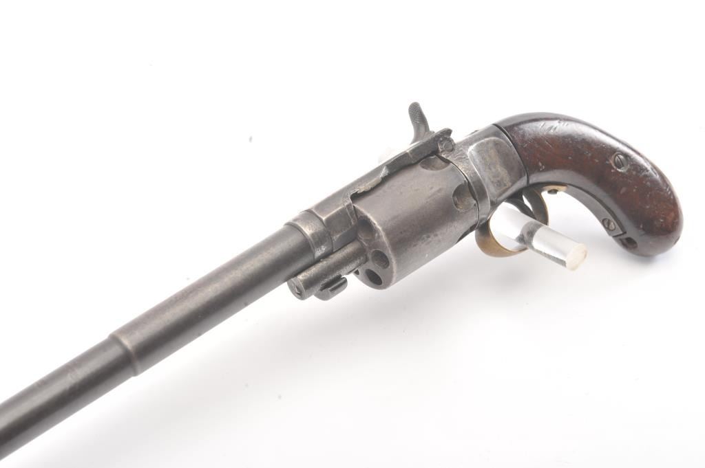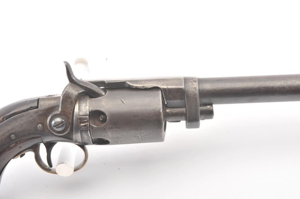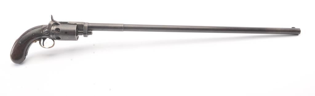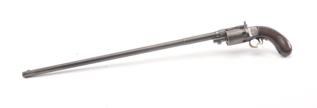 A very rare Wesson & Leavitt detachable stock percussion revolving rifle, 24” barrel and .40 caliber. An extremely rare rifle made by the Massachusetts Arms Company. Made of the frame of the Wesson & Leavitt “Army” sizerevolver Flayderman states “Quantity made estimated at less than 50 and very probably less than 20”. Her further states “Although detachable shoulder stocks reported”. The ones he saw were “made as one piece with noprovision for removing”. Our example is clearly designed for a shoulder stock which is missing. This is one of the rarest of all revolving rifles and has the longest barrel found on the Wesson & Leavitt. Conditionoverall is good with an attractive smooth patina and only minor pitting. The walnut grips with bruises. All original with good action. Est.: $2500-$5000