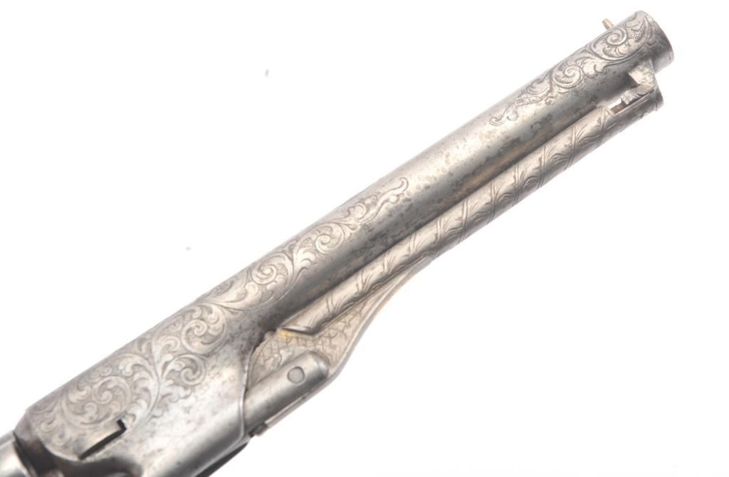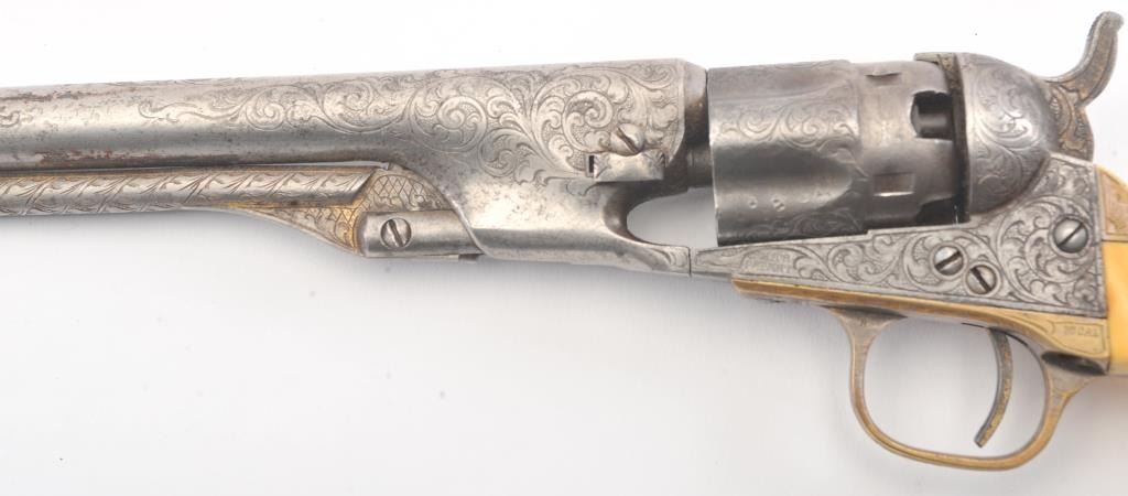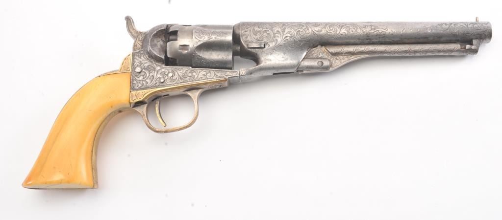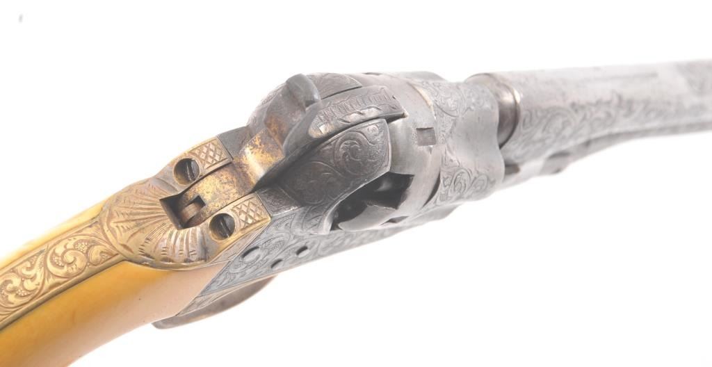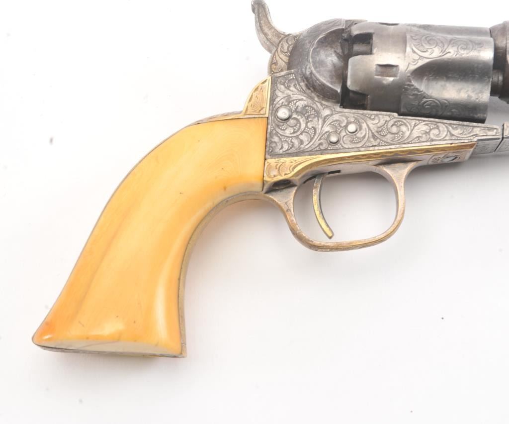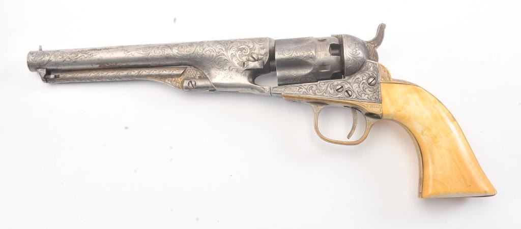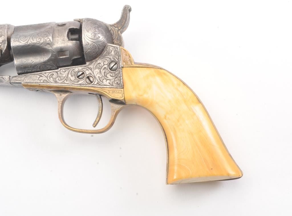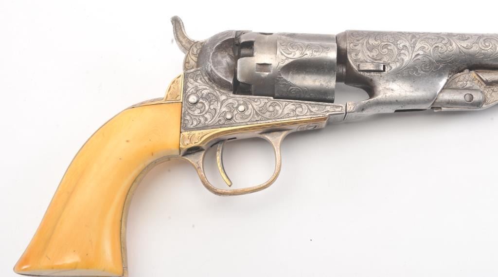 Colt 1862 Police Percussion Revolver in .36 caliber with a 6 1/2" barrel, fully and finely New York engraved in L.D. Nimschke style, silver and gold plated, ivory grips, and in period partition style case with accessories. The engraving is more deluxe than standard with full engraved ramrod and muzzle engraving almost touching the barrel engraving along with engraving on to of the barrel. 20%-30% dulled silver that is not polished and strong traces of gold on the rammer. Good markings. The grips are nicely aged and very good plus with minor cracking (original to this Colt). The frame and barrel are numbered 34969 and the back strap and trigger guard numbered 38084. Possibly mixed by engraver or factory as pistol was engraved ensuite and always been together in our opinion. The velveteen lined partition case is about 1 1/2" longer than normal possibly for skin cartridges as found in late percussion Colt cases. The flask, mold and cap tin included. The interior is good to very good and original to the period. The exterior is also very good with minor scratches in finish and normal aging. A very deluxe '62 police. (Antique) Est.: $2000-$4000+