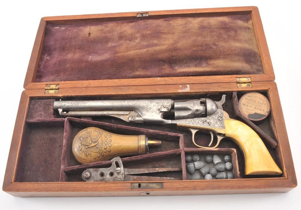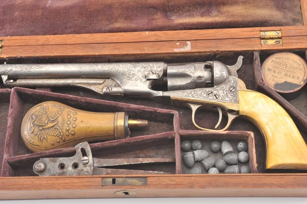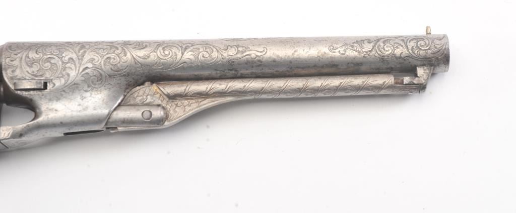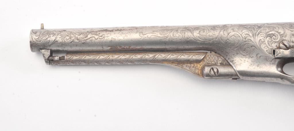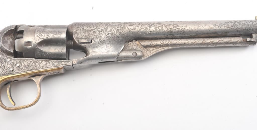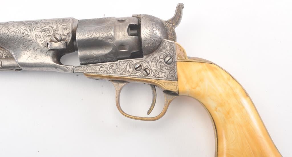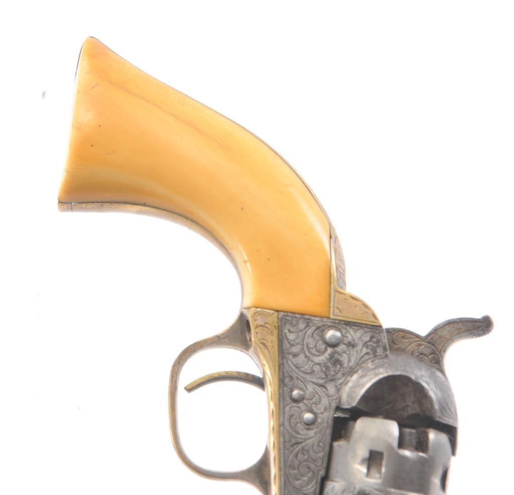 Colt 1862 Police Percussion Revolver in .36 caliber with a 6 1/2" barrel, fully and finely New York engraved in L.D. Nimschke style, silver and gold plated, ivory grips, and in period partition style case with accessories. The engraving is more deluxe than standard with full engraved ramrod and muzzle engraving almost touching the barrel engraving along with engraving on to of the barrel. 20%-30% dulled silver that is not polished and strong traces of gold on the rammer. Good markings. The grips are nicely aged and very good plus with minor cracking (original to this Colt). The frame and barrel are numbered 34969 and the back strap and trigger guard numbered 38084. Possibly mixed by engraver or factory as pistol was engraved ensuite and always been together in our opinion. The velveteen lined partition case is about 1 1/2" longer than normal possibly for skin cartridges as found in late percussion Colt cases. The flask, mold and cap tin included. The interior is good to very good and original to the period. The exterior is also very good with minor scratches in finish and normal aging. A very deluxe '62 police. (Antique) Est.: $2000-$4000+