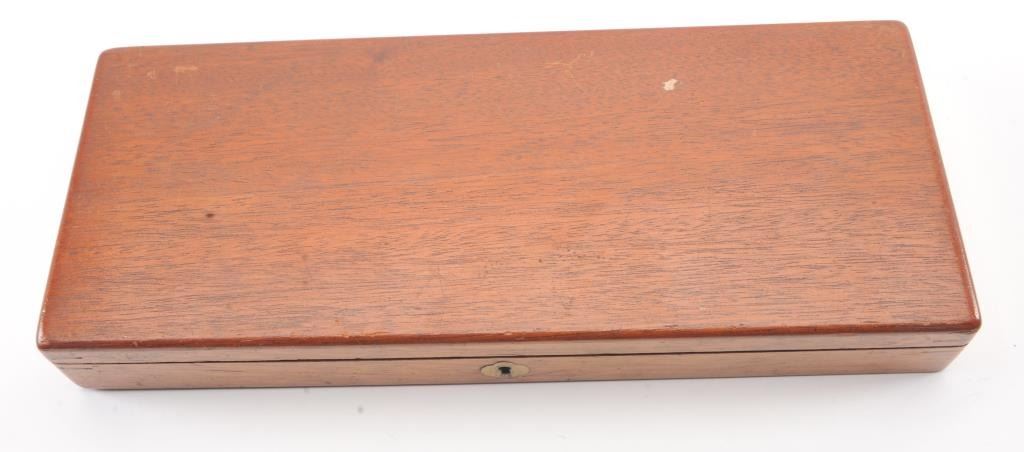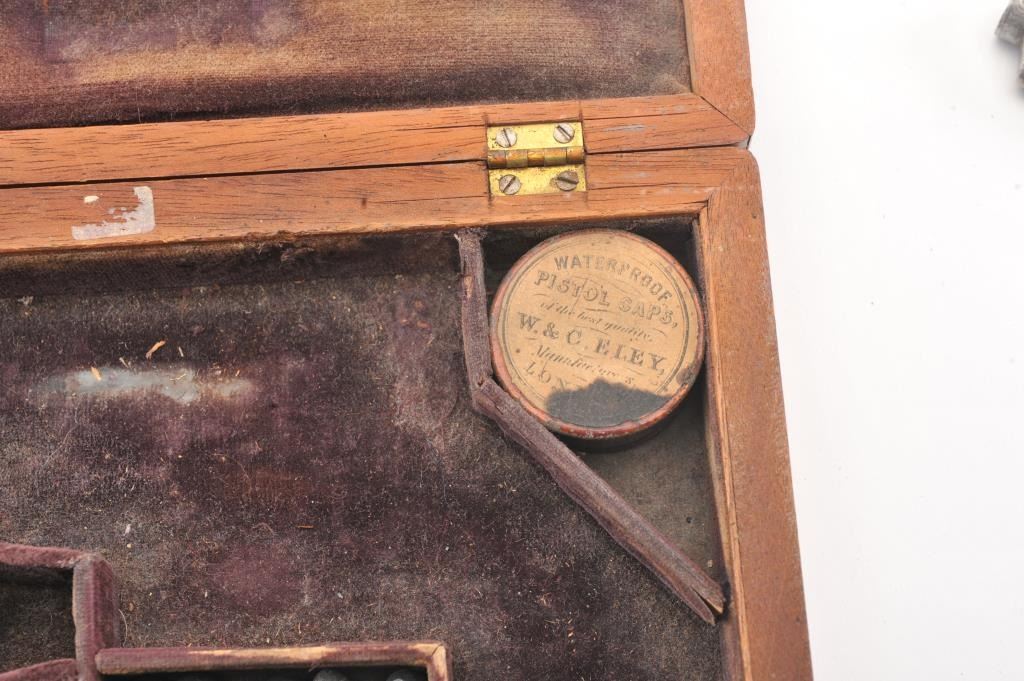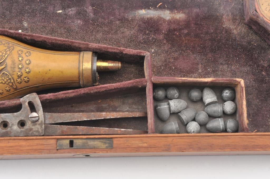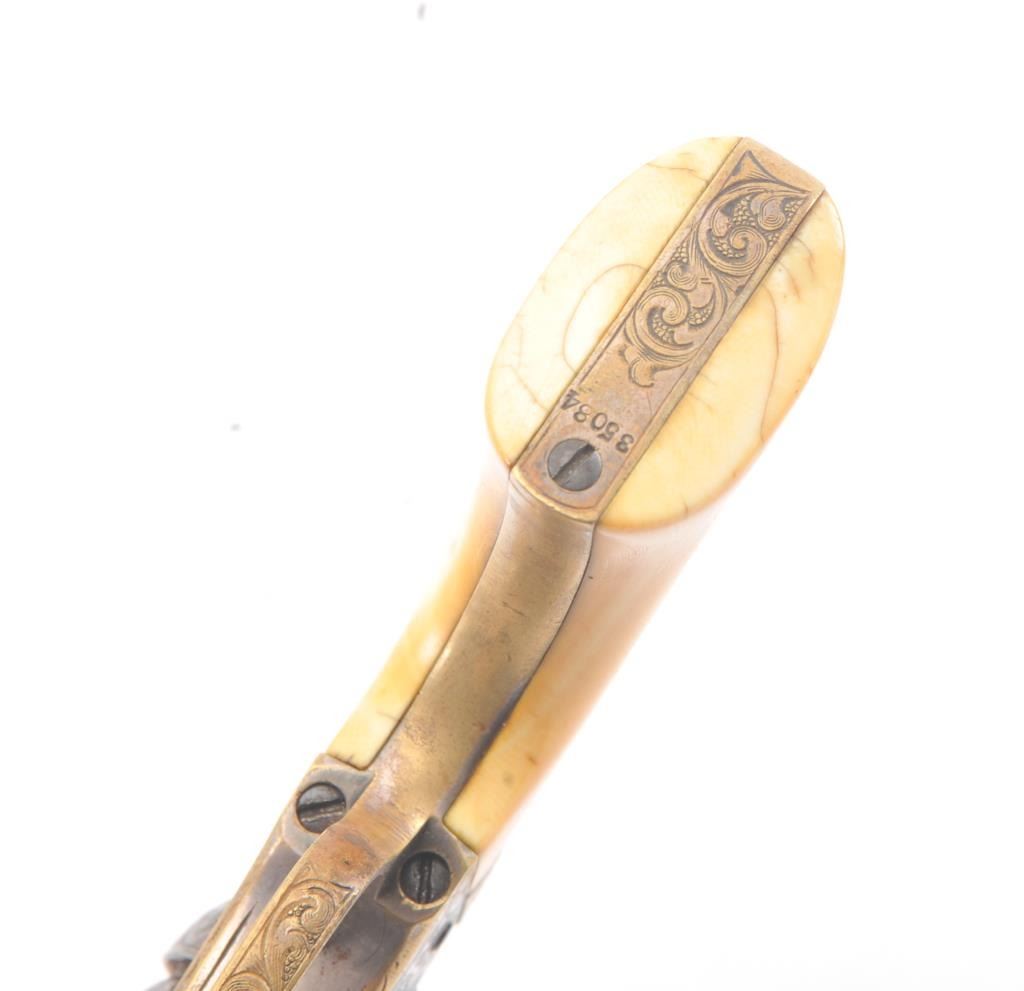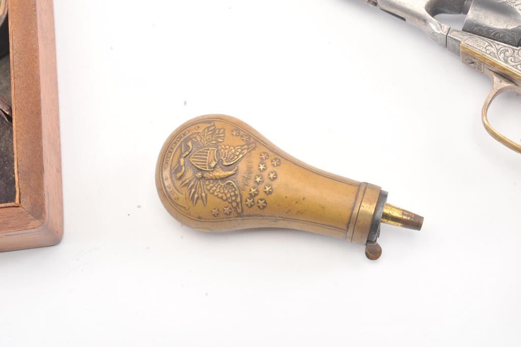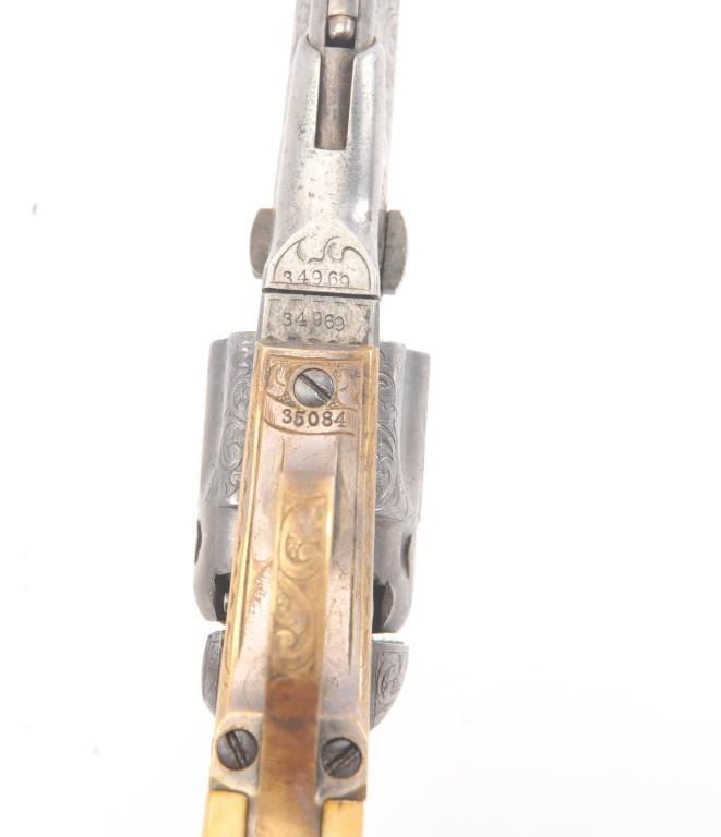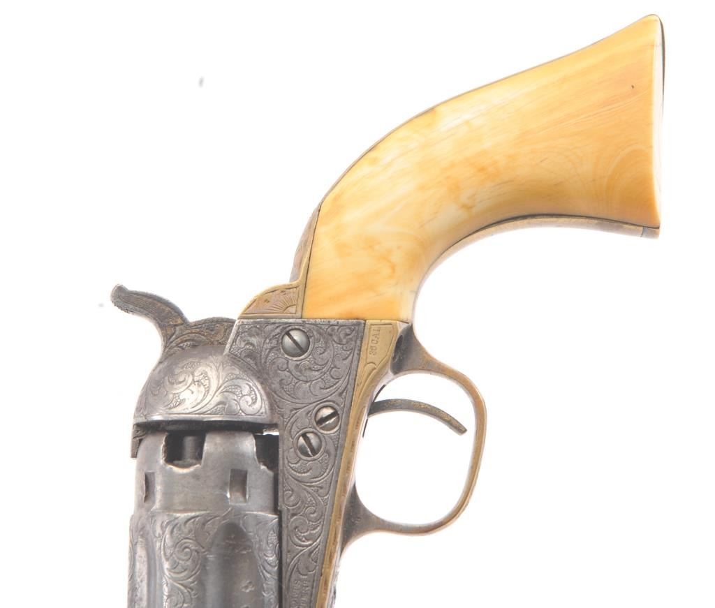 Colt 1862 Police Percussion Revolver in .36 caliber with a 6 1/2" barrel, fully and finely New York engraved in L.D. Nimschke style, silver and gold plated, ivory grips, and in period partition style case with accessories. The engraving is more deluxe than standard with full engraved ramrod and muzzle engraving almost touching the barrel engraving along with engraving on to of the barrel. 20%-30% dulled silver that is not polished and strong traces of gold on the rammer. Good markings. The grips are nicely aged and very good plus with minor cracking (original to this Colt). The frame and barrel are numbered 34969 and the back strap and trigger guard numbered 38084. Possibly mixed by engraver or factory as pistol was engraved ensuite and always been together in our opinion. The velveteen lined partition case is about 1 1/2" longer than normal possibly for skin cartridges as found in late percussion Colt cases. The flask, mold and cap tin included. The interior is good to very good and original to the period. The exterior is also very good with minor scratches in finish and normal aging. A very deluxe '62 police. (Antique) Est.: $2000-$4000+