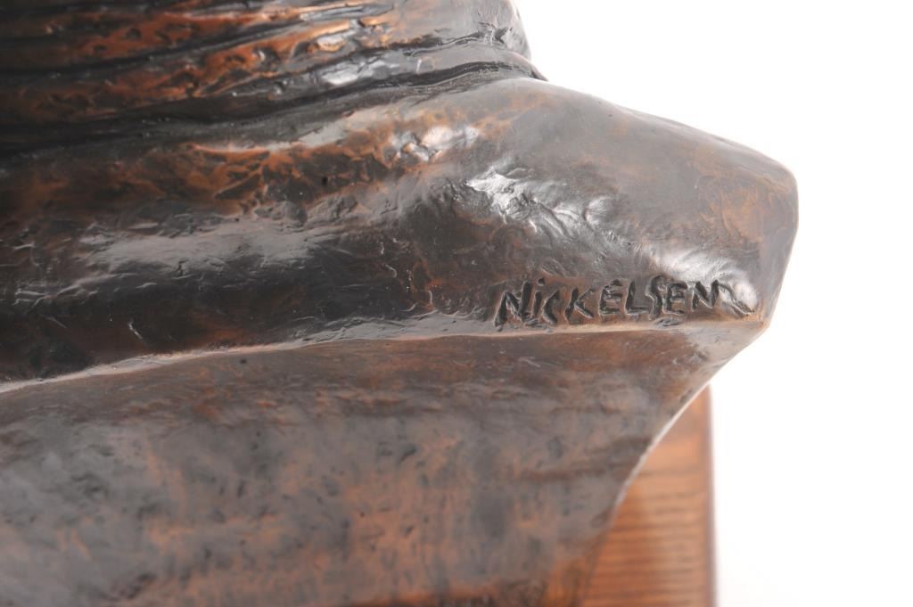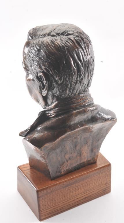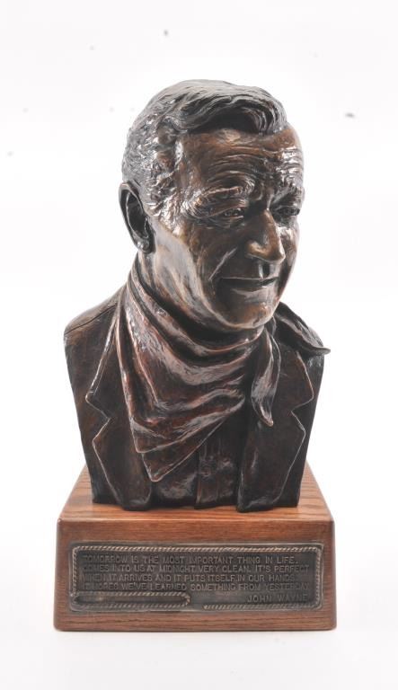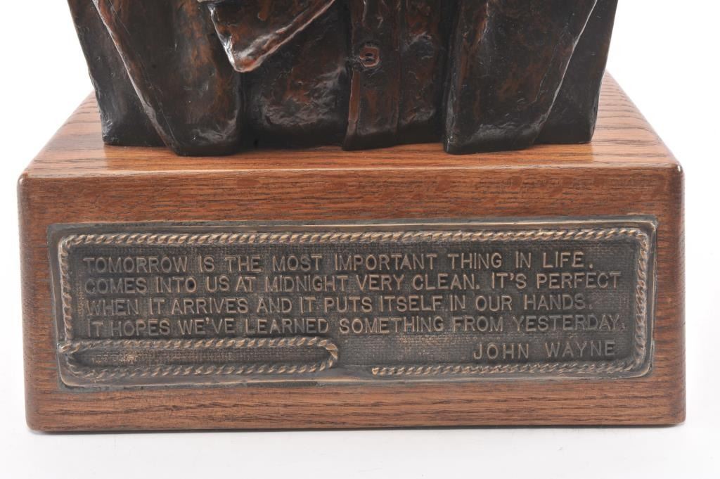 Original bronze casting of John Wayne signed Nickelsen and Copyright Wayne Enterprises 1980. The bronze is numbered 26/152 with a certificate. The piece was issued by the Wayne Family and sold by the Spirit ofAmerica Galleries/Beverly Hills (Michael Wayne-Principal). The piece had an original cost of over $10,000. The bust is approximately 16 ½” in height and 21 ½” including the base. The bronze plaque on the base reads, “TOMORROW IS THE MOST IMPORTANT THING IN LIFE. COMES INTO US AT MIDNIGHT VERY CLEAN. IT'S PERFECT WHEN IT ARRIVES AND IT PUTS ITSELF IN OUR HANDS. IT HOPES WE'VE LEARNEDSOMETHING FROM YESTERDAY.” JOHN WAYNE Copies of this bust have been gifted to President Ronald Reagan for the oval office, to the University of Southern California Trophy Room and the Smithsonian Institution. Est.: $3,500-$7,000.