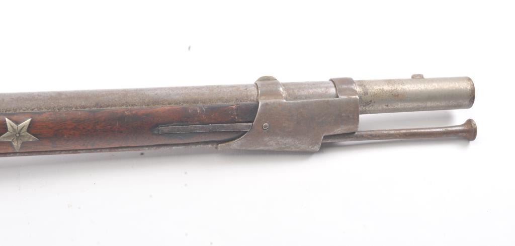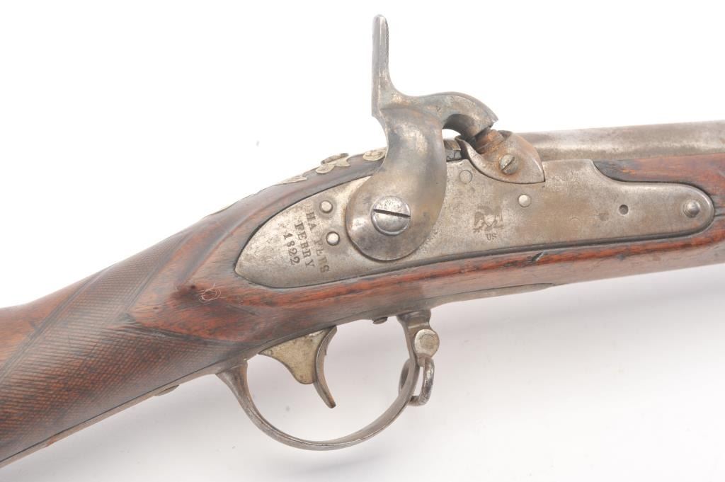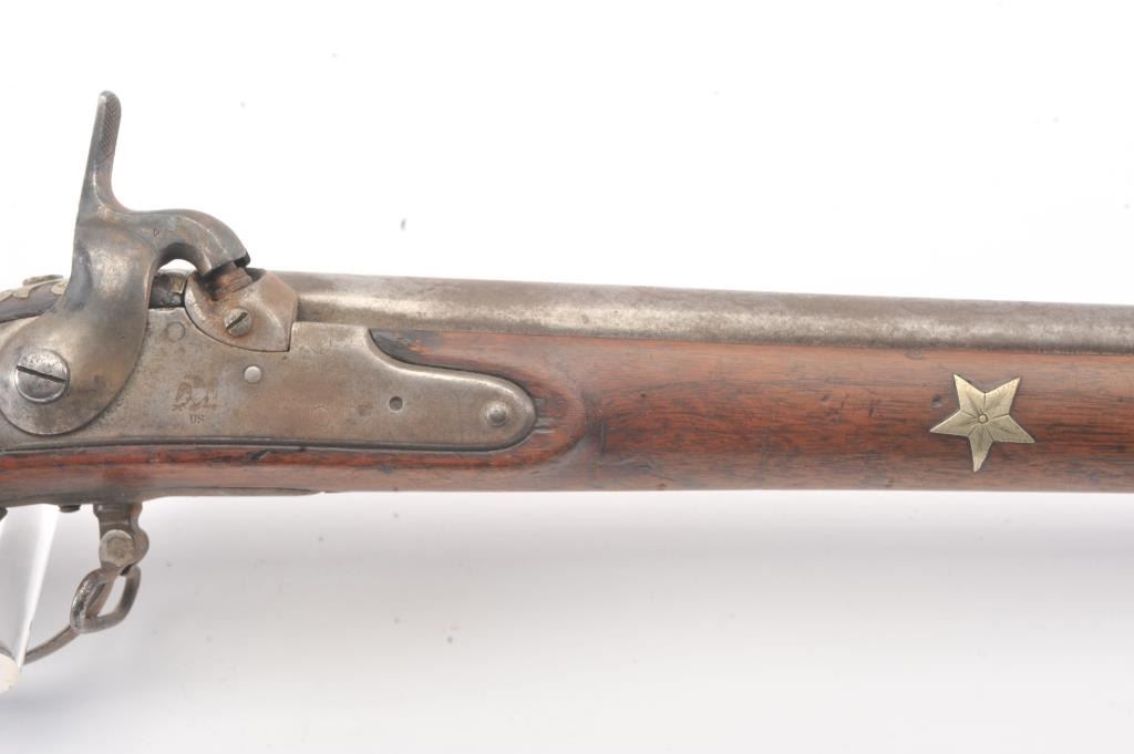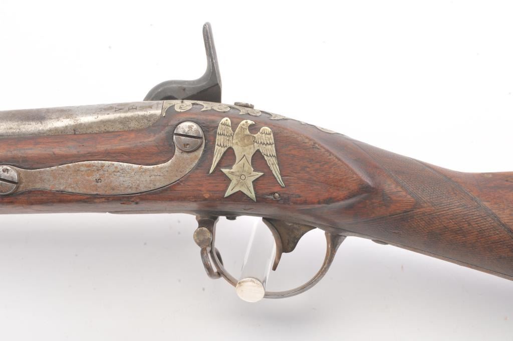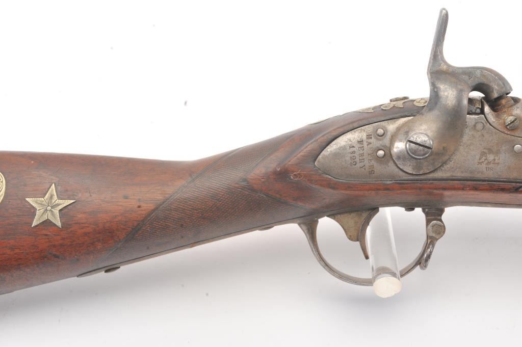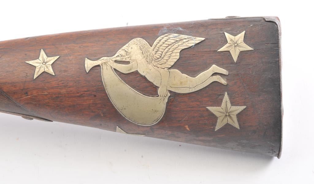 U.S. Model 1816 Musket dated 1822 with authentic German silver presentation inlays of the type presented by congress. The barrel is period script engraved "Bernard Von (Herk, Hork or Heck)" not quite discernable.Along with scroll engraving. Inlays of stars, banners, angel with horn, eagle and star. Good Harper's Ferry lock markings. Good overall with gray patina and light rust. The wood is good plus with minor losses. Aknowledgeable old collector theorized a shooting prize as no engraved presentations on the plaques. (Antique) Est.: $1500-$3000