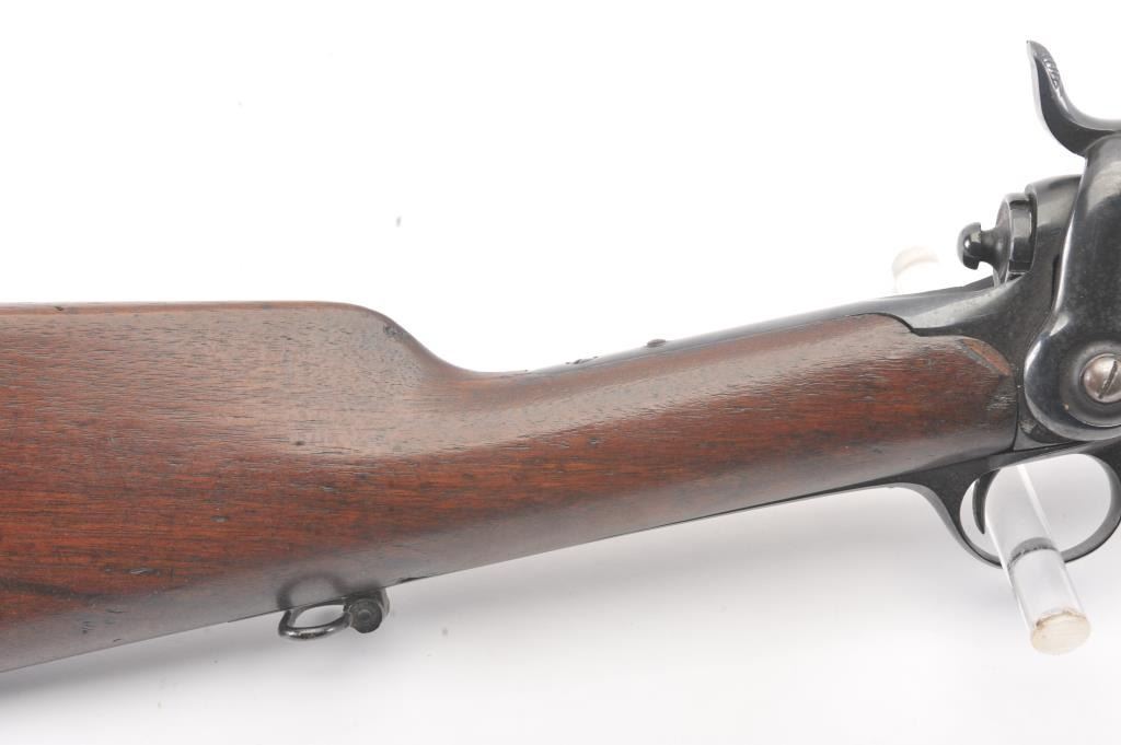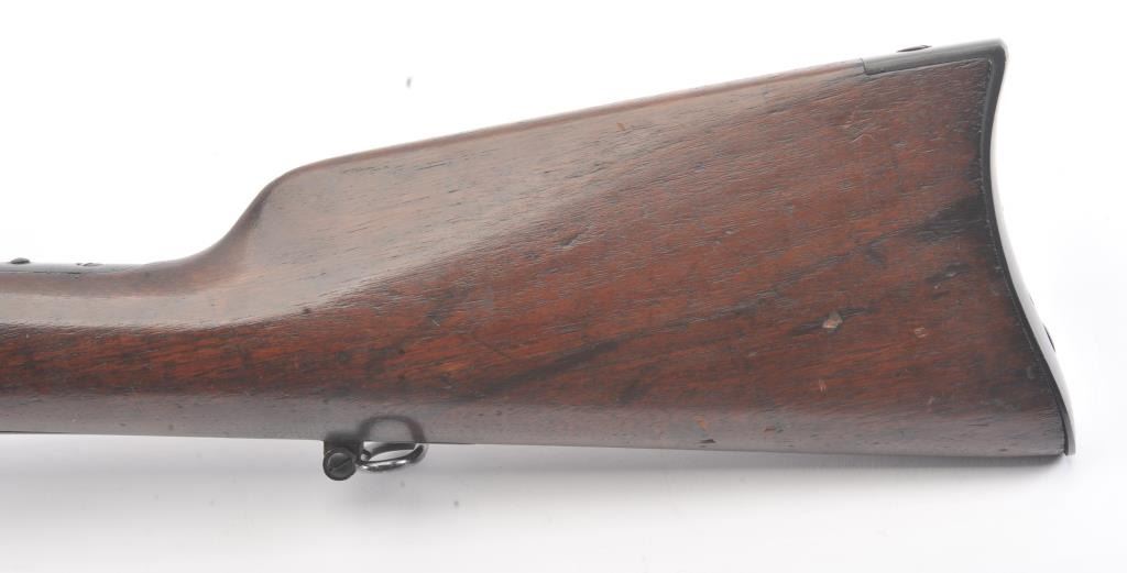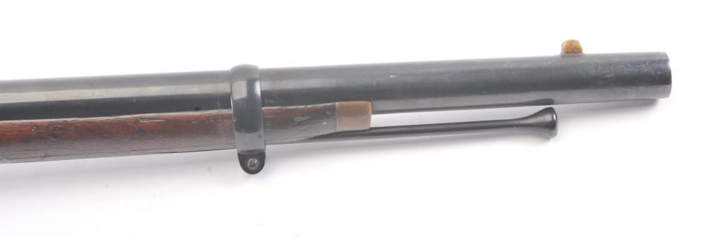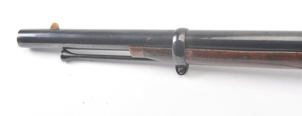 Colt Model 1855 Military style musket with a 31” barrel in .56 caliber showing an old re-blued finish with serial number visible and markings are mostly removed other than patent markings in sight groove on top of the frame. The stocks are good. The action is good and the bore is shiny. An older restoration with a pleasing color and a correct ramrod. (Antique) Est.: $2000-$4000