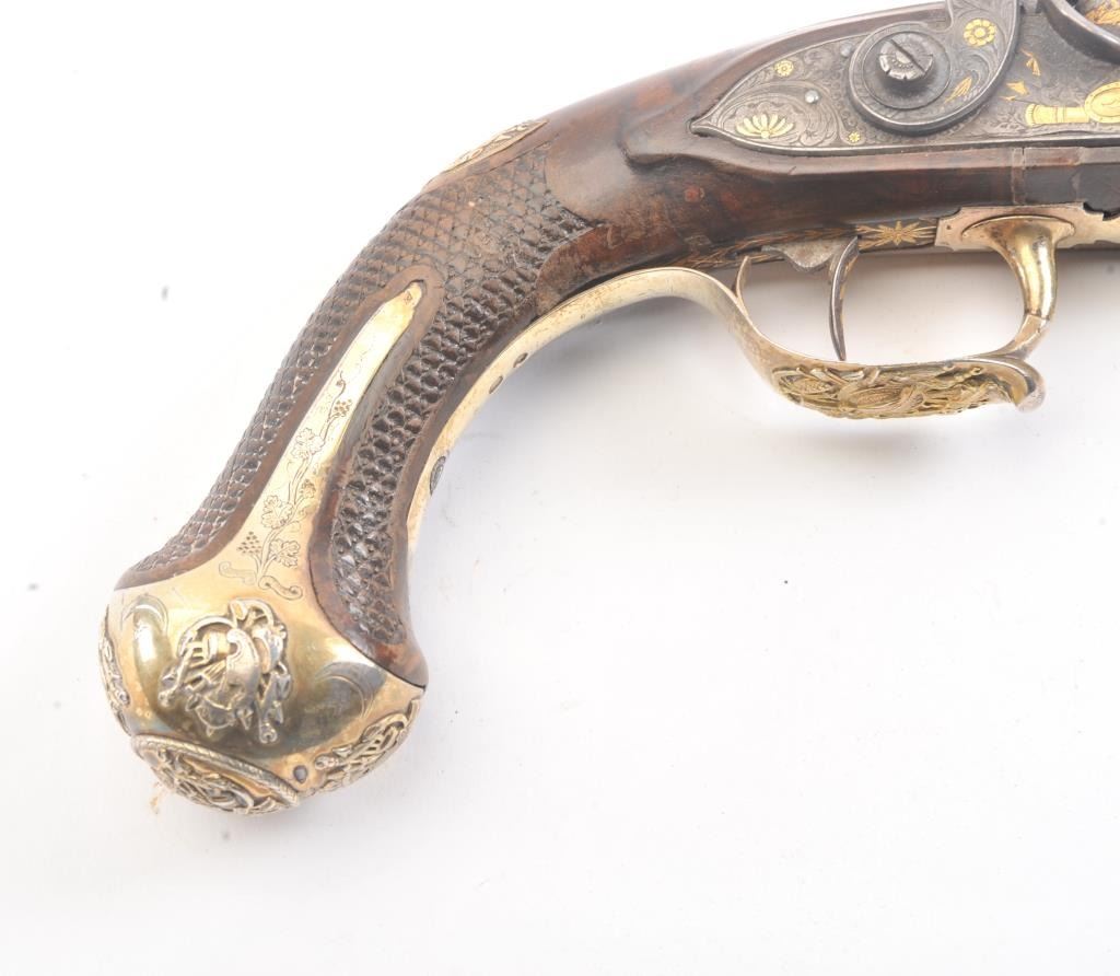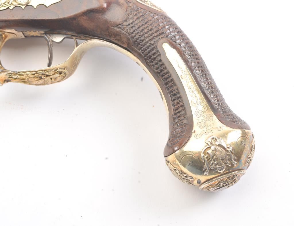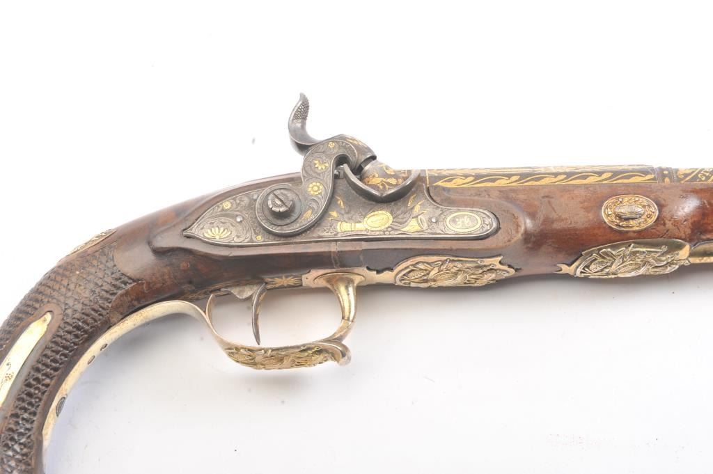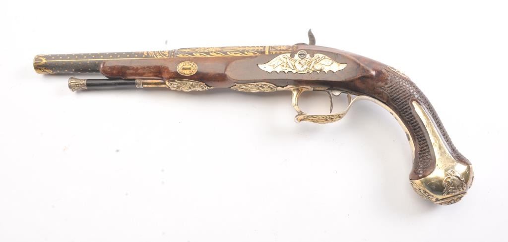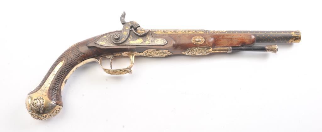 High Art French Empire style pistol converted from flintlock to percussion signed “Fatou a Paris” on the barrel. Superb cast and chased silver mounts with relief scenes of arms that are finely detailed. The barrel showsstars and scrolls with stands of arms. Fish scale checkered wood stock in good condition. .63 caliber smoothbore barrel. Measures 16” overall with a 9 ¾” barrel. Converted from flintlock to percussion with hammer andbolster beautifully matched to engraving motifs probably by Fatou himself. The frizzen spring area and tang show 2 characters in Arabic and it is our opinion that this pistol was made for continental consumption butconverted and sold on Mid-East market after fall of Napoleonic when customers were few and far between in France. A stunning pistol by a great maker with superb hall marked best French Mounts!! Est.: $2500-$5000