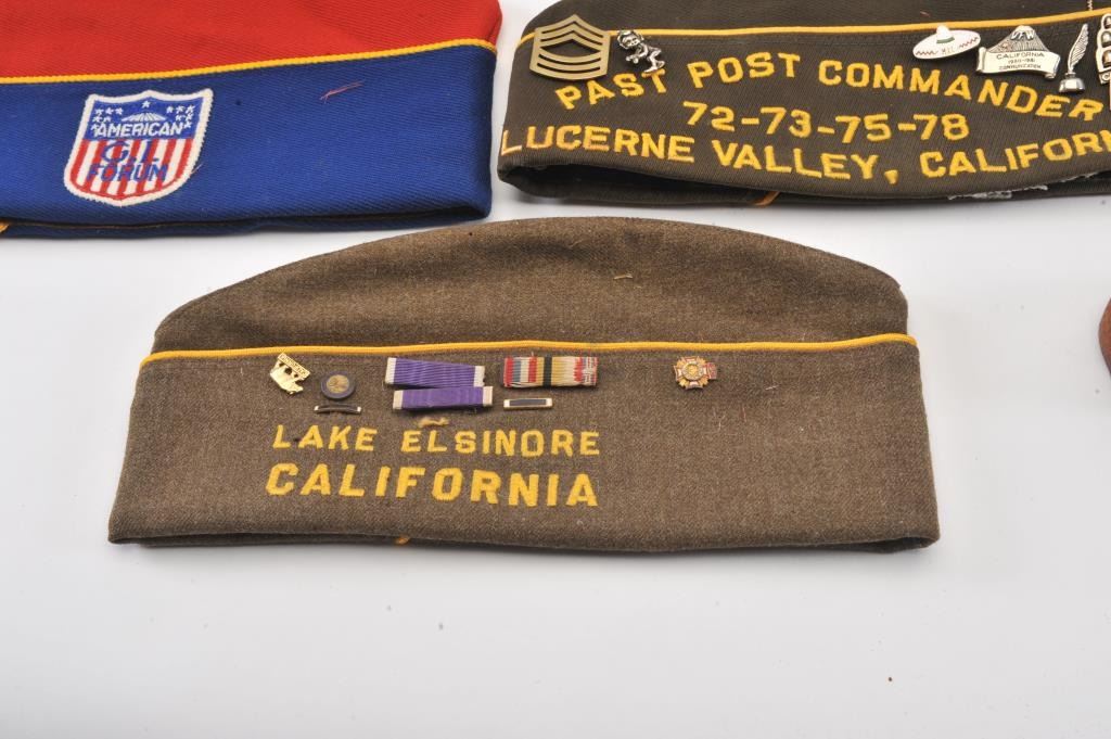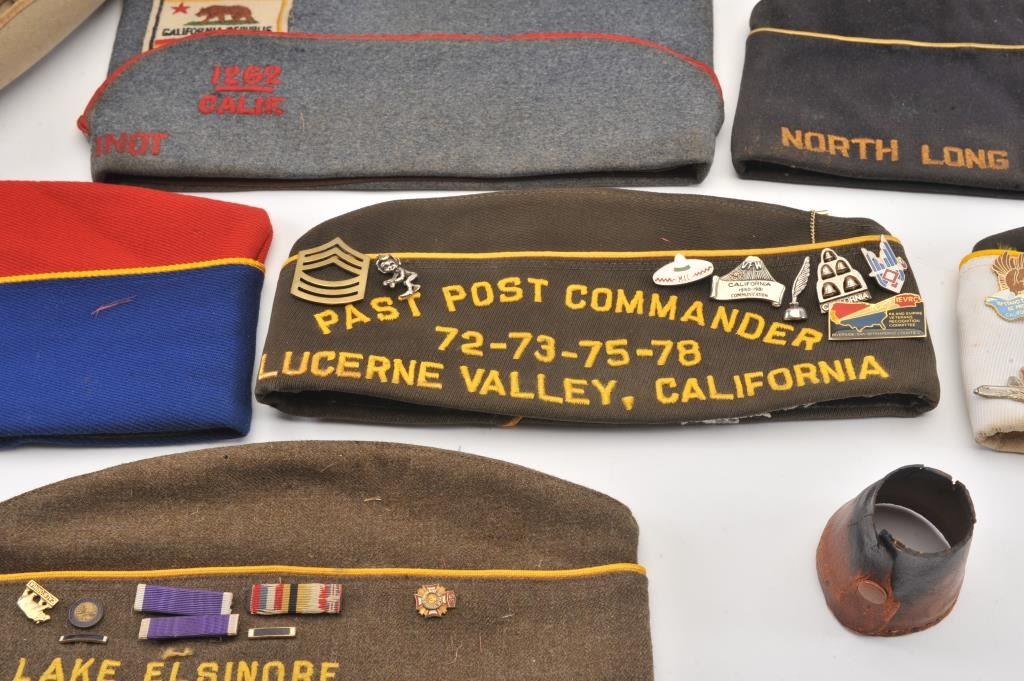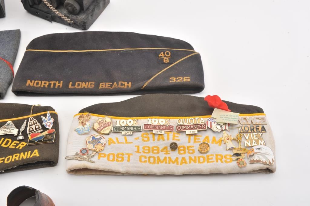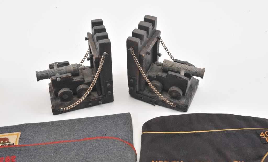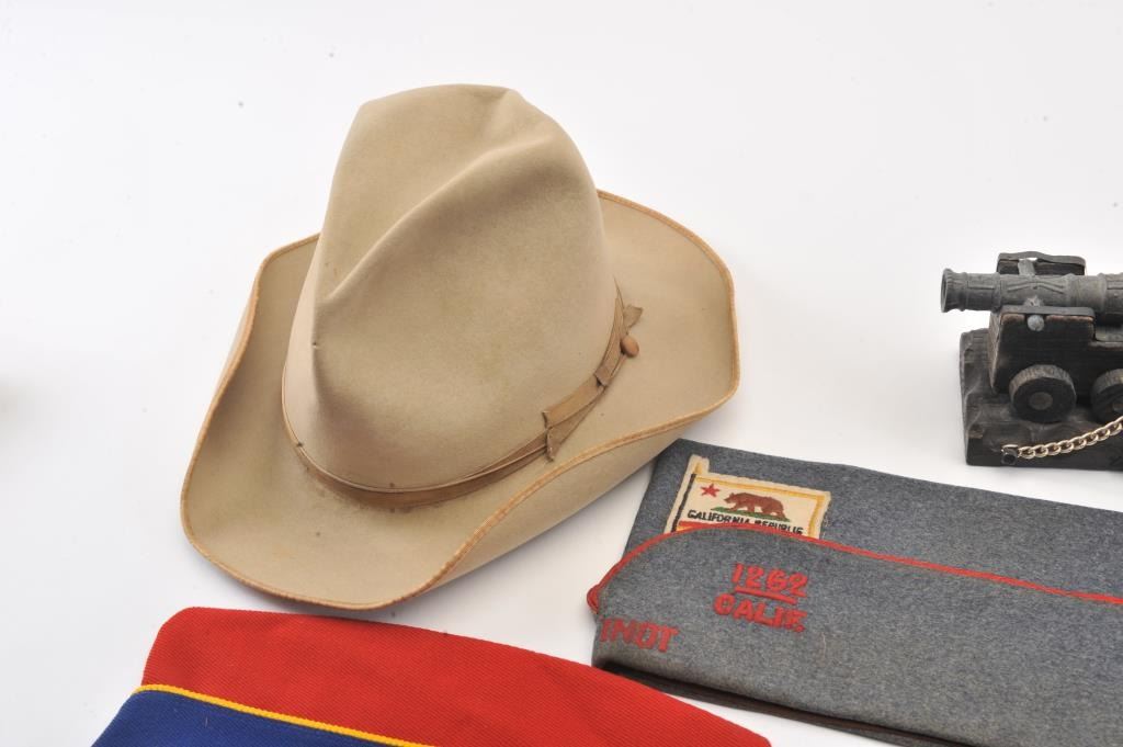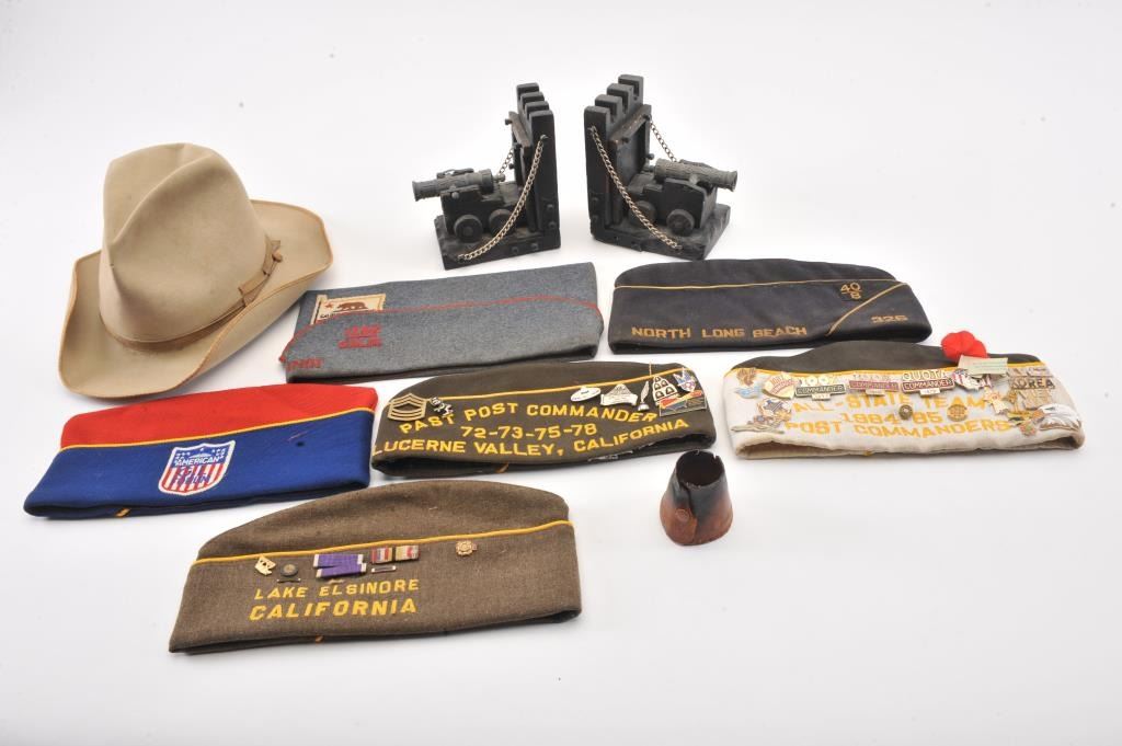 Lot of smalls from the estate of an Apple Valley veteran including toy cannon bookends, a Stetson Cowboy hat and 6 U.S. Veteran’s Post soft caps, some with ID pins. Est.: $150-$300.