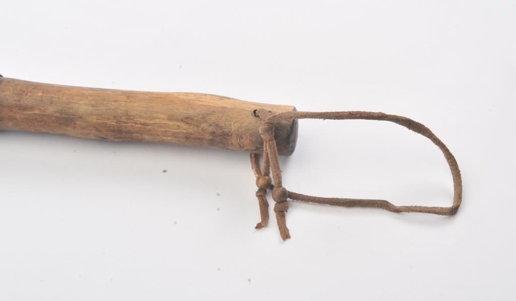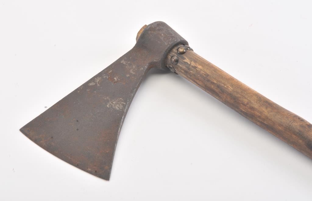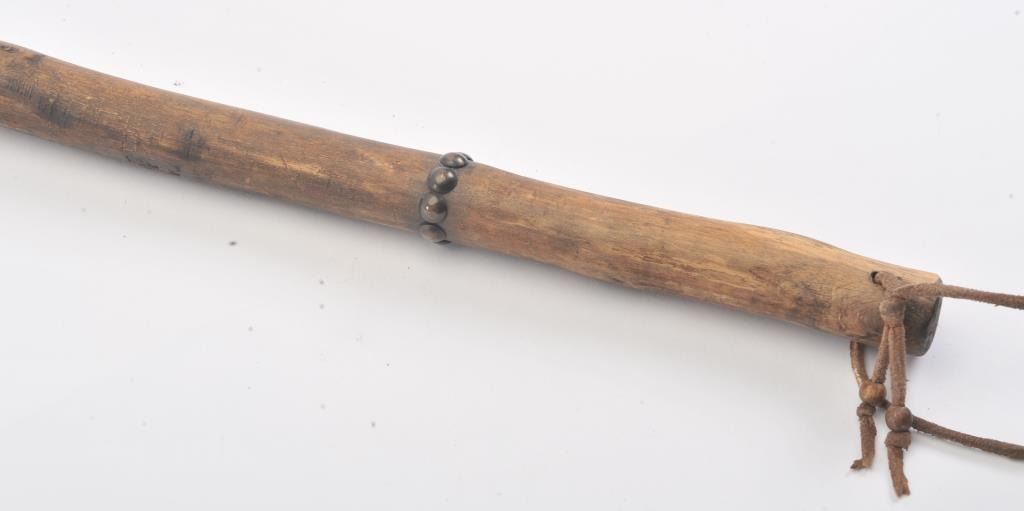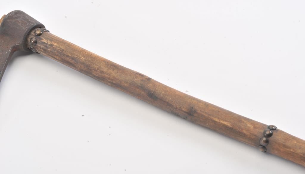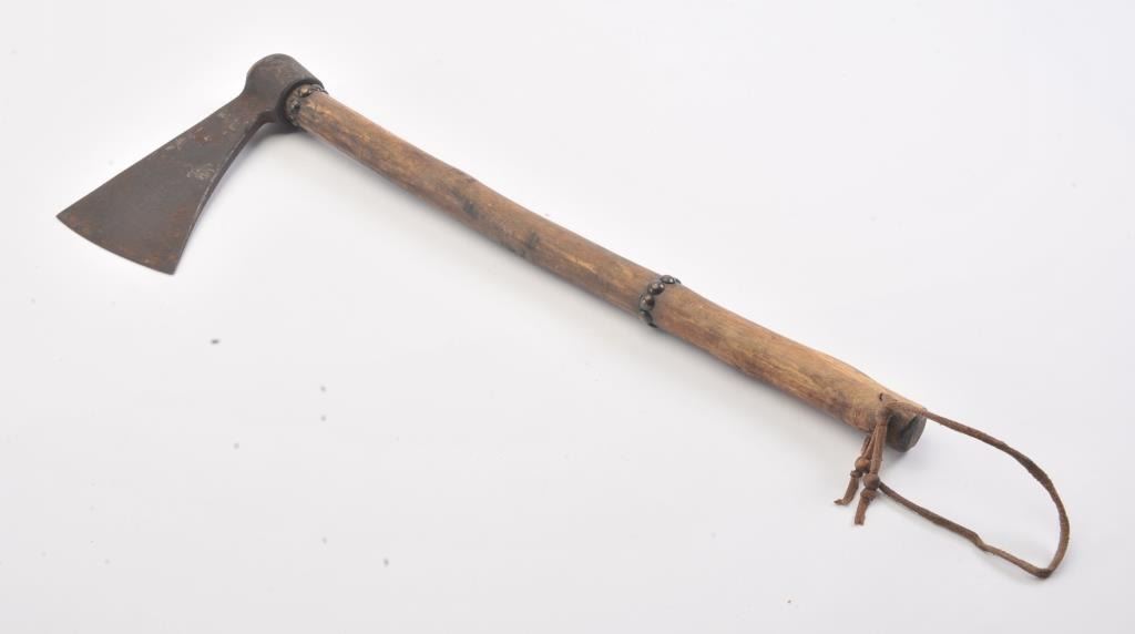 Vintage iron Indian axe, approximately 7.5” overall, well-used and un-cleaned, stamped on left side of blade “FERFOR/NO 2”; replaced wood shaft decorated with brass tacks. Est.: $300-$600.