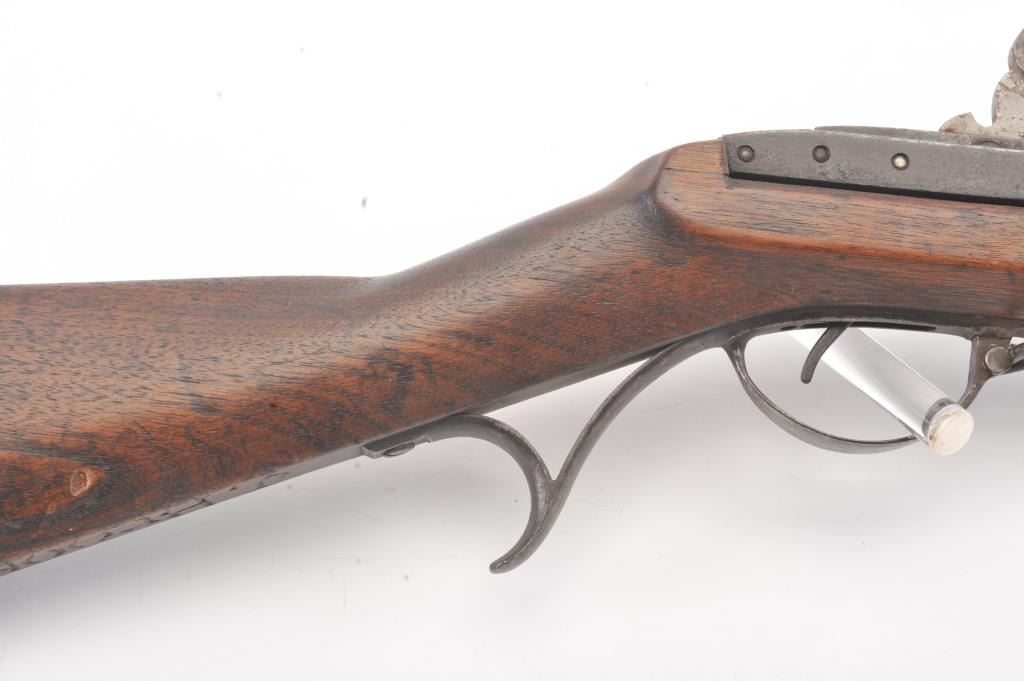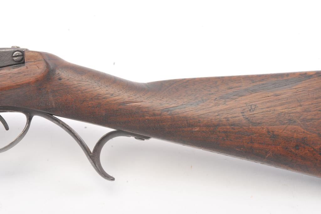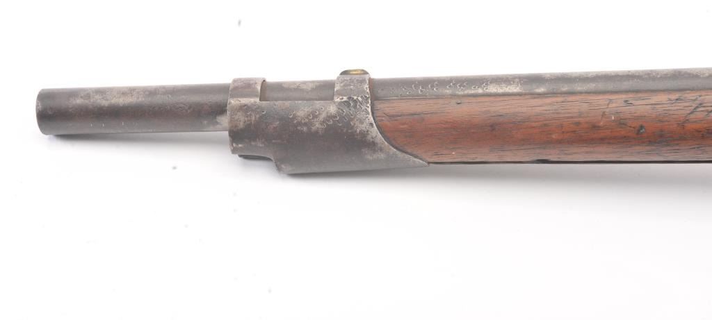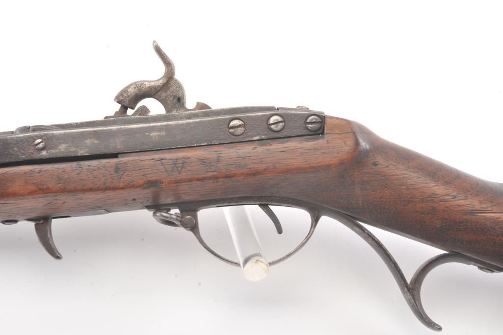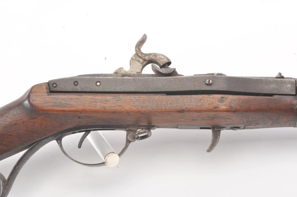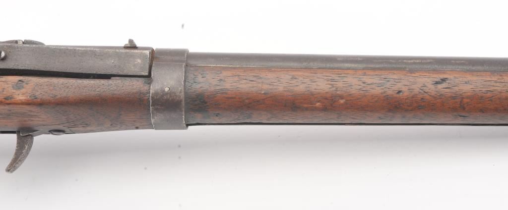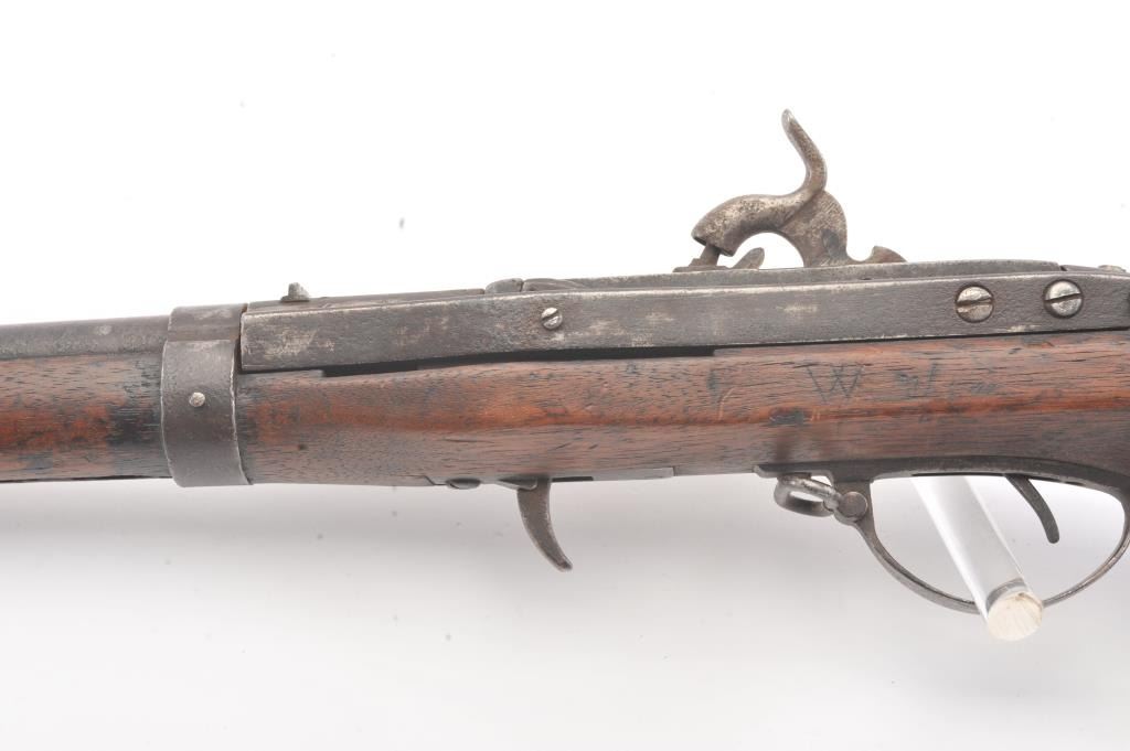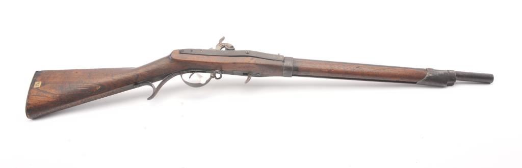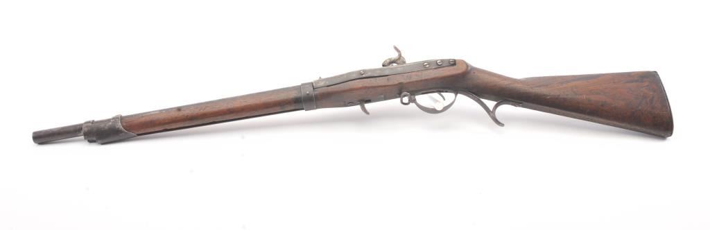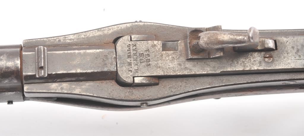 U.S. issue Hall patent breach loading carbine by Harper's Ferry Arsenal dated 1851 on the block. The barrel measures 21" overall in .52 caliber smoothbore. (Refer Flayderman 9-A-277 1 of 10,500 produced). The stock isperiod soldier carved in block letters "J. Brooks 22 Iowa IN" and "W" (Illegible) below left side of the action. Missing rod. Fair to good uncleaned as found condition. Some pitting and normal imperfections. Carving is"Drop dead real!". (Antique) Est.: $1500-$3000
