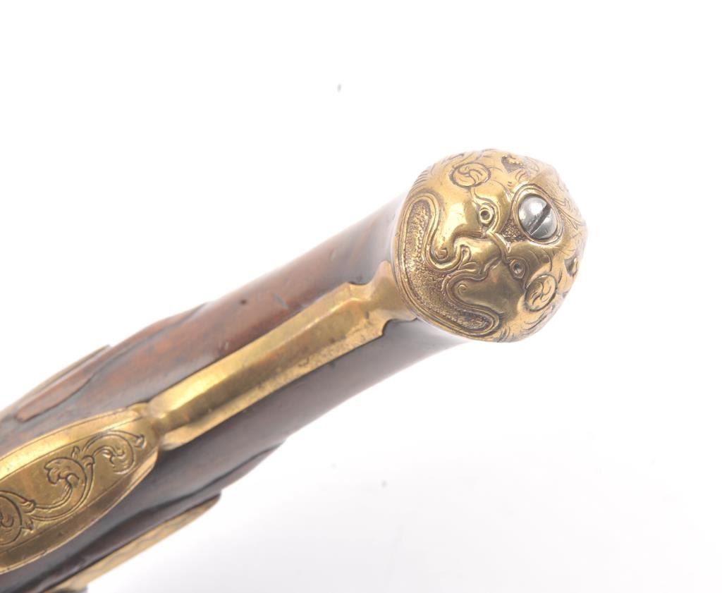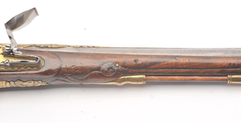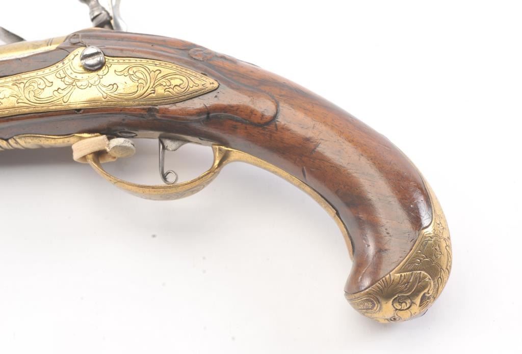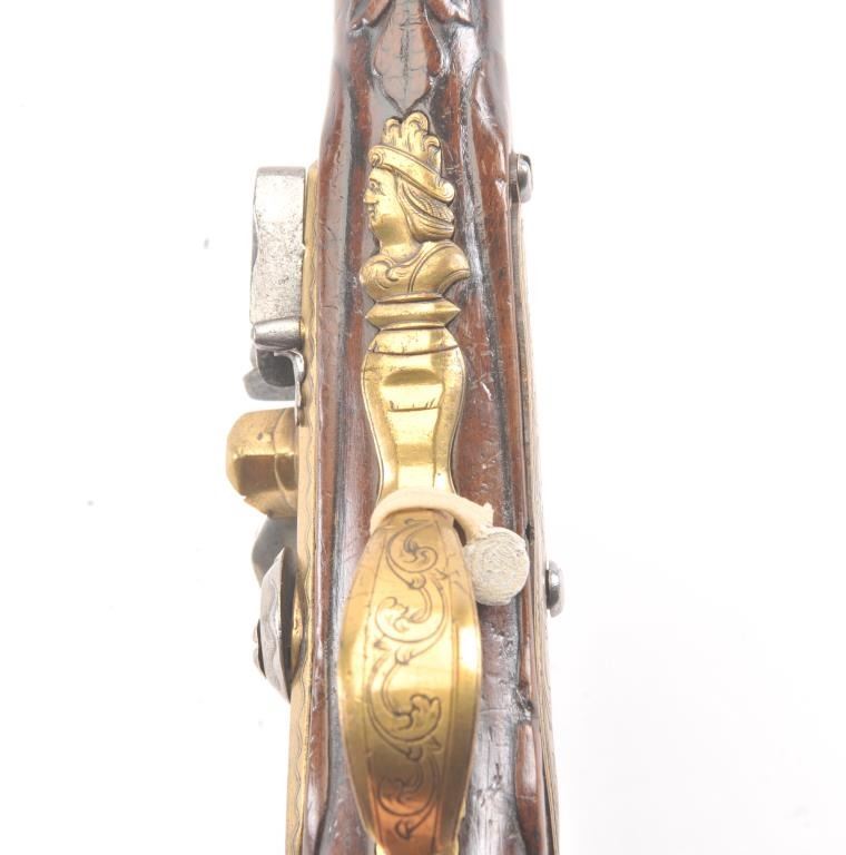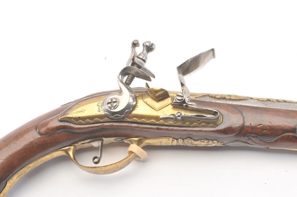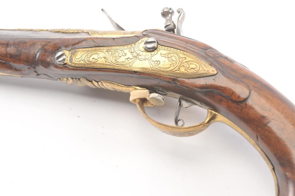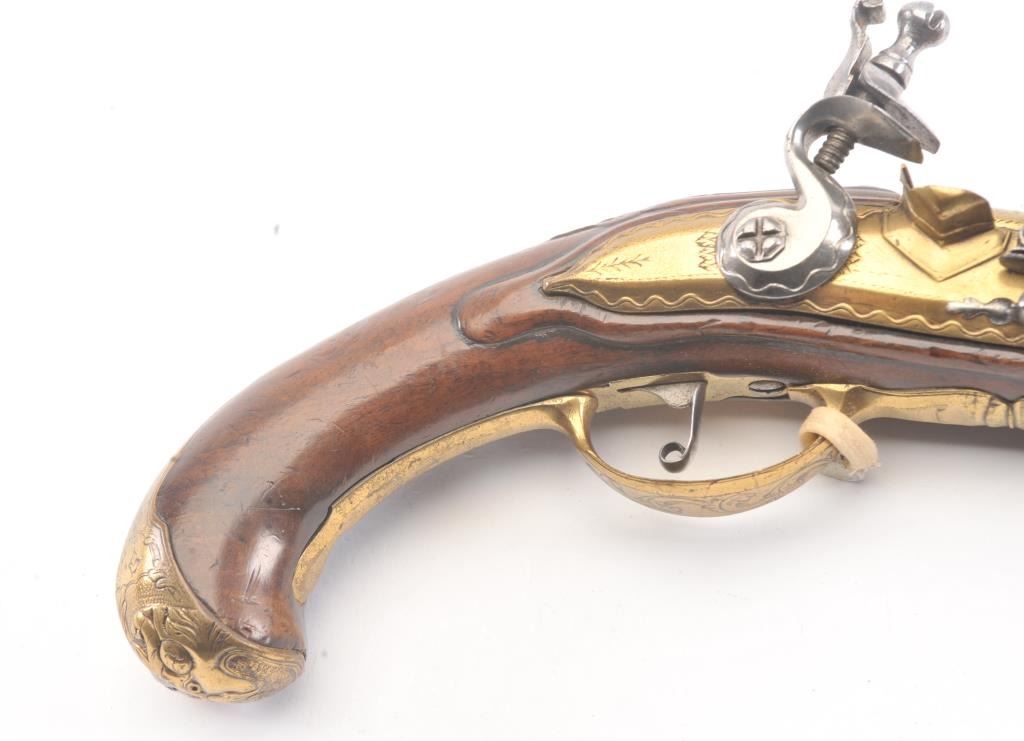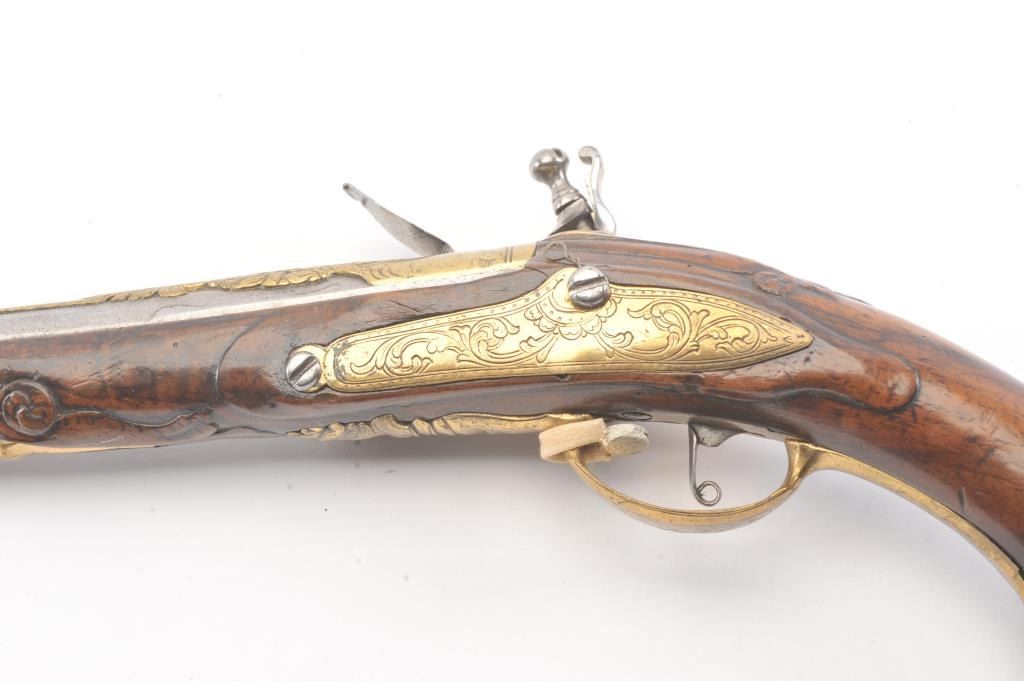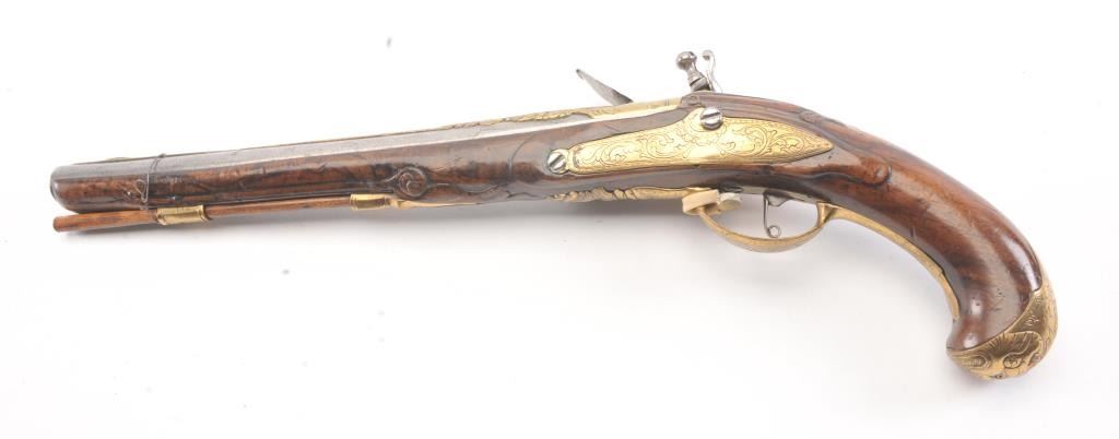 Germanic Flintlock Horseman’s size pistol circa early to Mid-18th century with banana shaped lock and fancy gilt brass mounts. Measures approximately 19” overall with a 13” barrel of approximately .67-.69 calibersmooth bore. The barrel shows an angel in the brass ornamentation with fancy figural on the trigger guard and mask butt. Very good plus overall condition with all correct flintlock parts. The wood is also very goodwith minor nick, mars and slight imperfections. Correct ramrod with metal head and worm at the end. Est.: $1400-$2800