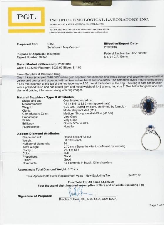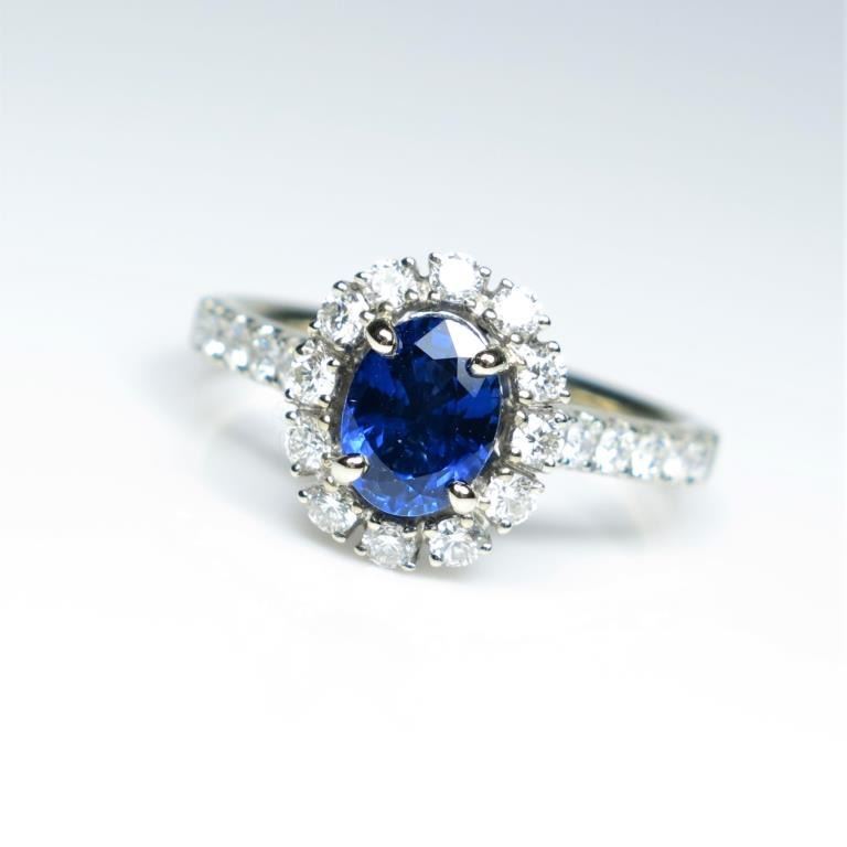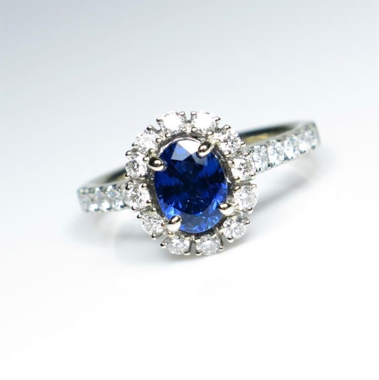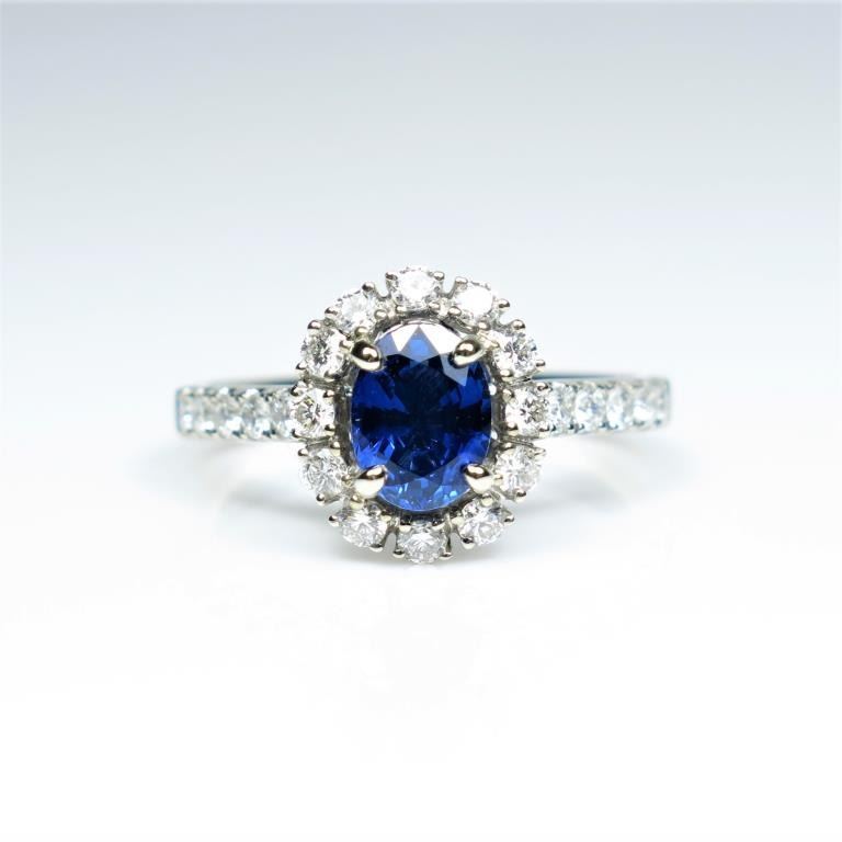 Beautiful NEW Ceylon Blue Sapphire and Diamond Ring featuring an Extra Fine oval cut Sapphire weighing 1.25 carats encircled with 24 ‘IDEAL’ cut Diamonds weighing 0.70 carats with F-G colors and VS/SI clarity set in 14karat white gold. Retail $5,000-$7,000 Estimates $4,000-$6,000