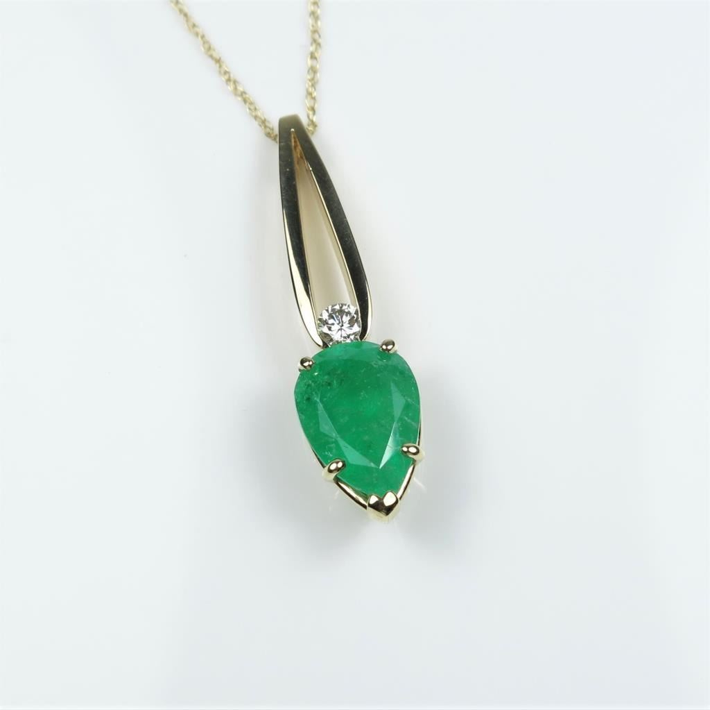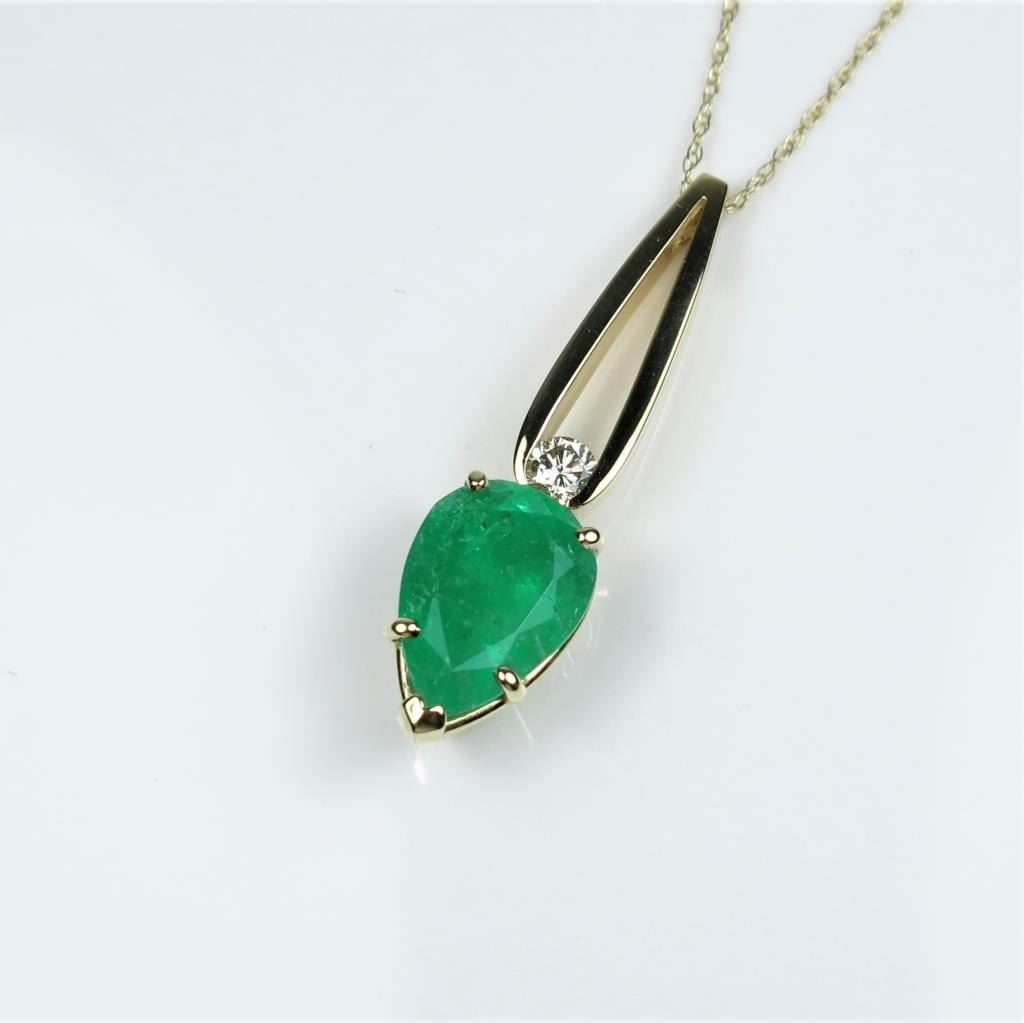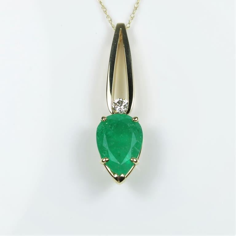 Gorgeous Columbian Emerald and Diamond Pendant featuring a 3.87 carat vibrant pear shape Emerald accented in a graceful contemporary setting with an accent Diamond with G-H color and VS clarity set in 14karat yellow gold. Retail $5,000-$6,000 Estimates $3,000-$4,000