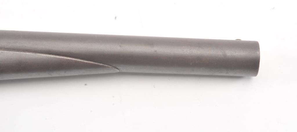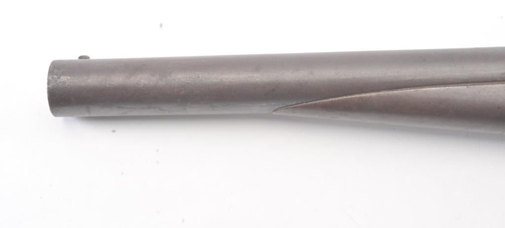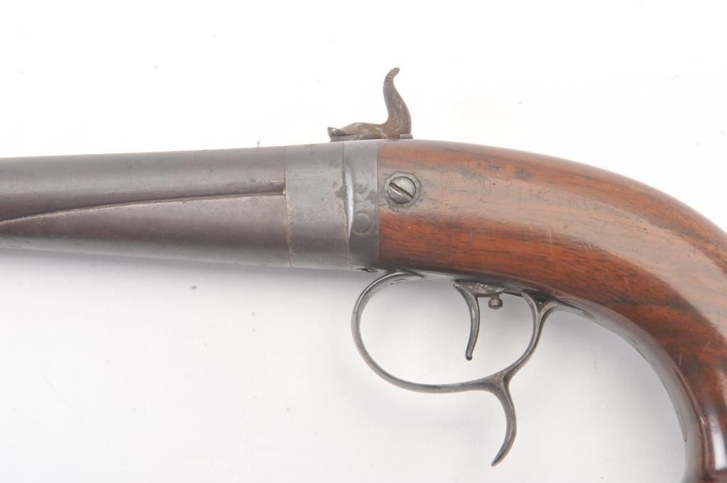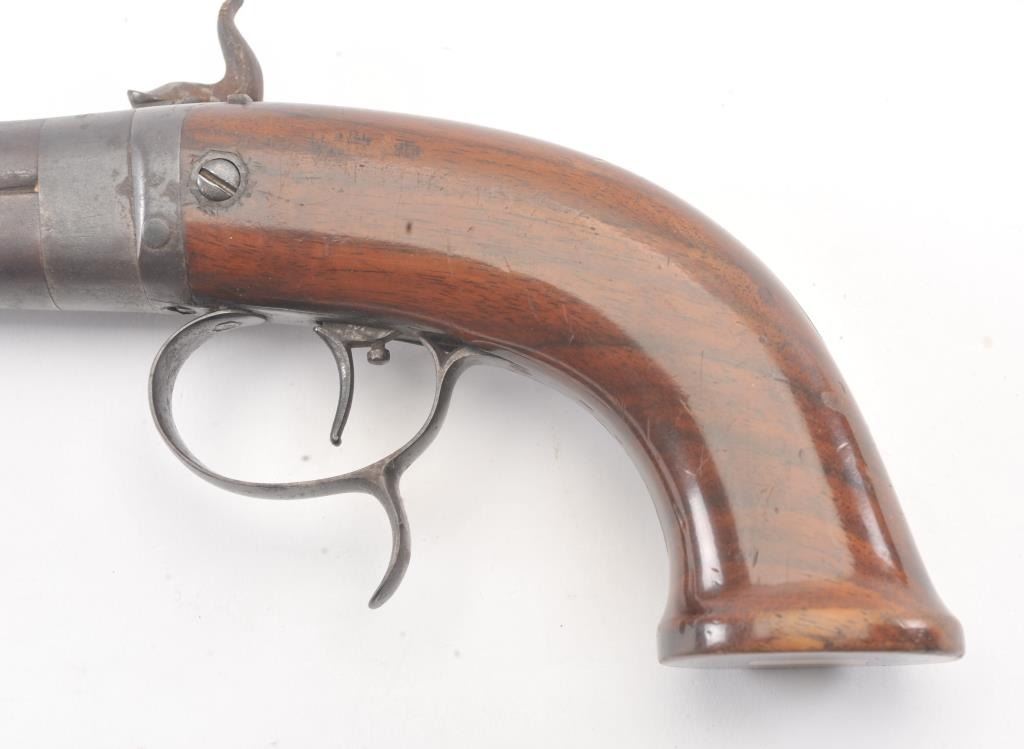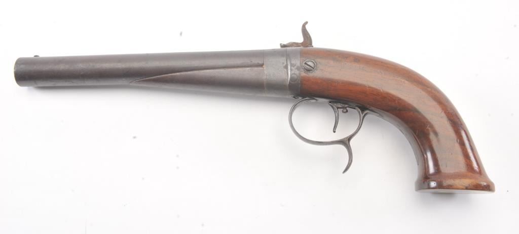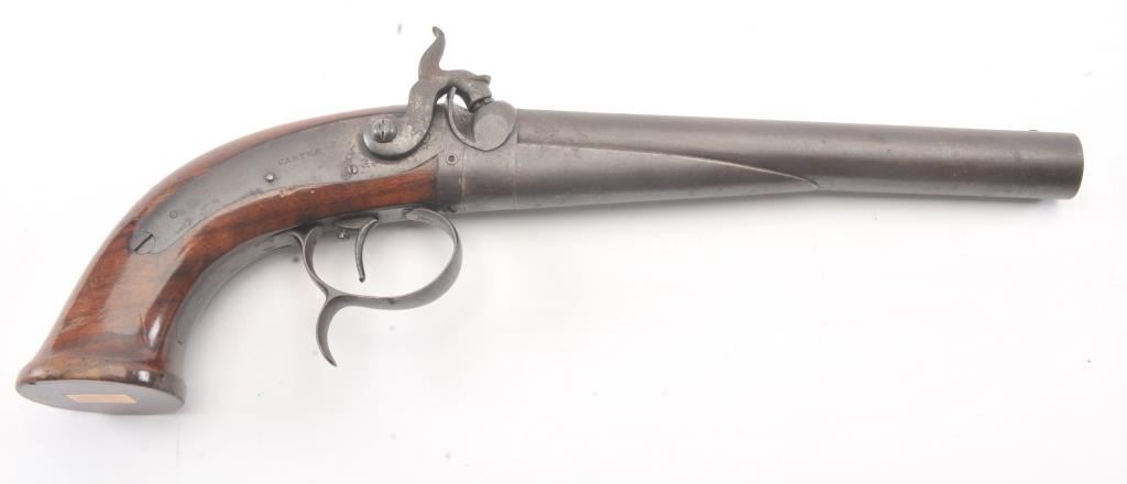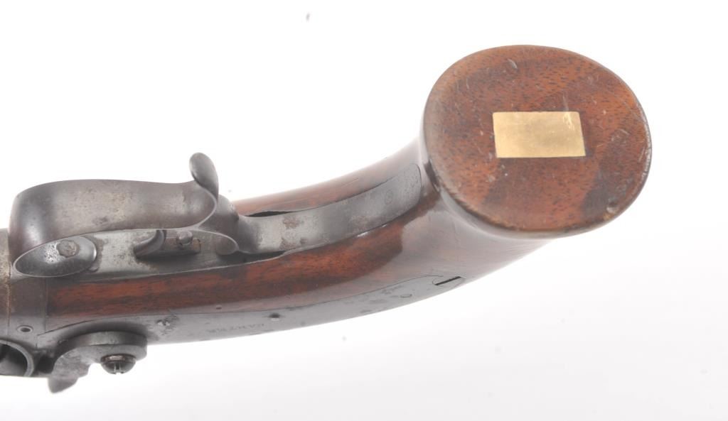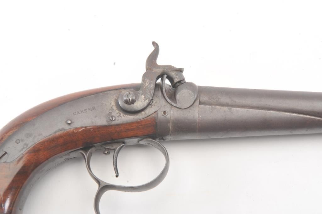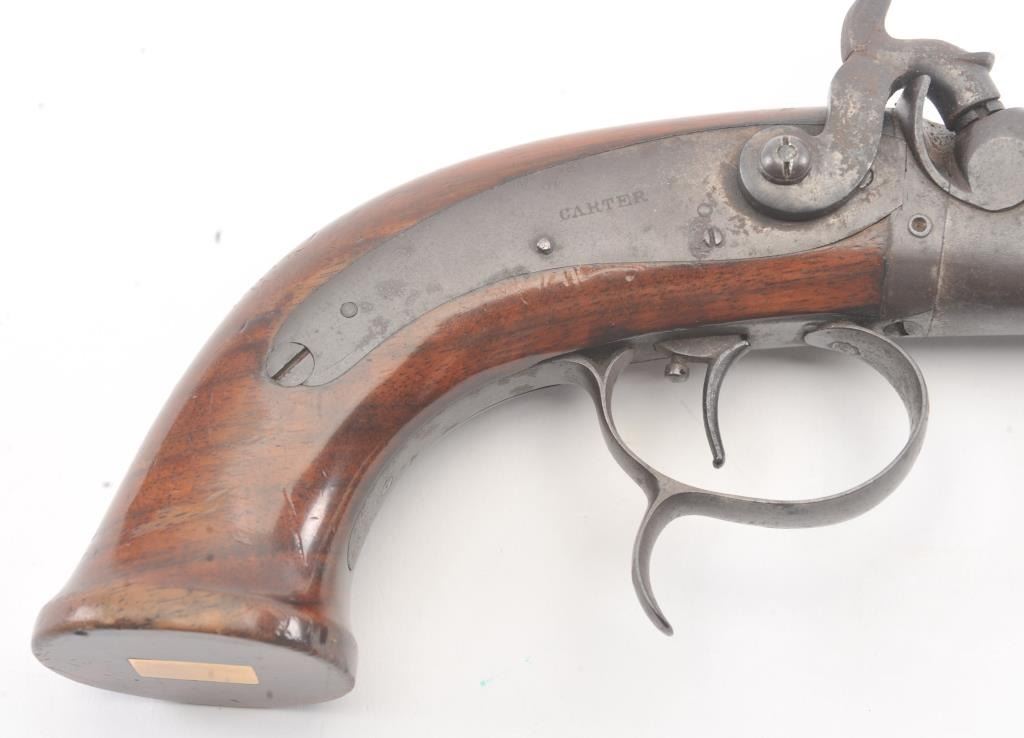 American percussion dueler target pistol circa 1850-60s signed "Carter" on lock. Made with metal fore end and round barrel measuring 8" in .54 caliber rifled with set trigger. Varnished wood stock with squaredoff wide butt in very good condition. Rose gold plaque for name in butt. Work well but trigger does not set every time. Good metal with smooth patina. American duelers are scarce. (Antique) Est.: $600-$1200