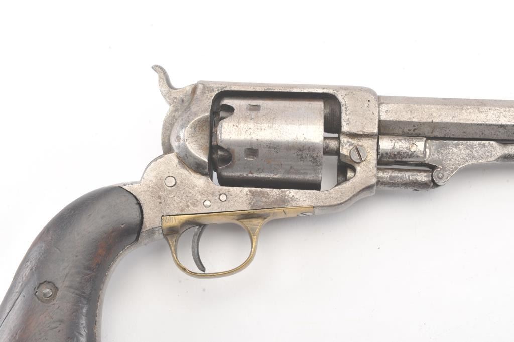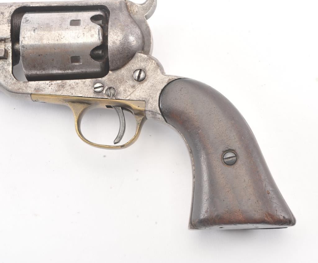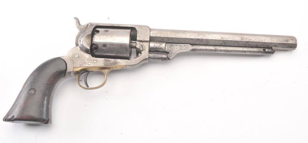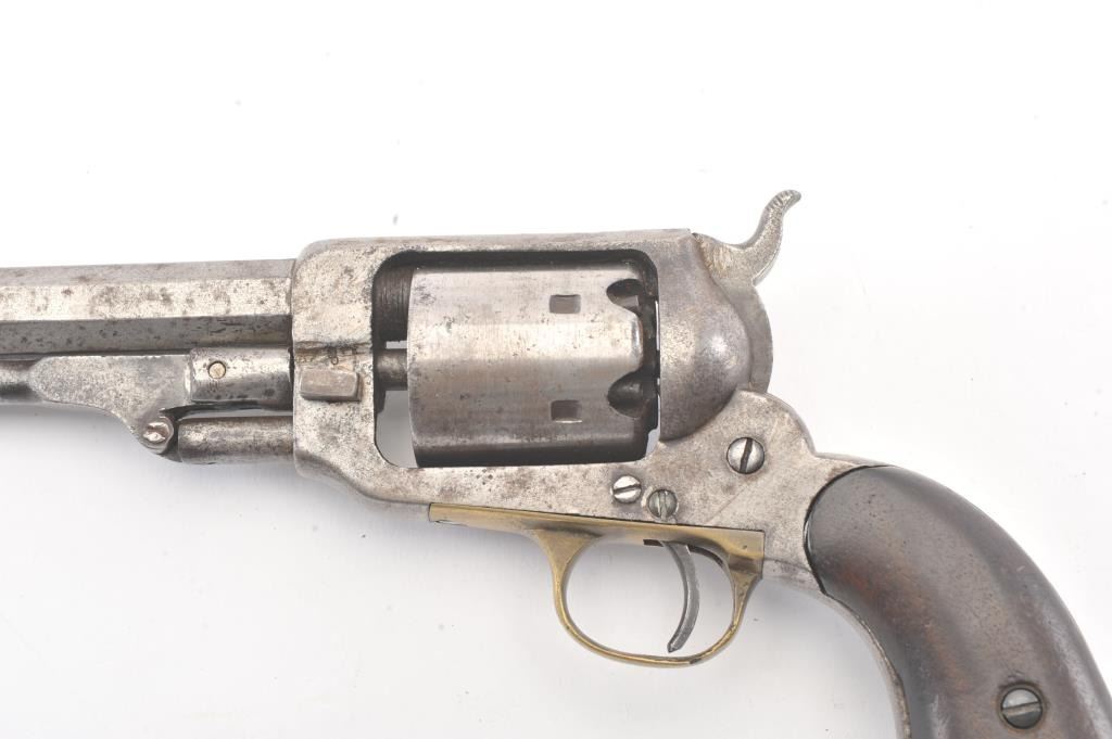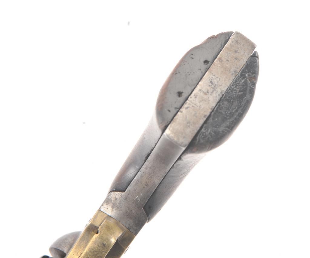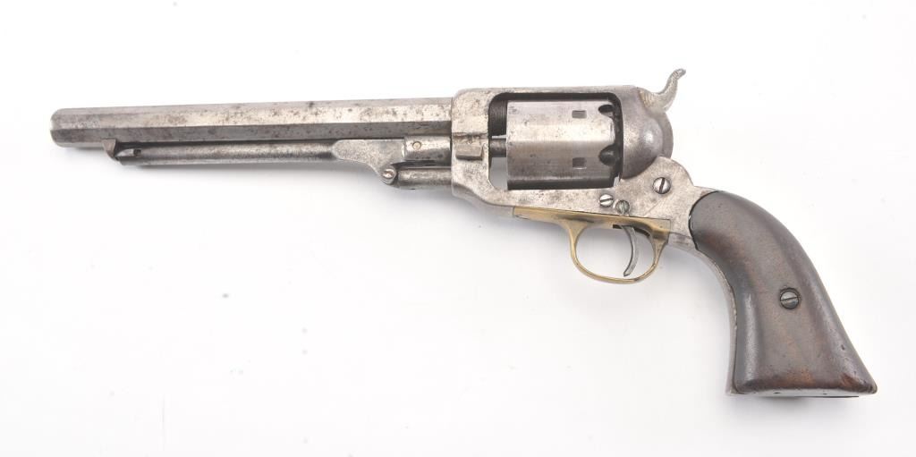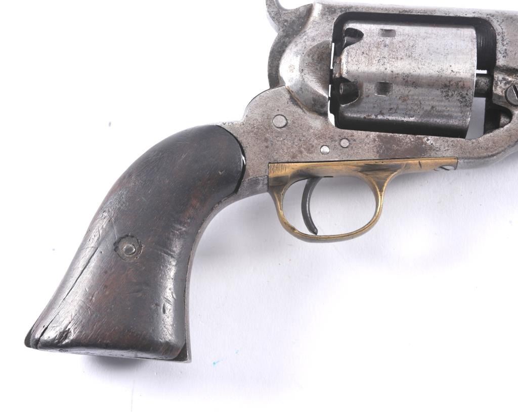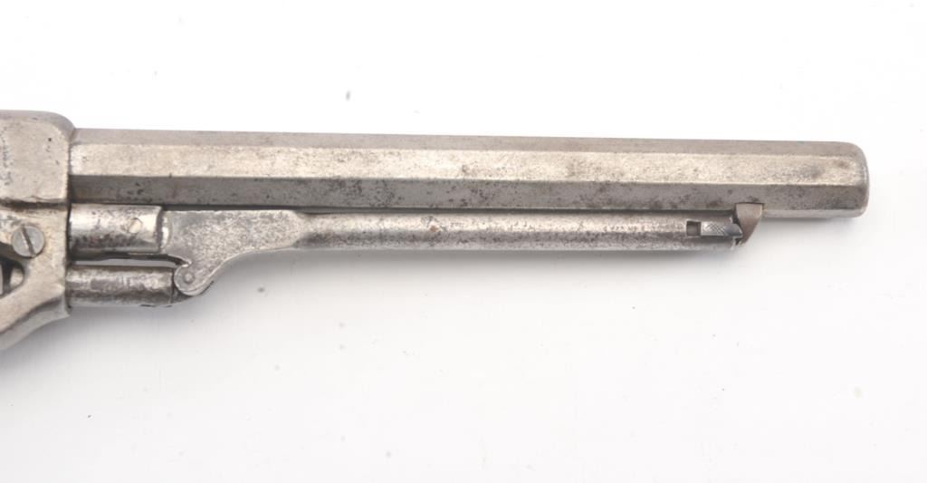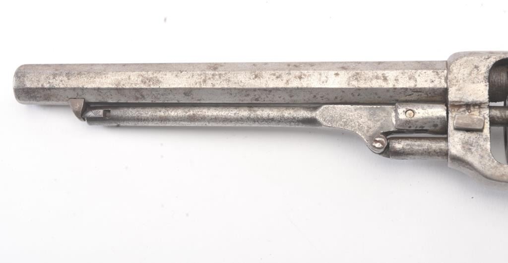 Whitney .36 caliber percussion revolver, S/N 15153 showing gray patina with scattered light to moderate erosion. The barrel address is not visible from cleaning. The grips are fair to good with replacement screw andescutcheon missing. Some losses at the heels and toe. The action is good. Civil war era secondary used. (Antique) Est.: $350-$700