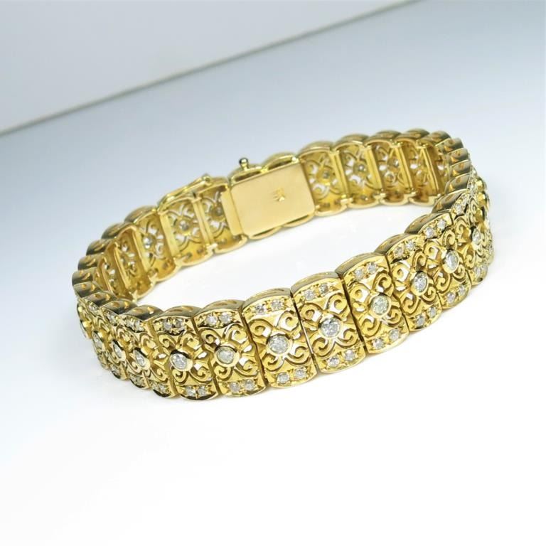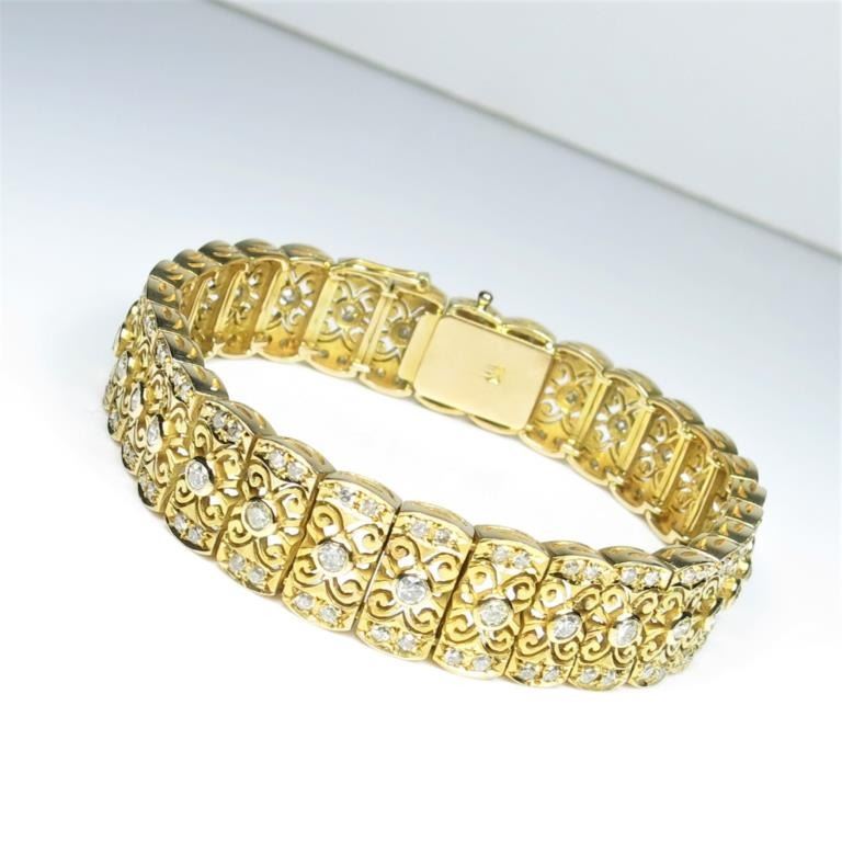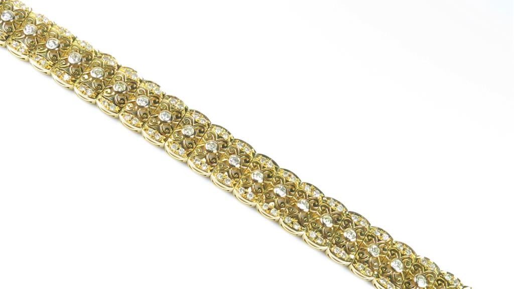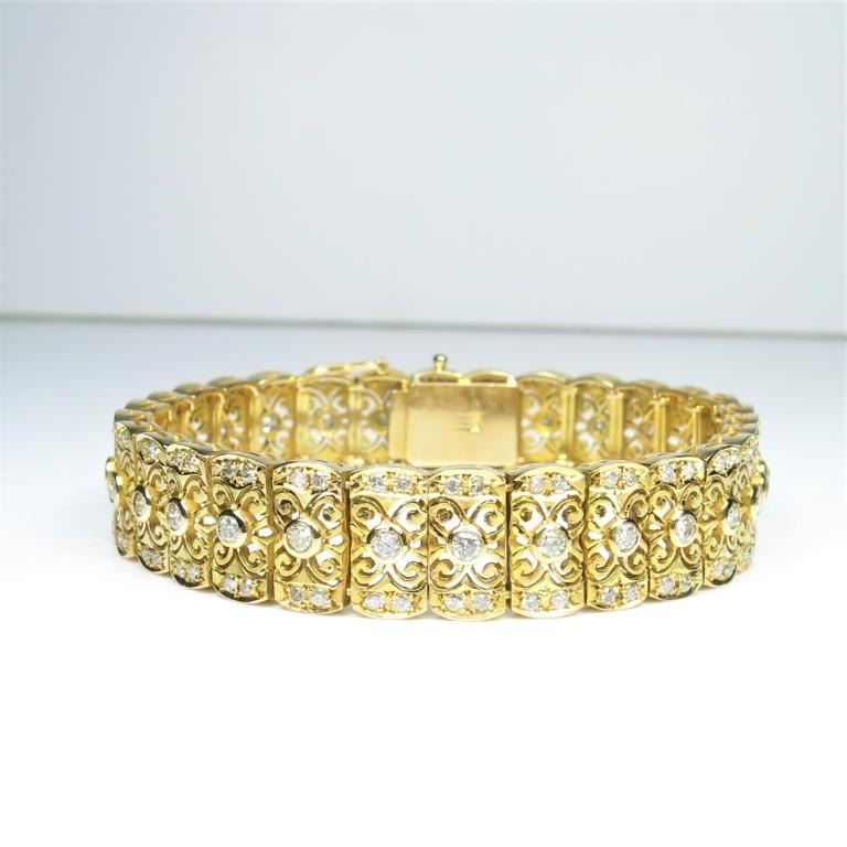 One of a Kind Art Deco Diamond Bracelet fine set with over 150 round cut Diamonds weighing approx. 3.00 carats with F-G colors and SI clarity set in an intricately detailed link style bracelet artfully crafted in heavy 14karat yellow gold. Retail $6,000-8,000 Estimates $3,000-$4,000