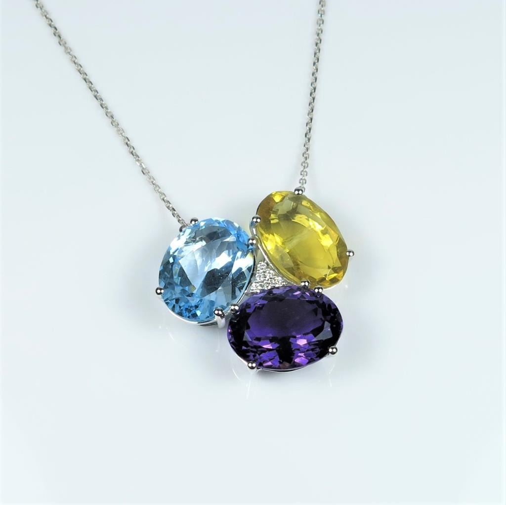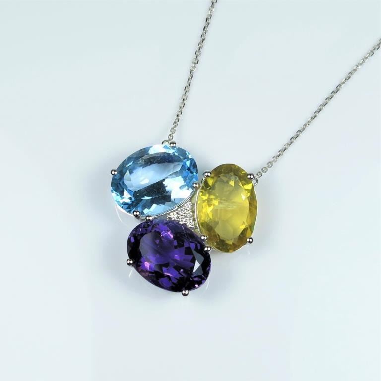 Big and Beautiful Multi-Gem Designer Pendant featuring 3 oval Amethyst, Blue Topaz, Citrine weighing approx. 25.00 carats accented with fine Diamonds set in a 14 karat white gold contemporary setting. Retail$5,000-$6,000 Estimates $2,000-$3,000