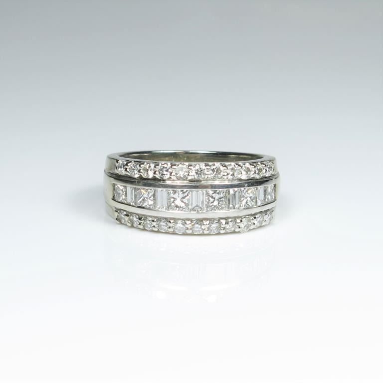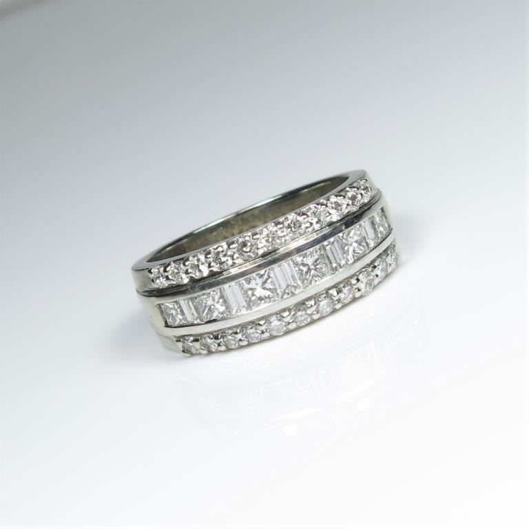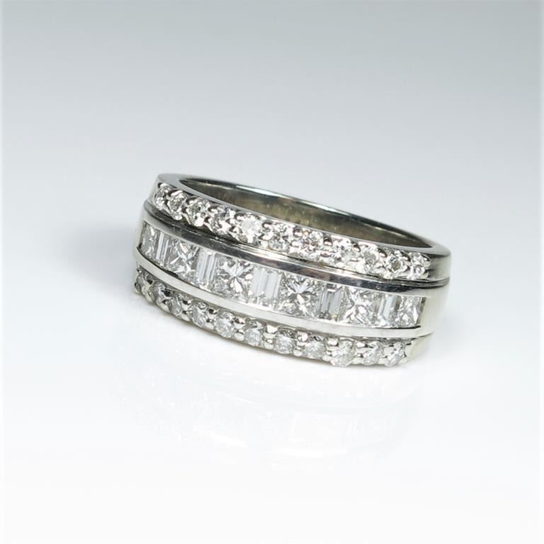 Brilliant Designer ‘KALLATI’ Diamond Ring featuring 33 channel set Princess, baguette and round cut Diamonds weighing approx. 1.50-2.00 carats with F-G colors and Extra Fine VVS/VS clarity set in 14 karat whitegold. Retail $5,000-$7,000 Estimates $3,000-$4,000