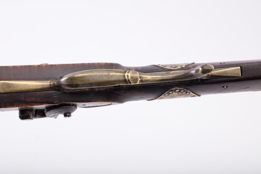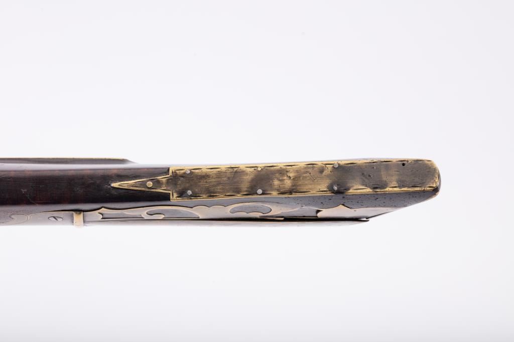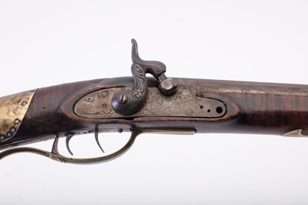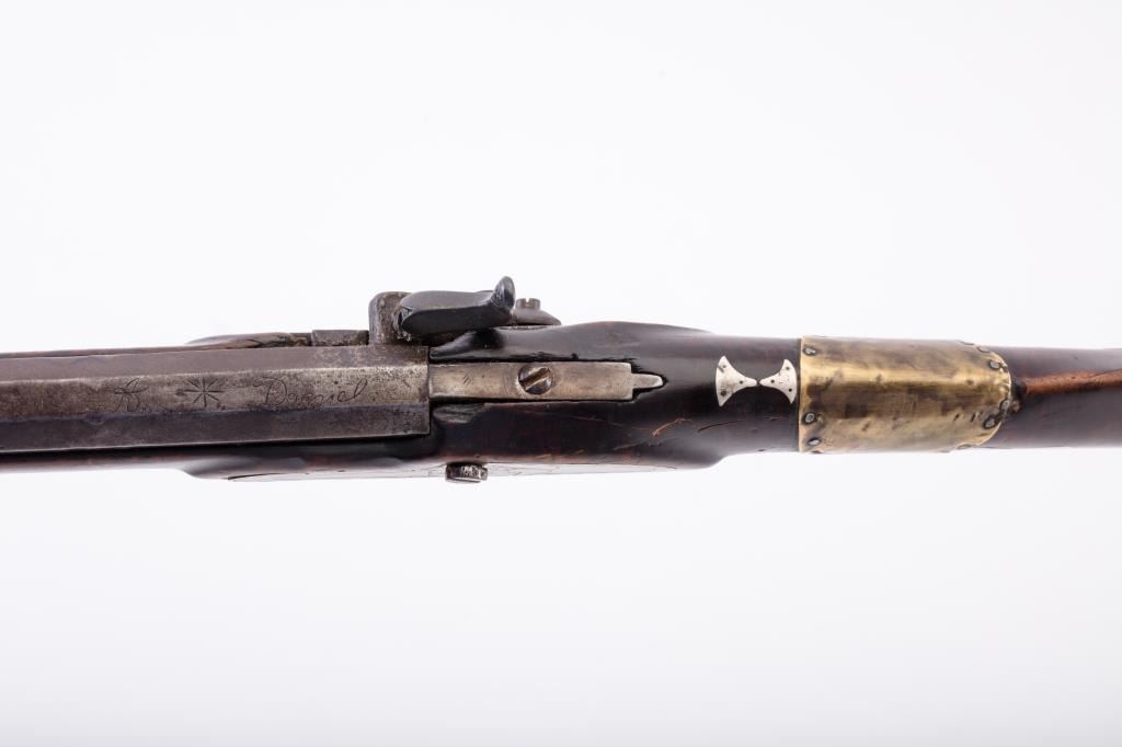 Full Stock Kentucky Rifle in percussion with barrel signed in script “A Daniel” and No. 7 engraved on sheet brass side plate. Fancy pierced patch box of generous proportions. 11 small silver inlays and showing old sheetbrass and nailed repairs. Addington Daniel is listed as a Kentucky style rifle maker in North Hampton Mass. circa 1850s to 60s. The rifle measures 52 ½” overall with 37” barrel. The lock plate was originally flint butprobably never used until percussion era. The wrist was repaired during use with sheet brass nailed around wrist and another similar repair to fore end by ramrod rear Ferrell. The lock is not holding on cocking and needsrepair. The condition is good overall with some minor erosion and pitting on the barrel. The heavier pitting in front right side of the barrel near muzzle. Large buck horn rear sight and blade front sight. In my opinionthis maker used an earlier patch box and lock to manufacture this rifle. From an old Northern California collector who purchased many arms like this directly from pioneers descendants from Mt. Shasta to Happy Camp.