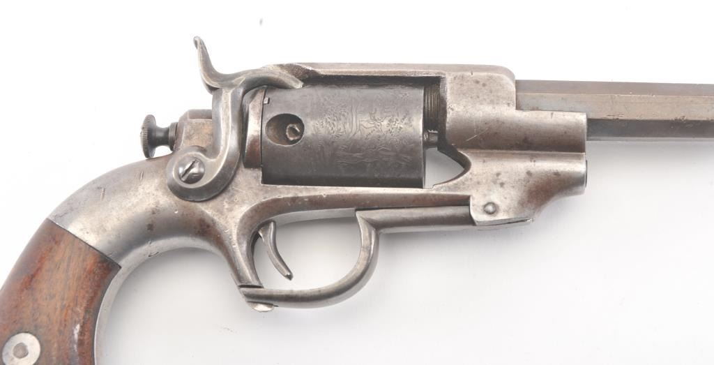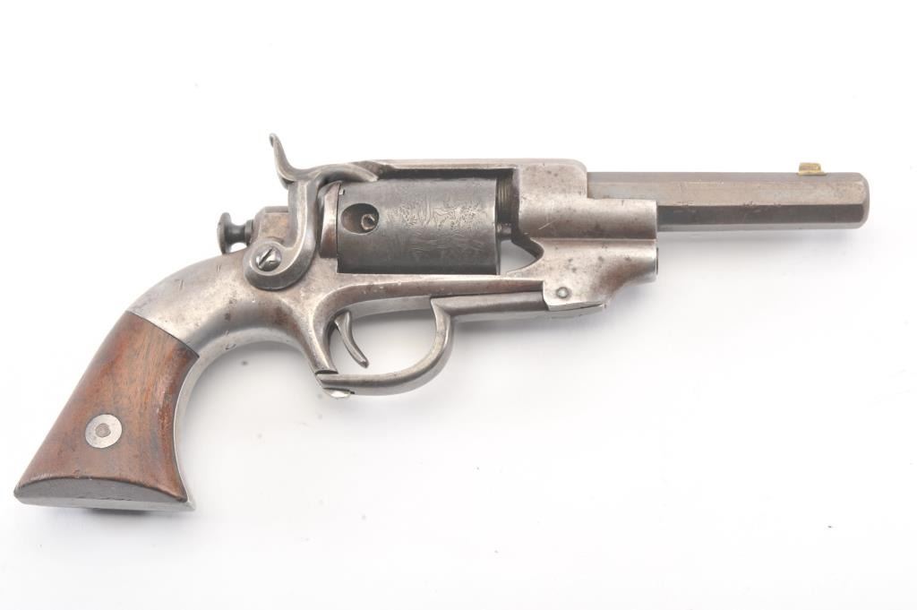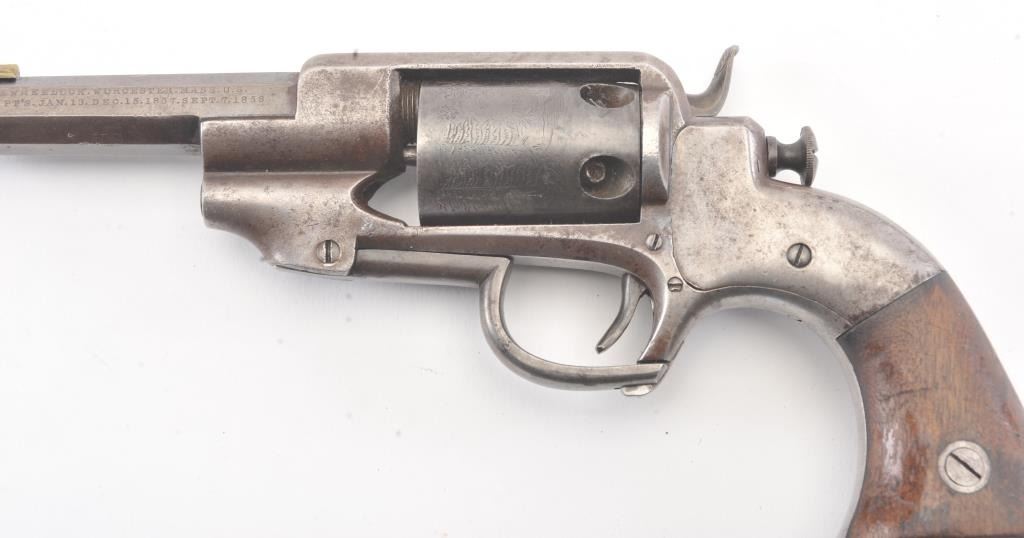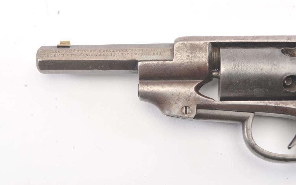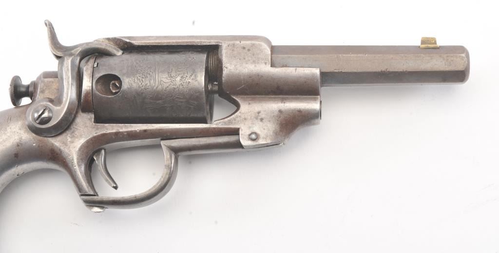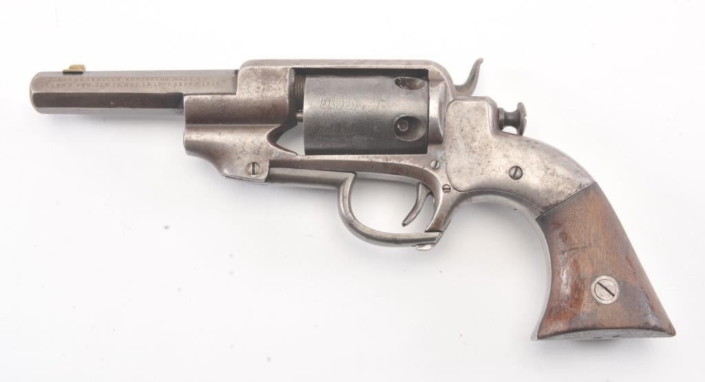 Allen and Wheelock Side Hammer .31 caliber Civil War era revolver with hinged lever operated by trigger guard. NSNV. 4" octagon barrel. Traces of blue going to patina with most of its cylinder scene remaining. Goodmarkings and grips. Works well with tight action. Better than average overall. (Antique) Est.: $500-$1000