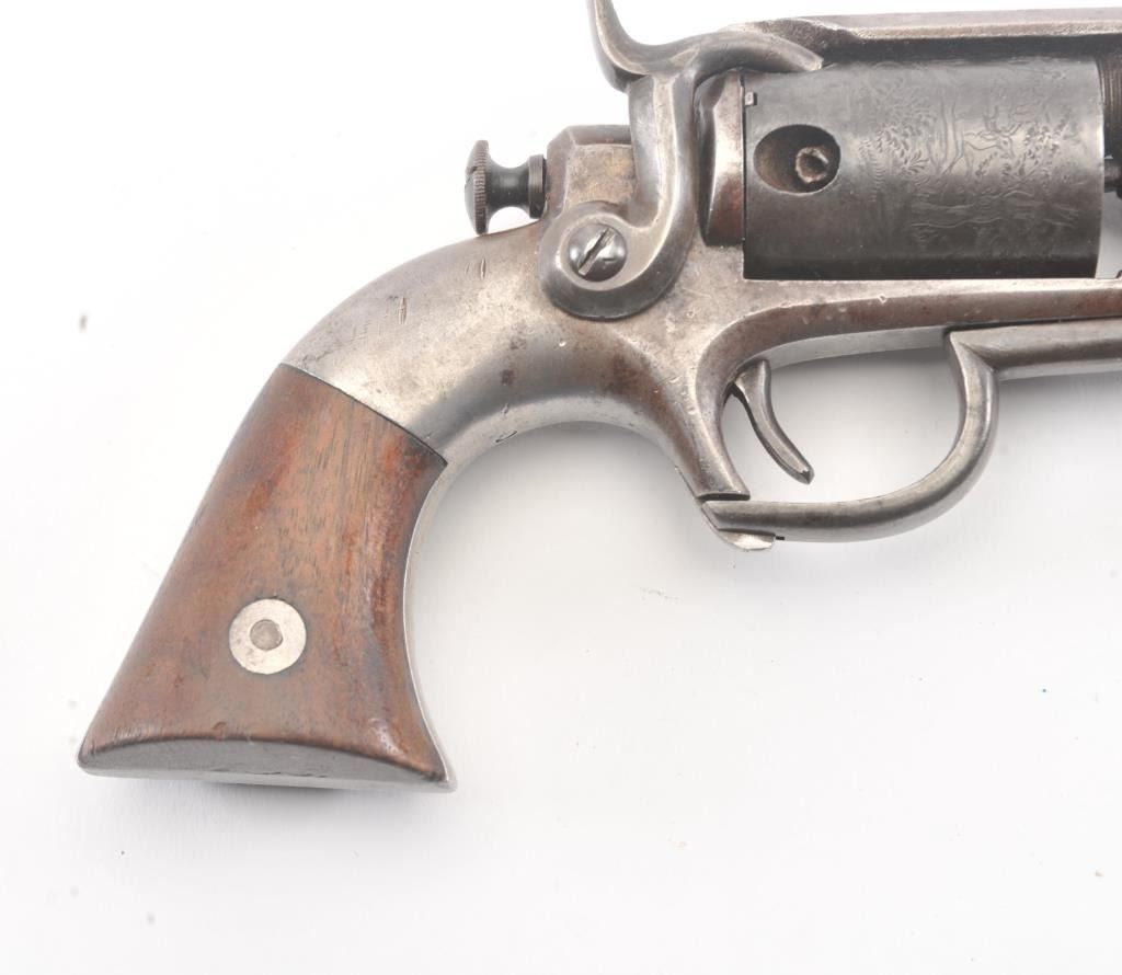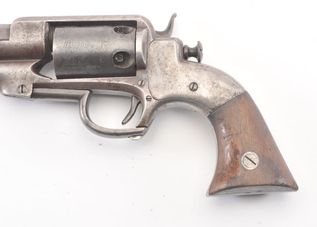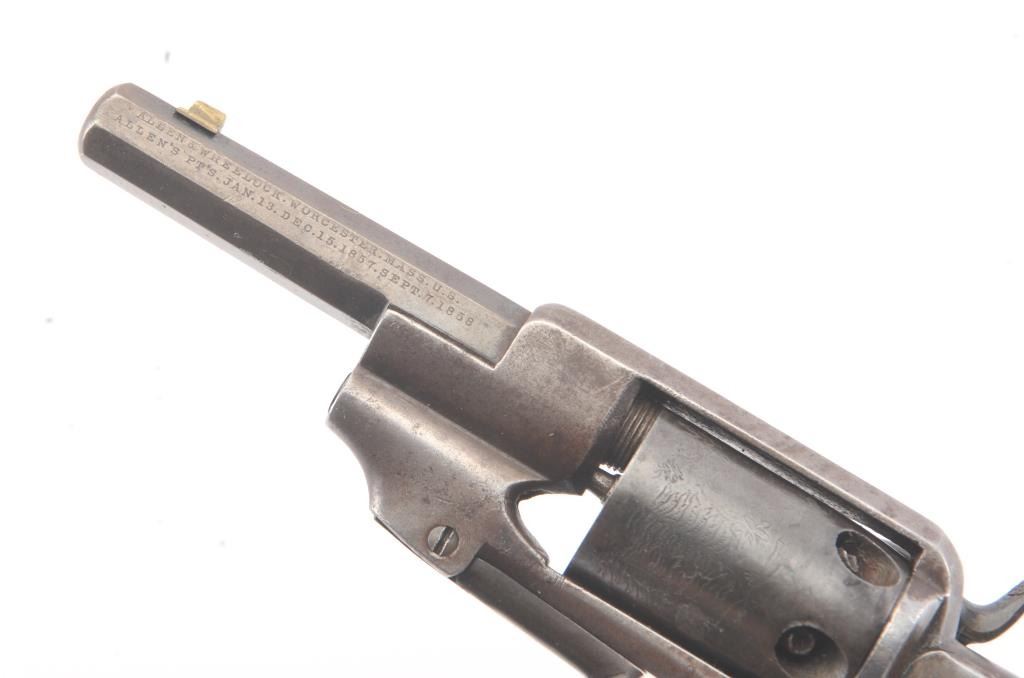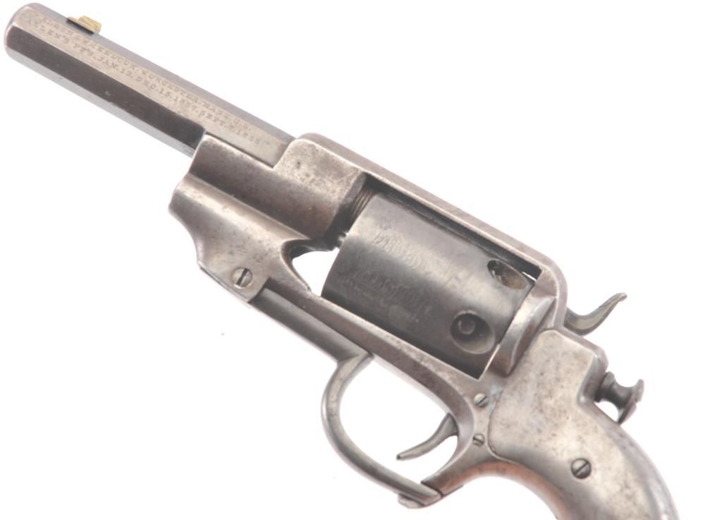 Allen and Wheelock Side Hammer .31 caliber Civil War era revolver with hinged lever operated by trigger guard. NSNV. 4" octagon barrel. Traces of blue going to patina with most of its cylinder scene remaining. Goodmarkings and grips. Works well with tight action. Better than average overall. (Antique) Est.: $500-$1000