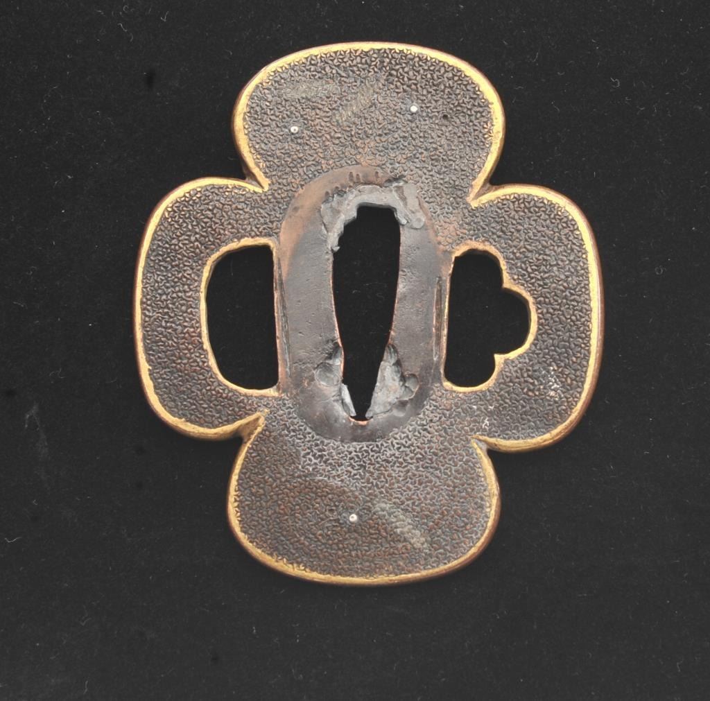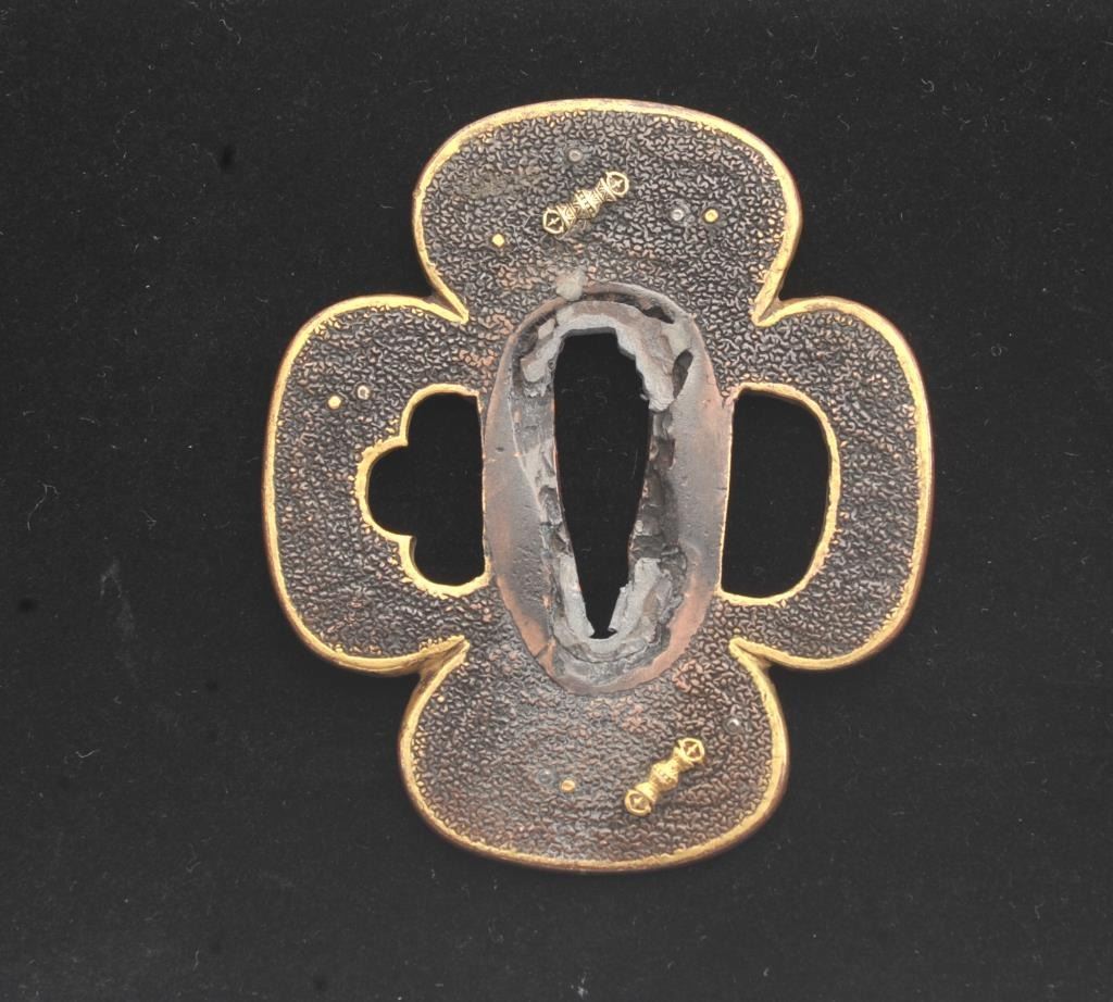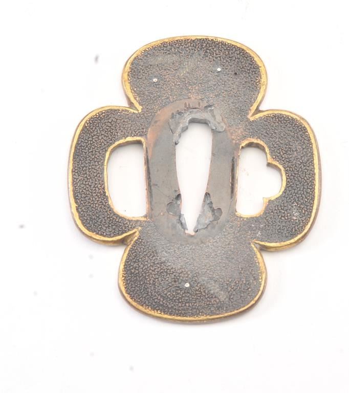 A Very Rare And Early (1640) Period Soft Metal Japanese Samurai Sword Tsuba Decorated With Gold Buddhist Varja. Early tsuba of soft metal are rare. This “mokko” form guard has the thinness of early tsuba. The plate is ofdark copper with gold trim and two superbly rendered varja in gold. The greatest dimension is 2 and 3/4 inches. Condition is fine and this tsuba has been mounted many times. Est.: $500-$700