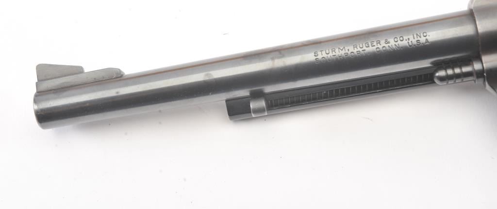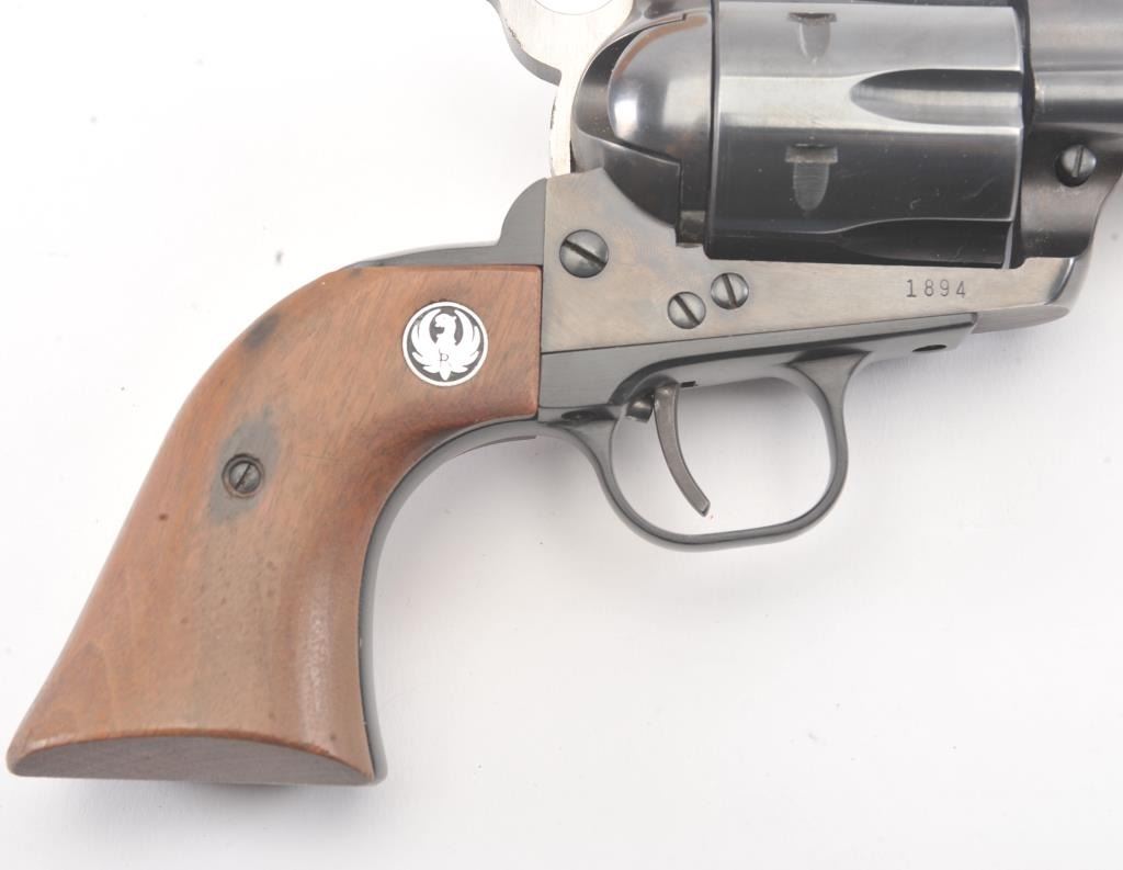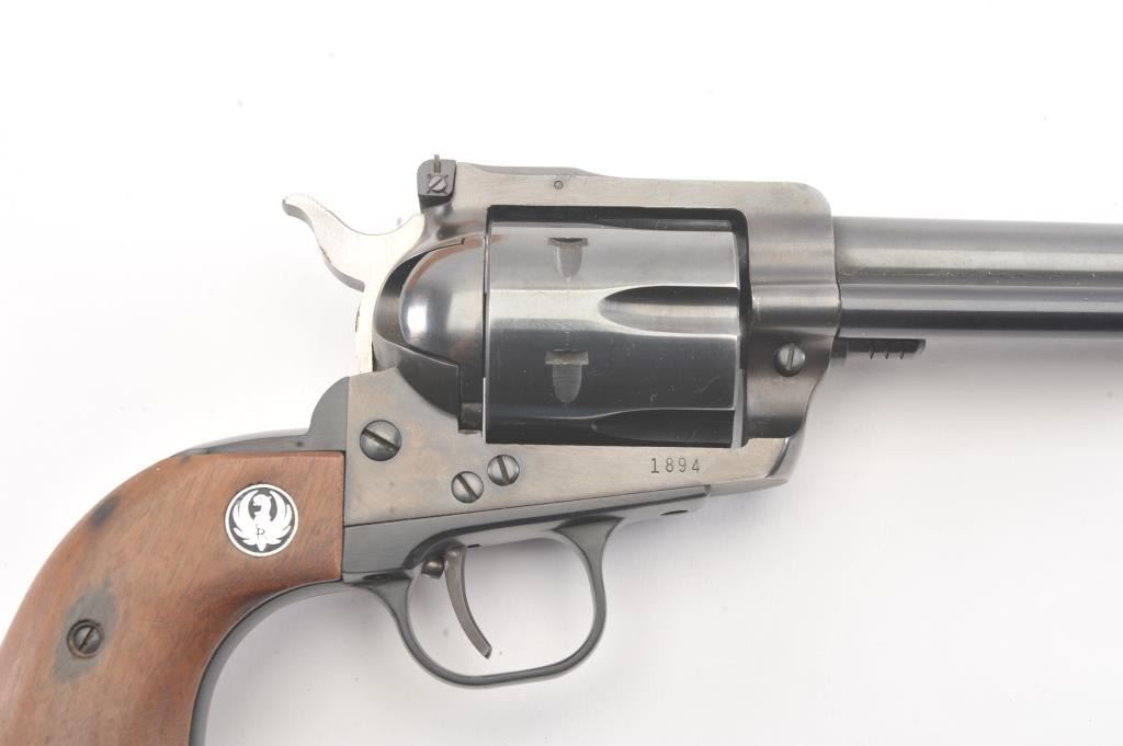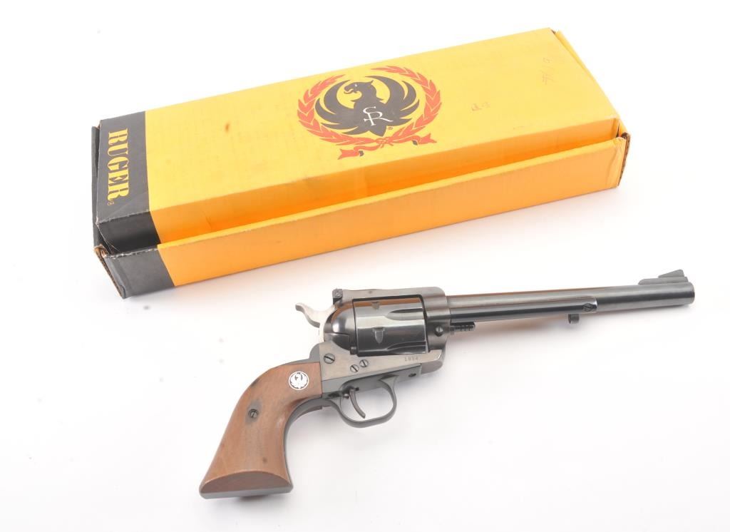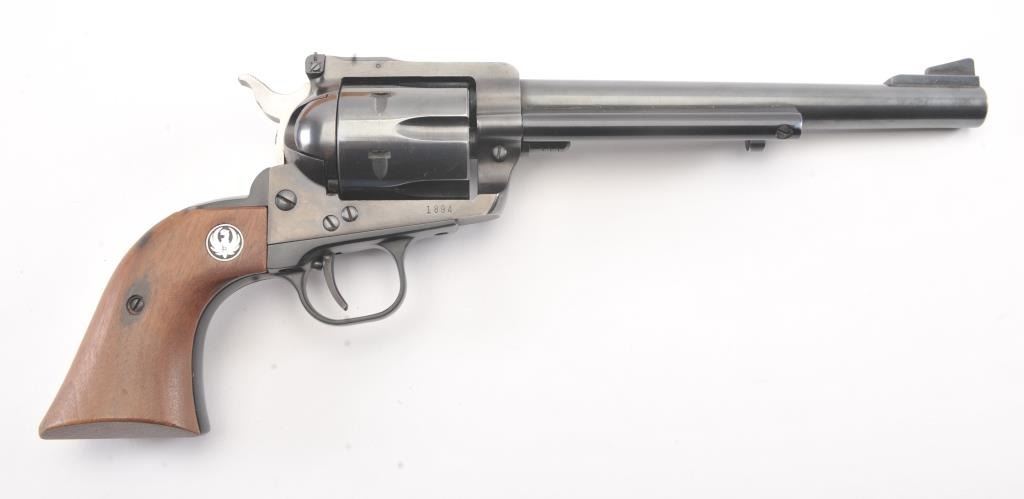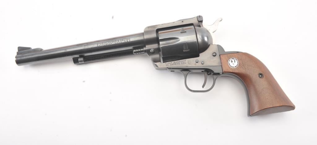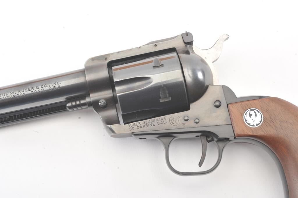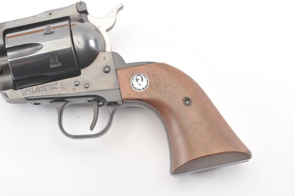 Ruger Blackhawk Single Action revolver in .30 carbine with a 7 1/2" barrel, S/N 1894 in box. Fine to excellent used condition with paperwork, extra hammer and small parts. 97%-99% overall with signs of firing and use. (Modern/PPT) Est.: $350-$700