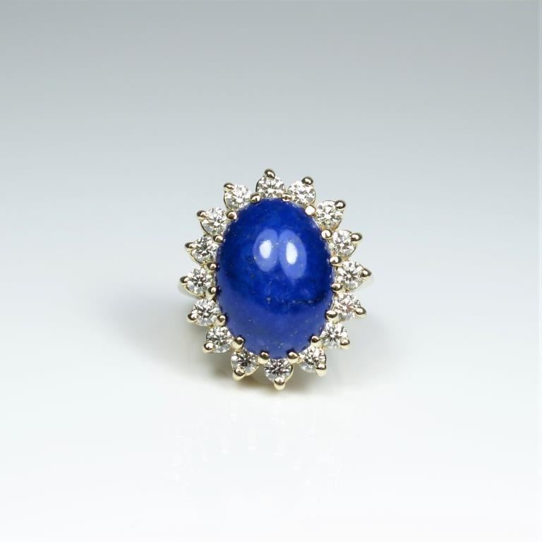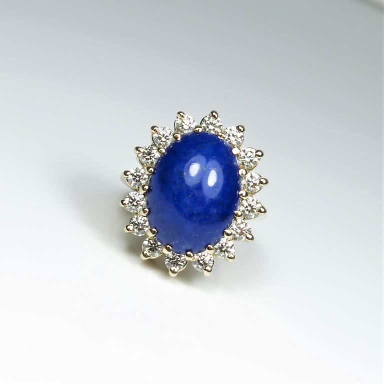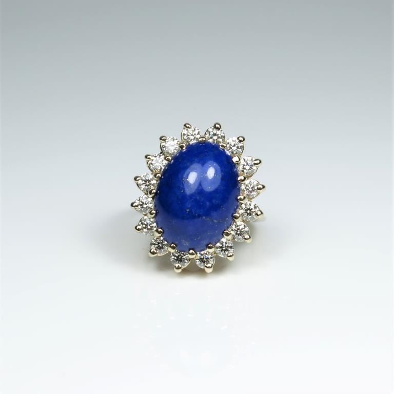 Gorgeous Vintage Lapis and Diamond Ring featuring a high quality oval Deep Blue Lapis Lazuli a semi-precious stone prized since antiquity framed by 16 perfect ‘IDEAL’ cut Diamonds weighing approx. 1.30 carats withH-I colors and VVS/VS clarity set in 14 karat yellow gold setting. Retail $6,000-$7,000 Estimates $3,000-$4,000