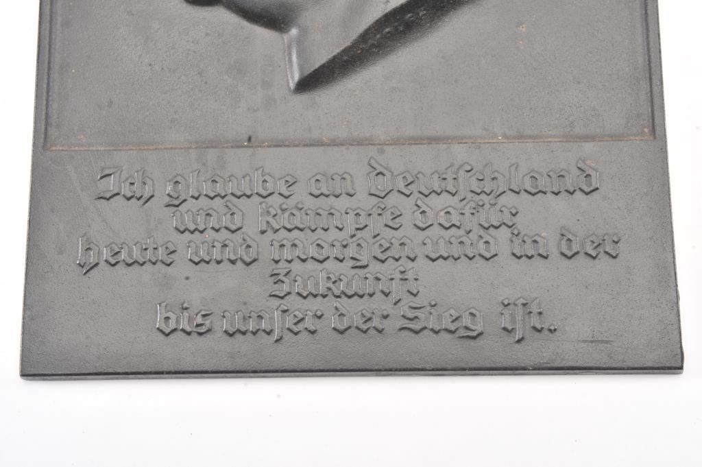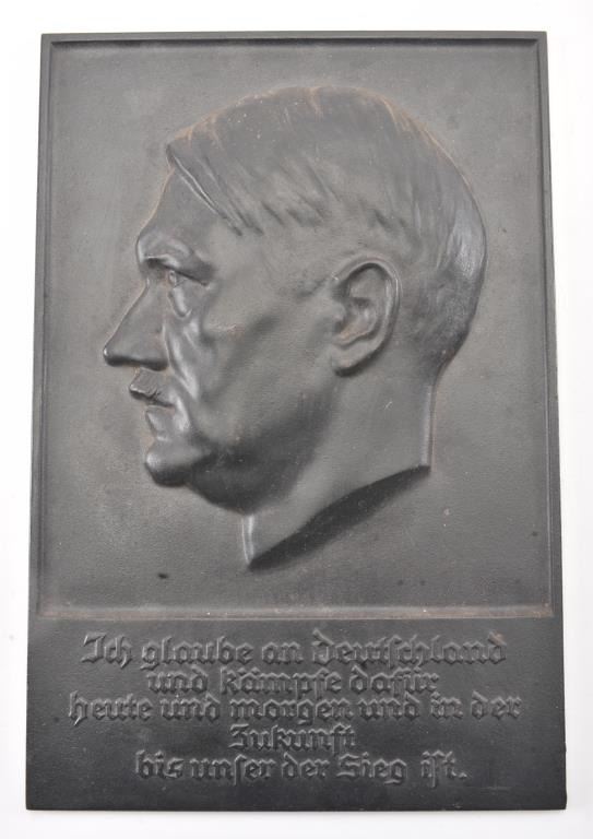 Heavy cast iron relief 3rd Reich wall plaque by Walter Wolff of Adolf Hitler. Signed at the base of neck "W. Wolff 33". The plaque with Hitler profile bust and German inscription reading "I believe in Germany and fightning for it today, tomoorw and in the future until our victory is done". These were officia portriats and hung in schools and official instituations. Though many were made most were destroyed. Measures 12 1/4" by 81/4". Scarce. Est.: $400-$600