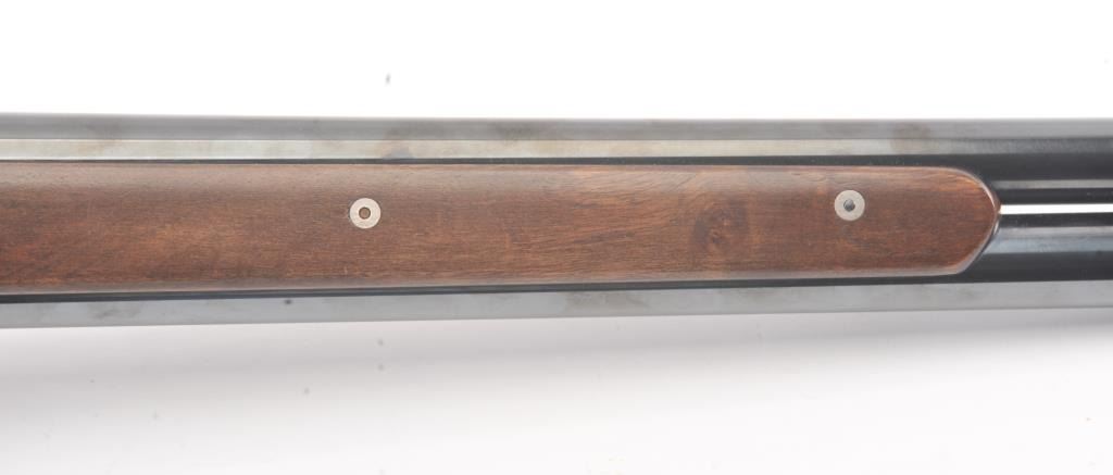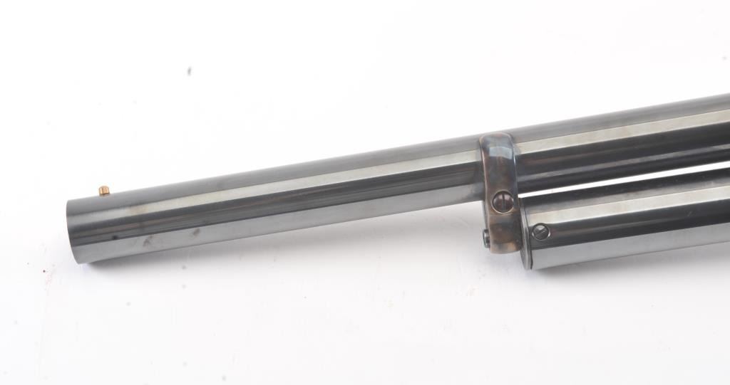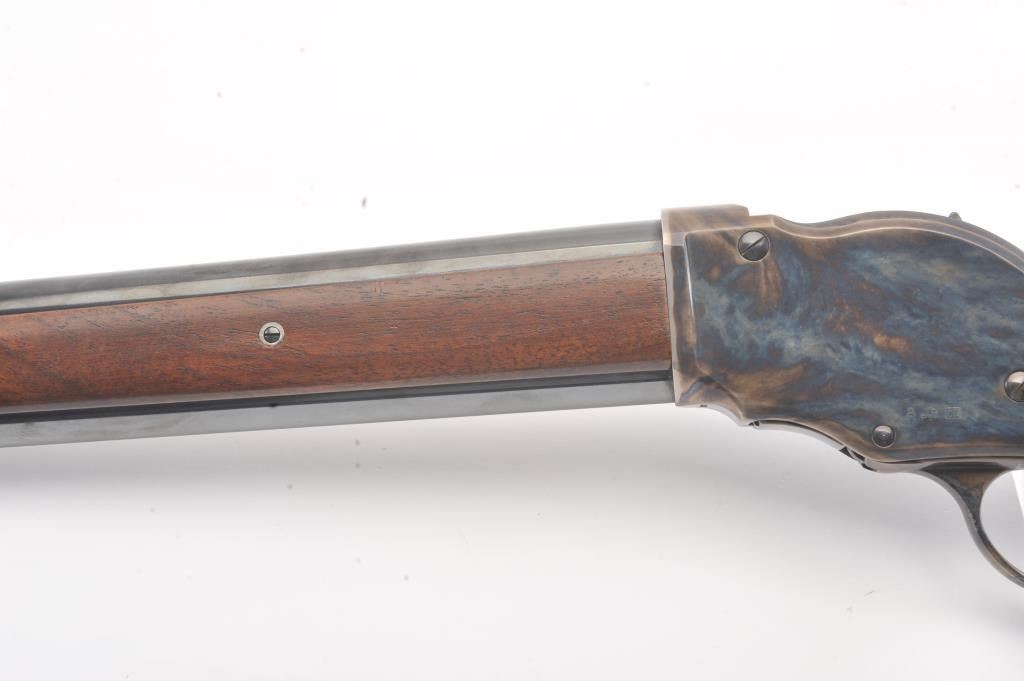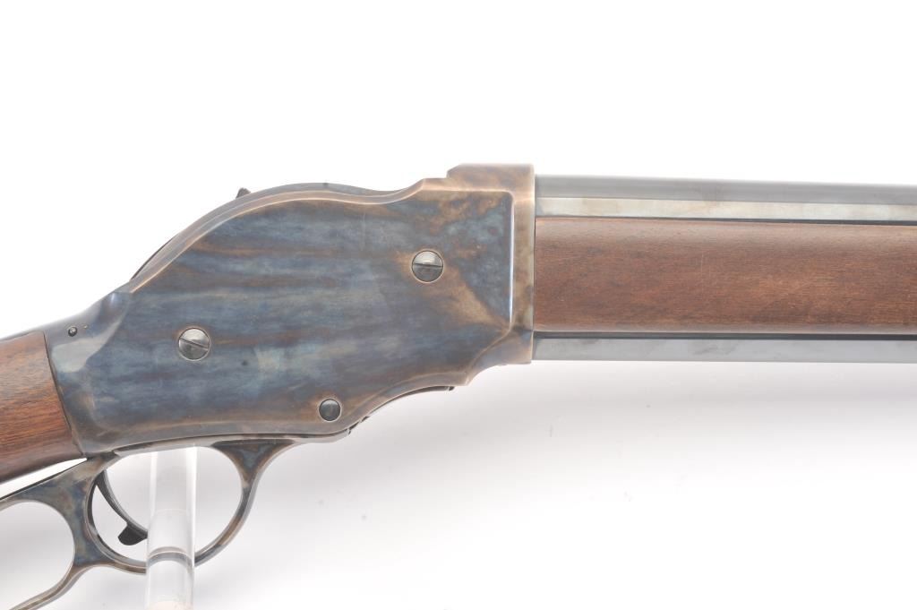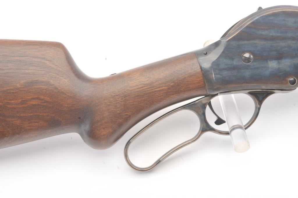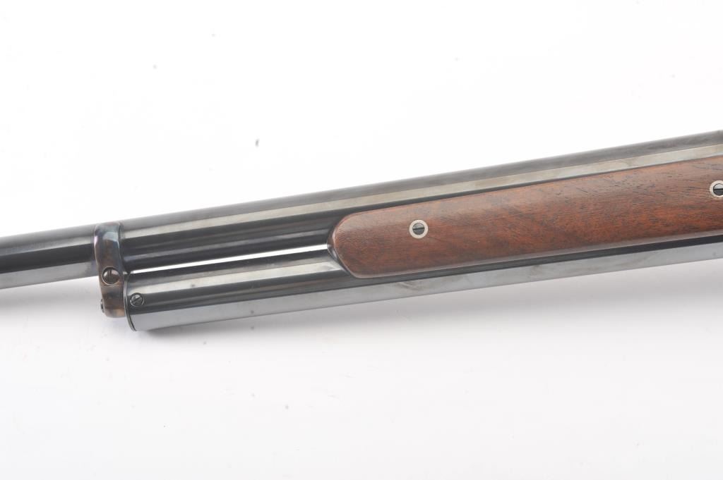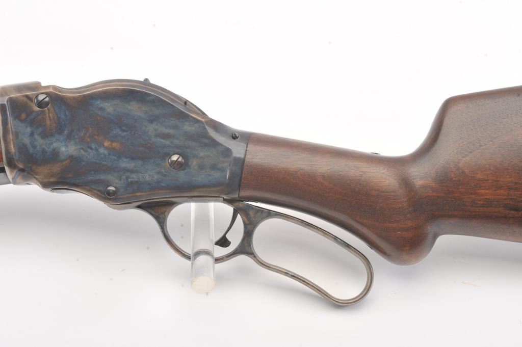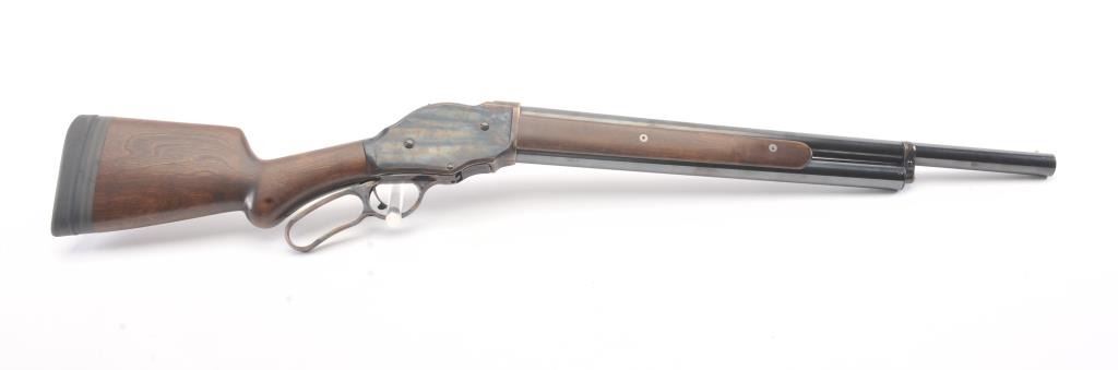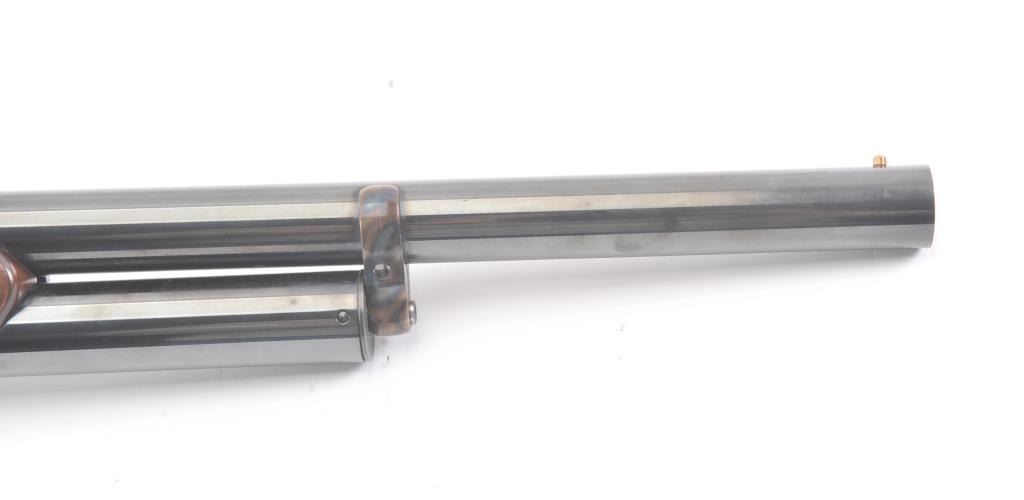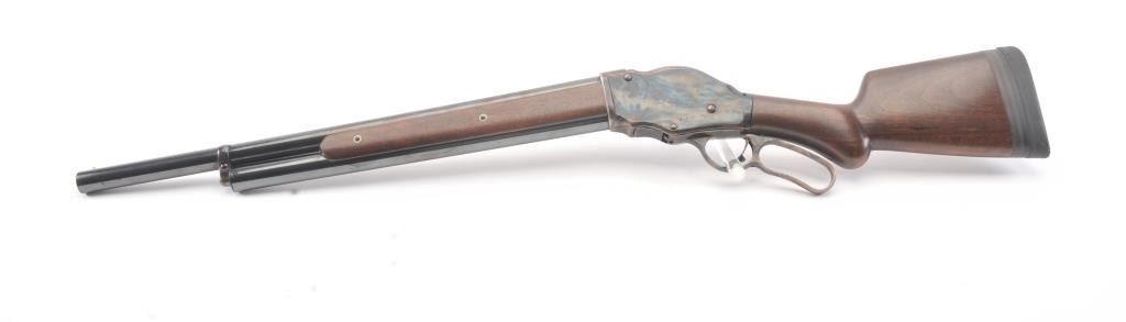 Chiappa Firearms Model 1887 lever action shotgun, 12 gauge, Serial #T6716. The shotgun is in as new condition with a 22” barrel. The Judge Roy Bean style lever retains 99% of the blue finish withbeautiful, vivid case colors on the receiver and lever assembly. The smooth wood stock has a 1 ½” spacer and pad providing a 12” LOP. The bore is good, the action is crisp and the markings are sharp. Est.:$400-$800. (Modern).