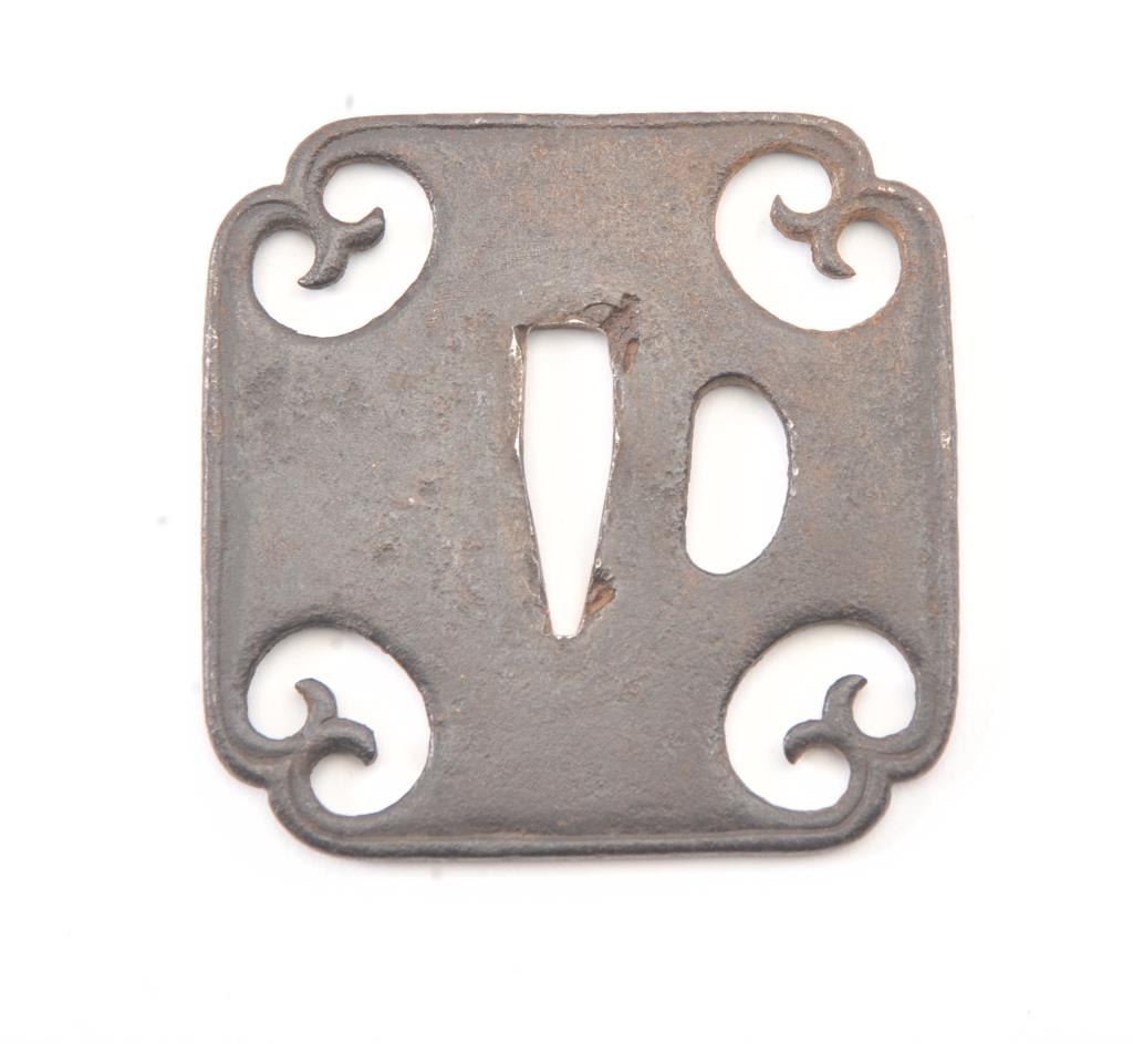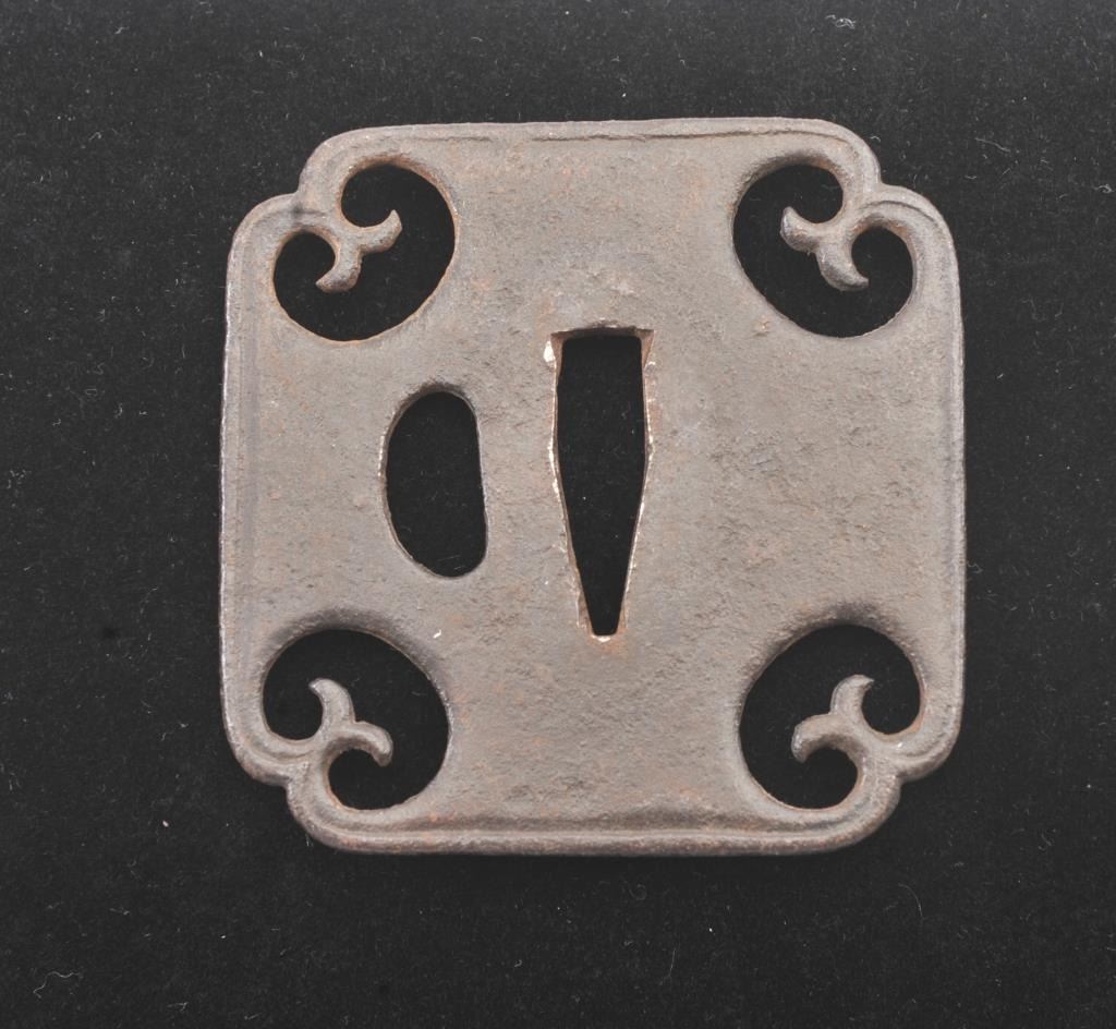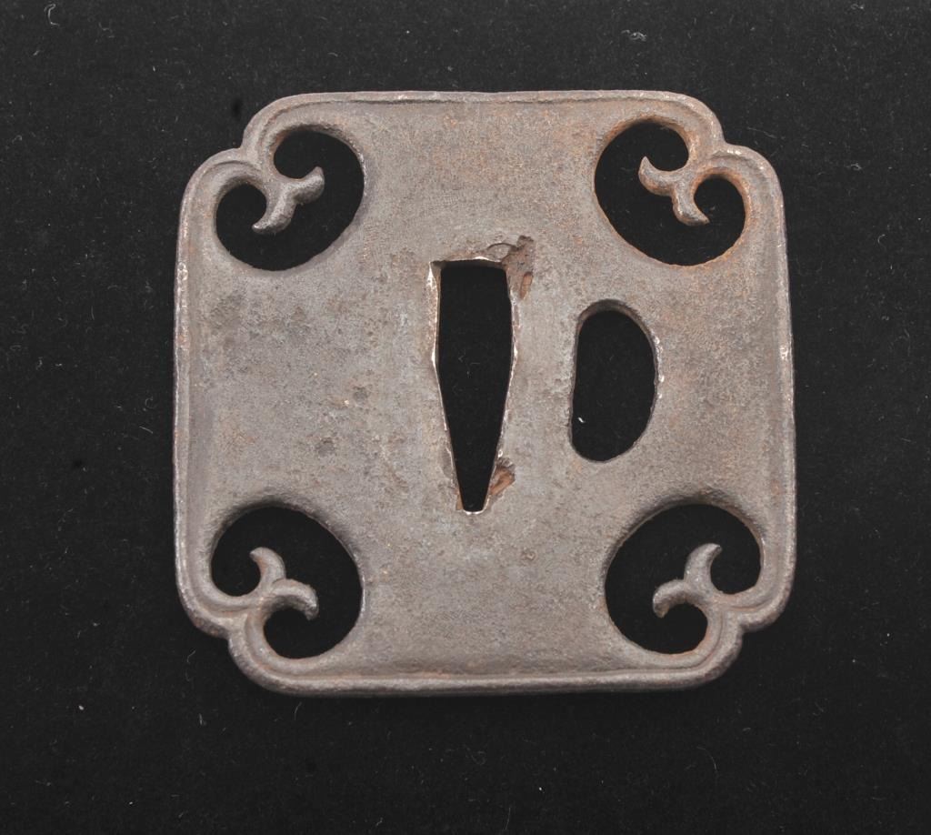 A Rare And Early 18th Century Iron Japanese Samurai Sword Tsuba. The finely patinated square iron plate is thin as are many really early tsuba. It is 2 and 34 inches across and pierced in its four corners. Condition isvery fine for such an early guard and rings like a bell. Est.: $400-$600