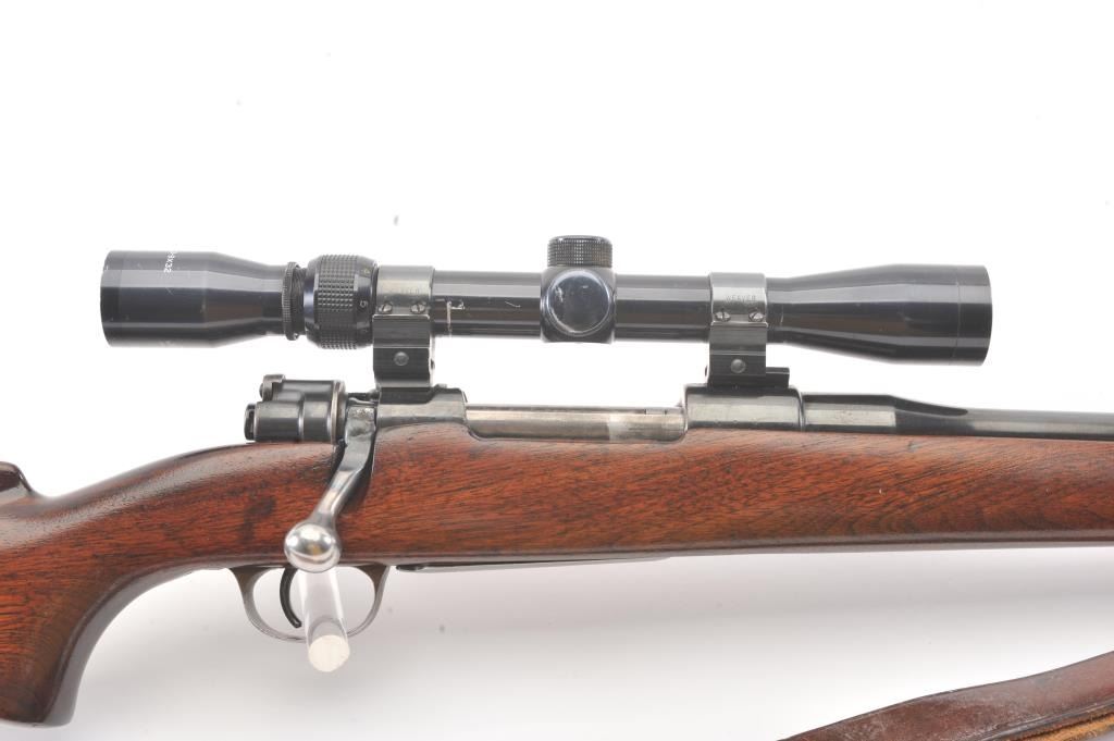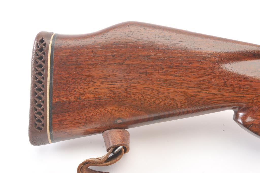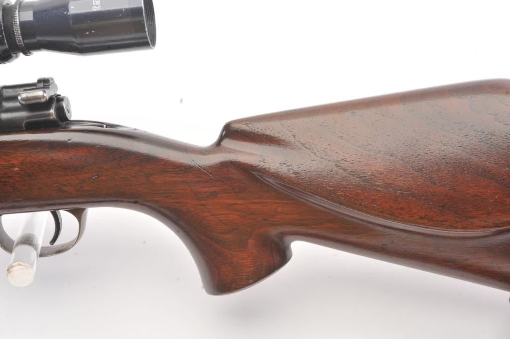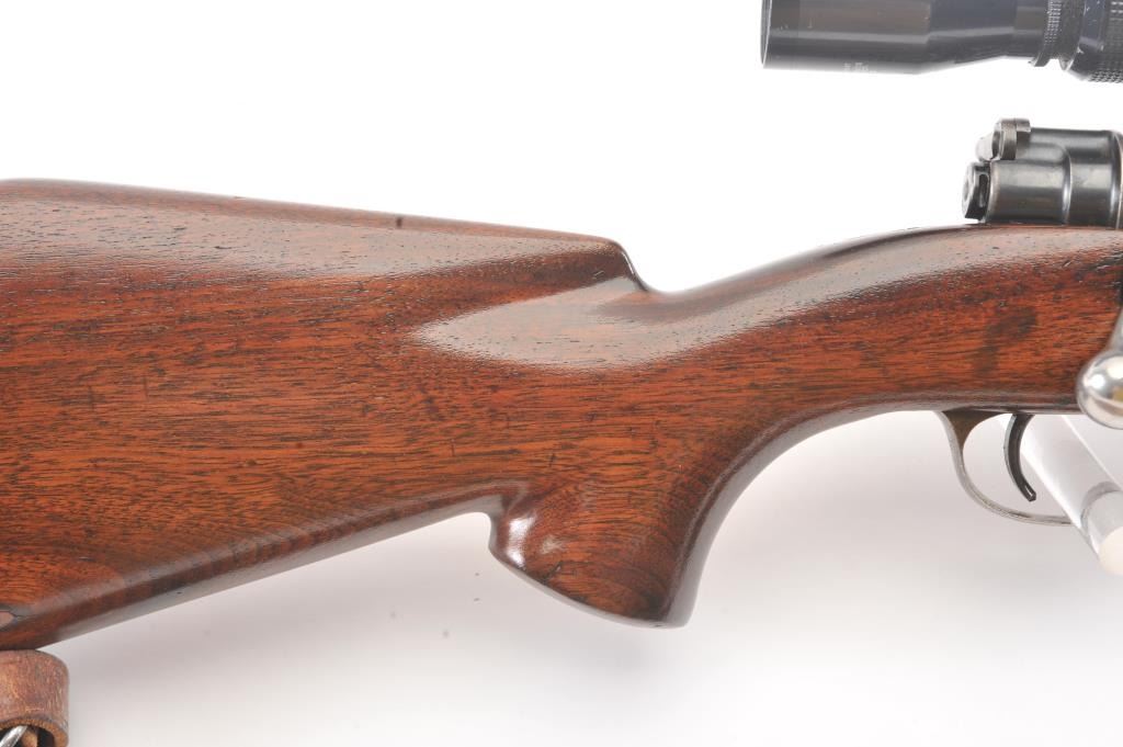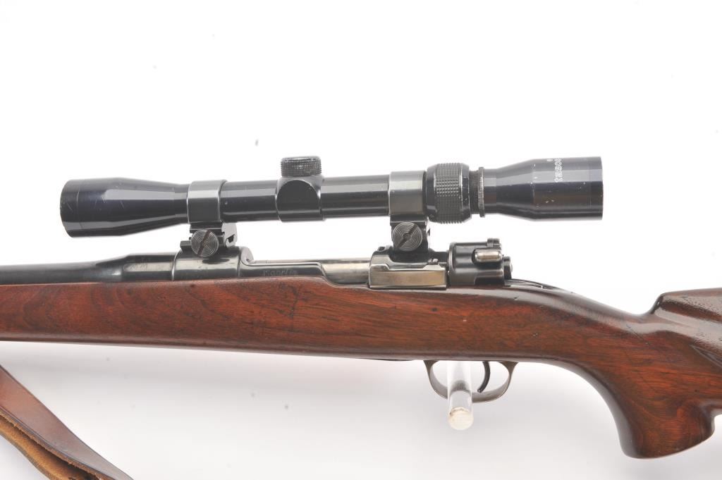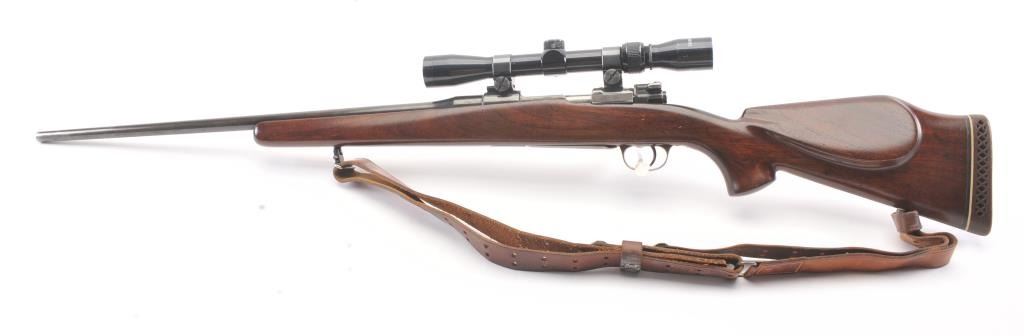 Custom Mauser 98 bolt action sporting rifle, 6mm caliber, Serial #NSNV. The rifle is in very good overall condition with a 24” barrel. The metal surfaces have been re-blued and the bolt handle has been cut and re-welded to facilitate scope mounting. The metal surfaces retain nearly all of an old, quality re-blue. The magazine floor plate has a Nazi Waffen proof. The smooth wood custom stock has a pistol grip andexaggerated cheek piece, ending with a ventilated rubber recoil pad. Sling swivels and a period leather sling were added during the period of use. The bore is good, the action is crisp and the markings are mostlylegible. The rifle is topped with Weaver mounts, rings and a Tasco 3 x 9 variable power scope. Est.: $400-$800. (Modern).