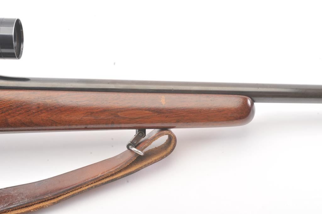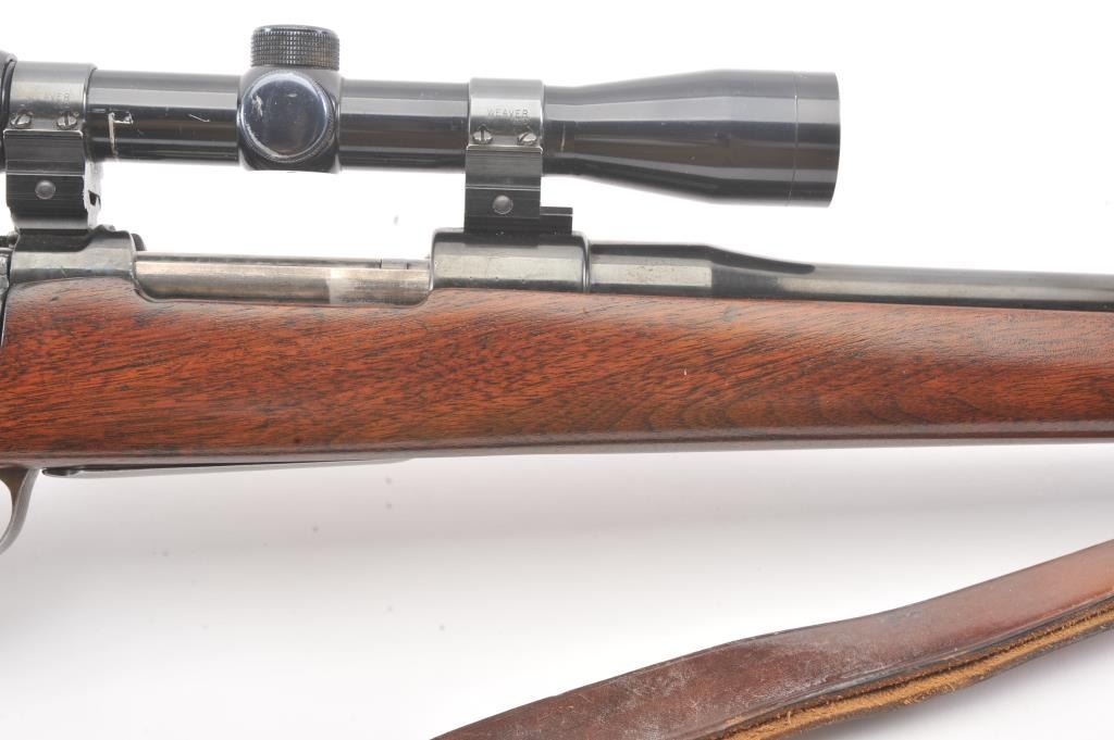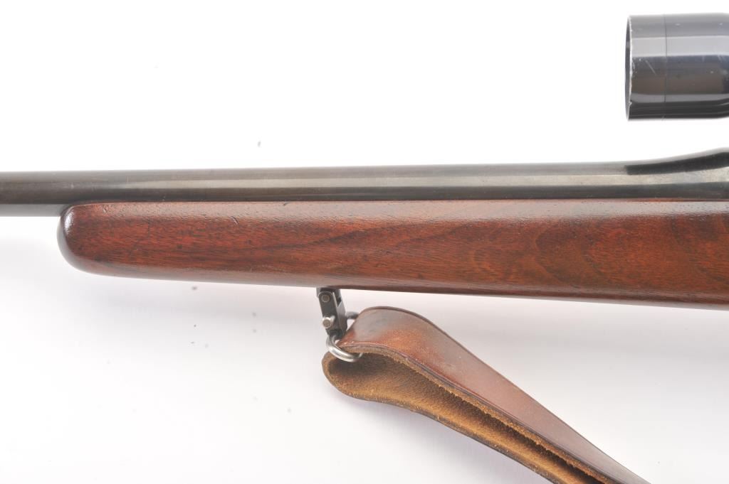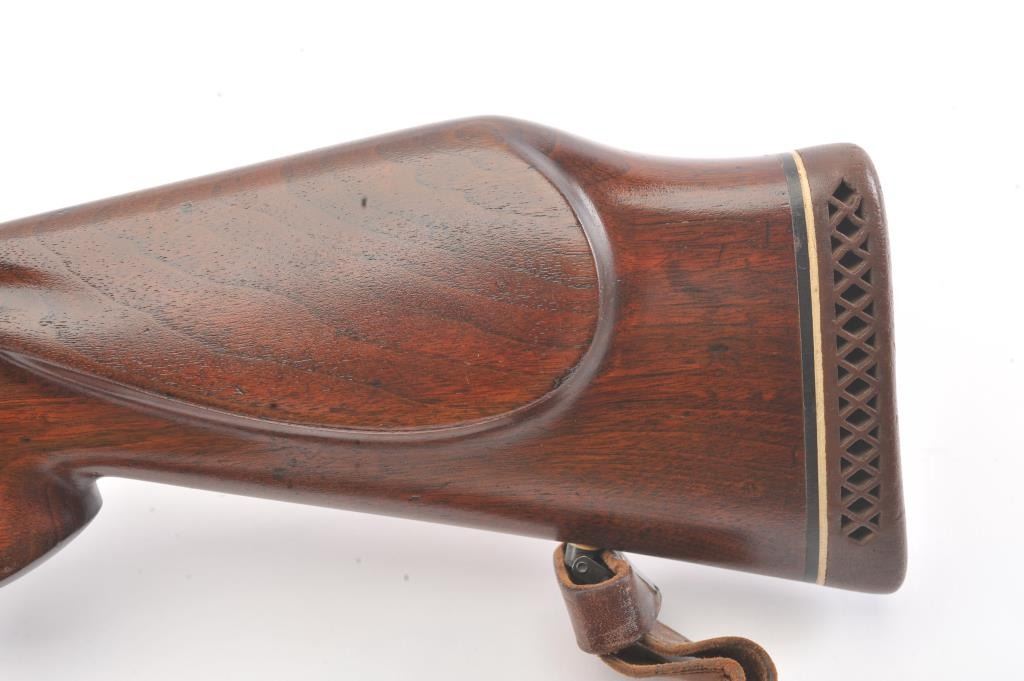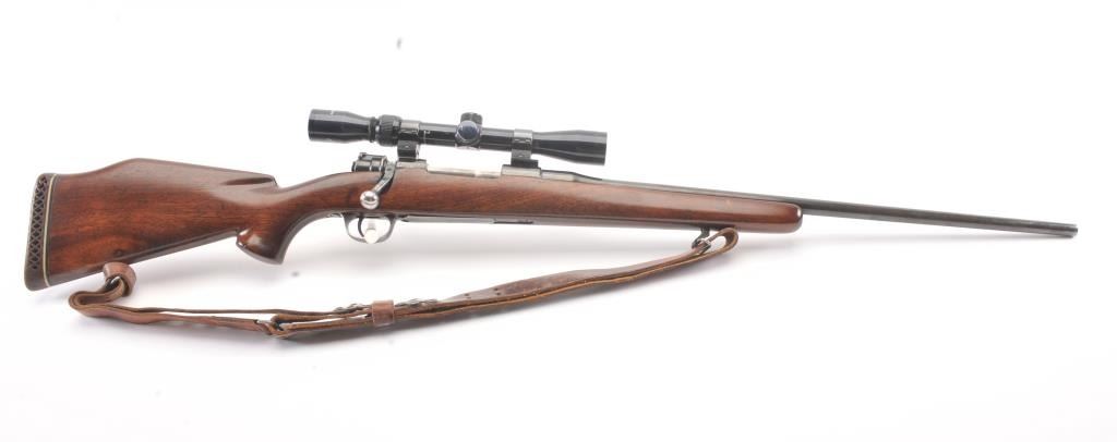 Custom Mauser 98 bolt action sporting rifle, 6mm caliber, Serial #NSNV. The rifle is in very good overall condition with a 24” barrel. The metal surfaces have been re-blued and the bolt handle has been cut and re-welded to facilitate scope mounting. The metal surfaces retain nearly all of an old, quality re-blue. The magazine floor plate has a Nazi Waffen proof. The smooth wood custom stock has a pistol grip andexaggerated cheek piece, ending with a ventilated rubber recoil pad. Sling swivels and a period leather sling were added during the period of use. The bore is good, the action is crisp and the markings are mostlylegible. The rifle is topped with Weaver mounts, rings and a Tasco 3 x 9 variable power scope. Est.: $400-$800. (Modern).