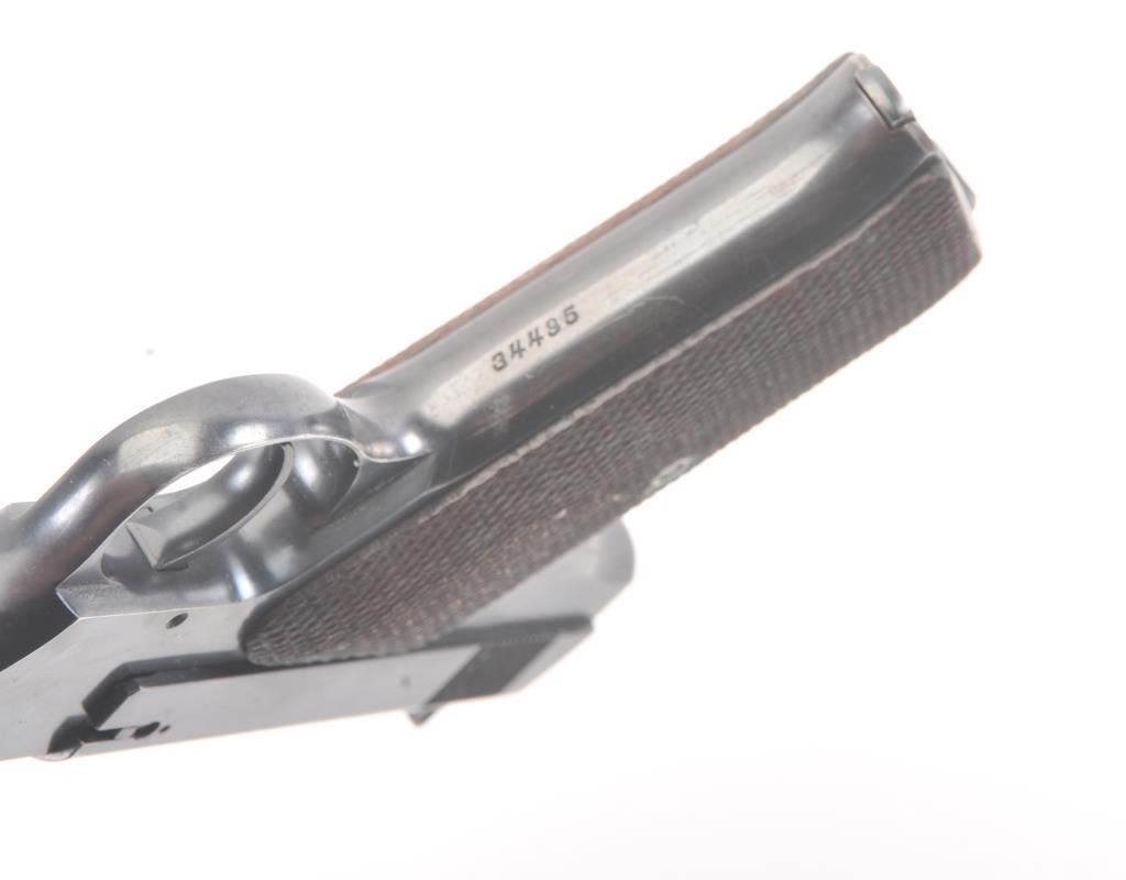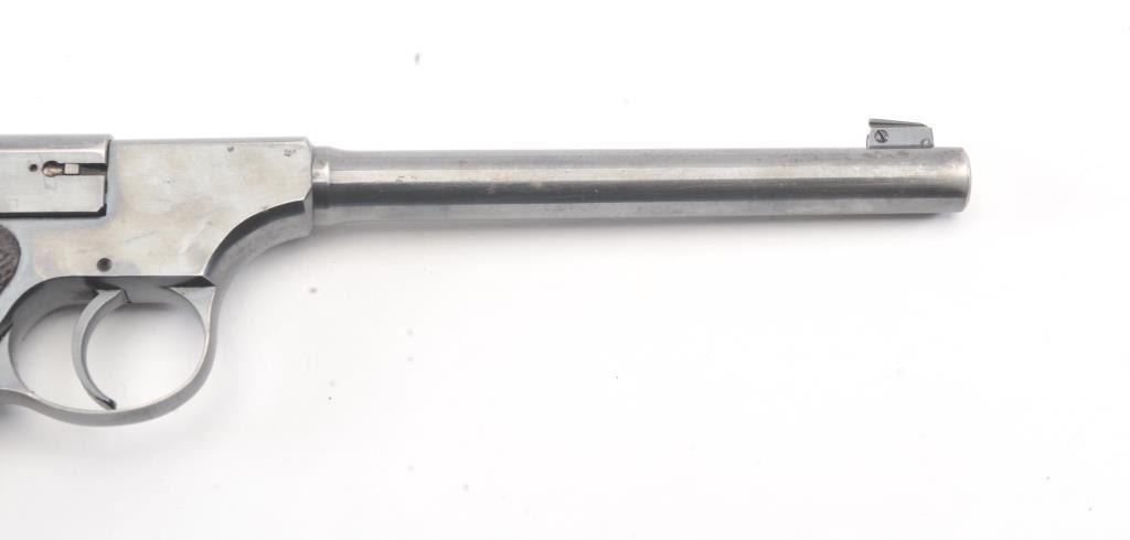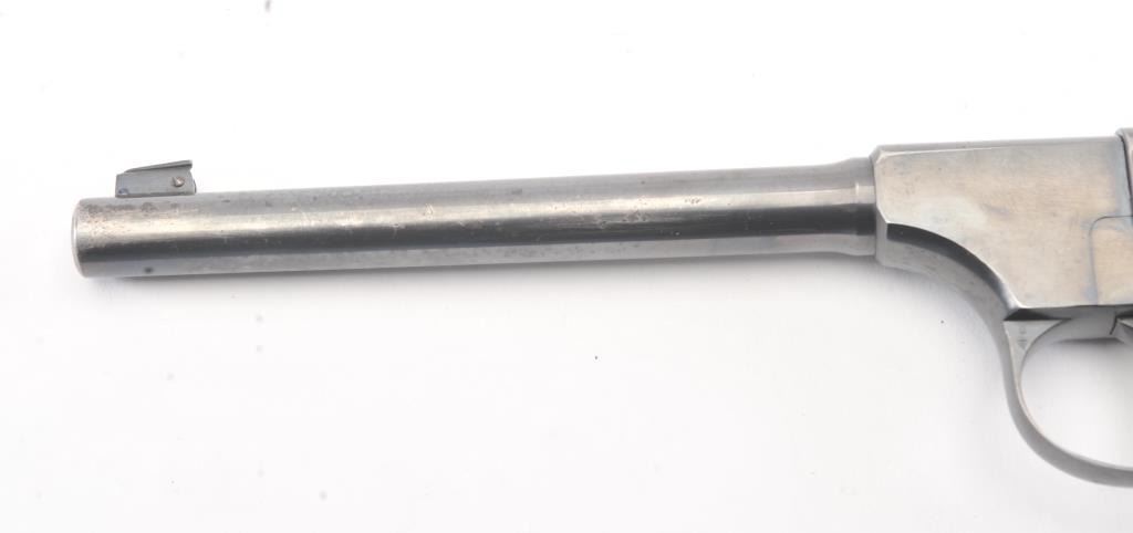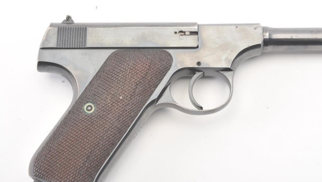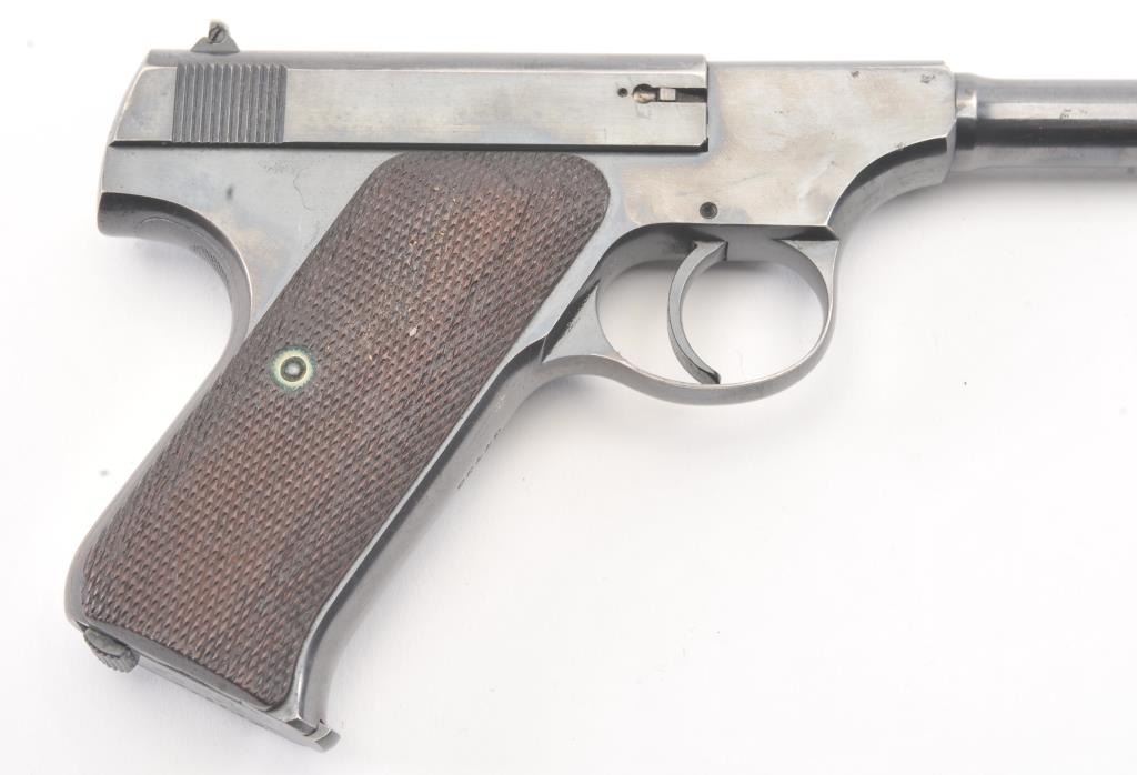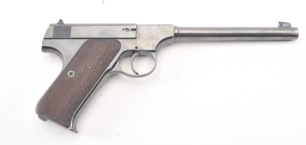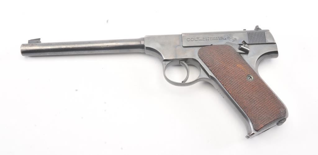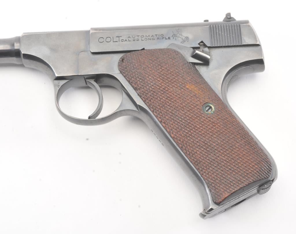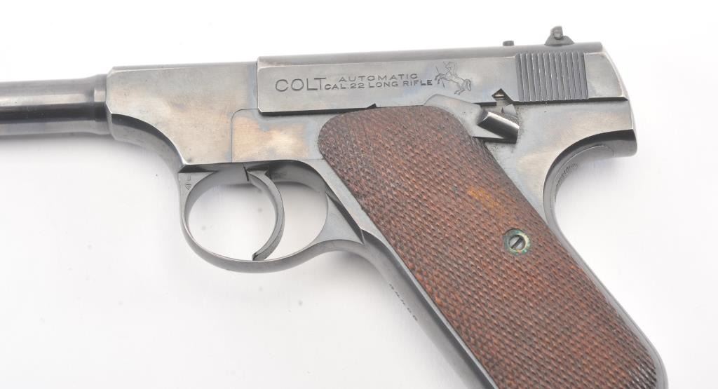 Colt Pre-Woodsman semi-automatic pistol, .22 L.R. caliber, Serial #34495. The pistol is in fine overall condition retaining approximately 90% of the blue finish with wear on the left side of the 6 ¾” Pencilbarrel. There are seven digits that have been inscribed around the magazine well. The checkered wood grips are in very good condition with some flattening of the checkering. The bore is good, the action iscrisp and the markings are sharp on this desirable Colt circa 1923. The lot includes one correct, two-tone magazine. Est.: $400-$800. (C+R/PPT).