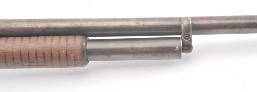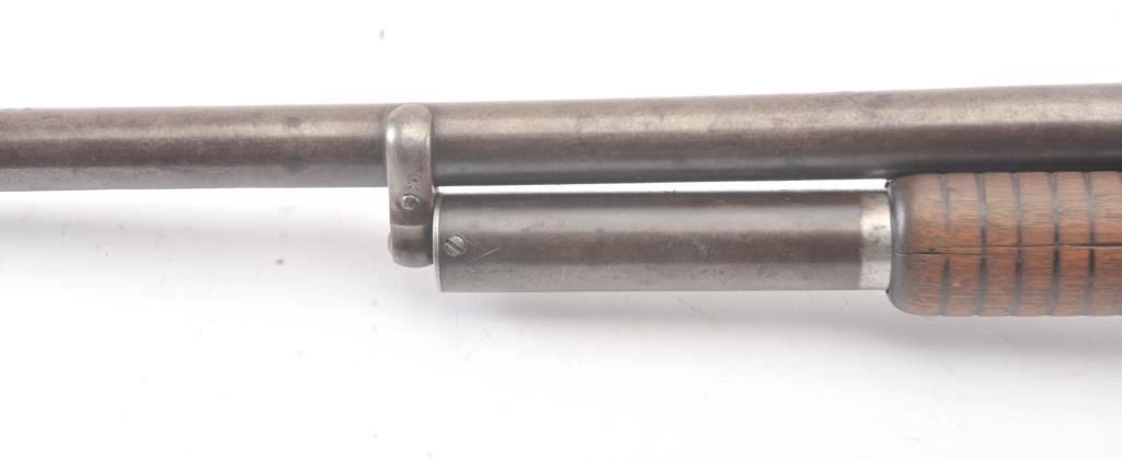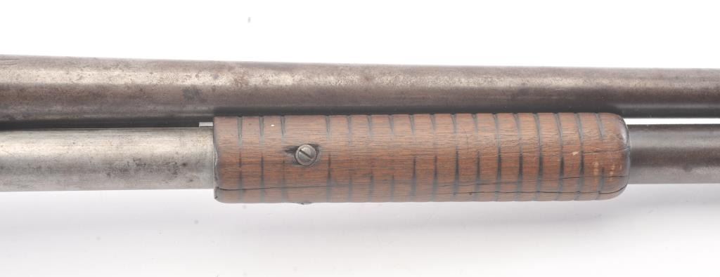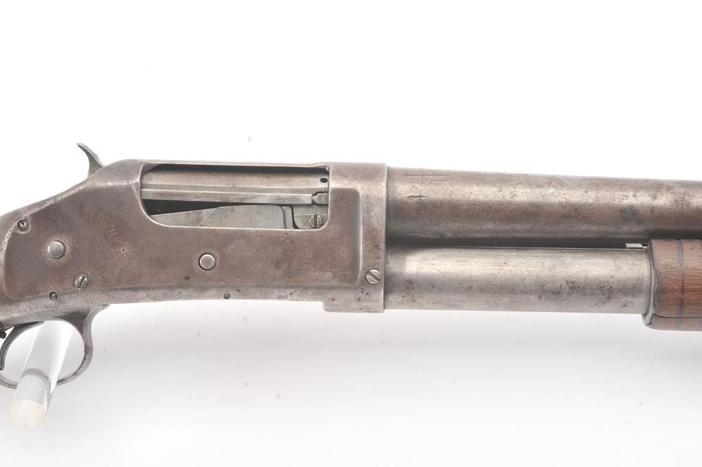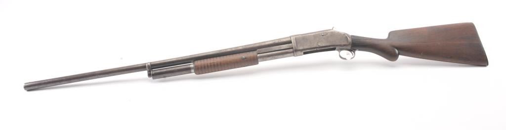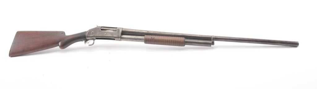 Winchester Model 1897 pump shotgun, 12 gauge, Serial #733046. The shotgun is in good overall condition with a 30” barrel. The shotgun has gone to a mottled grey/brown patina. The smooth wood stocks are in goodcondition showing heavy use with a round knob pistol grip and smooth steel butt plate which is slightly proud. The bore is fair, the action is crisp and the markings are legible. Est.: $300-$600. (C+R).