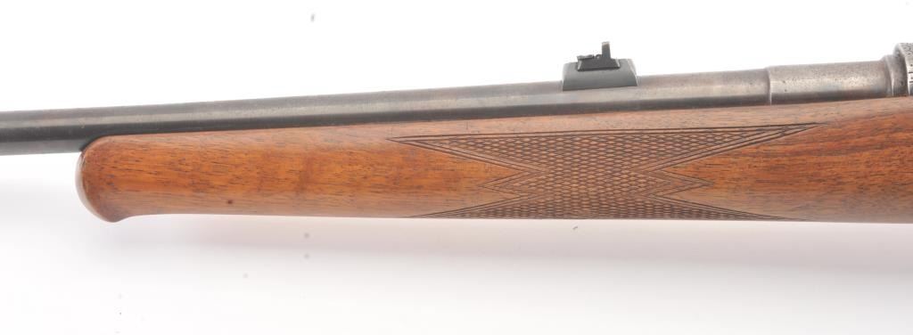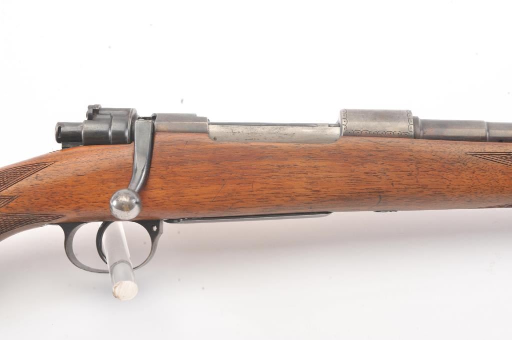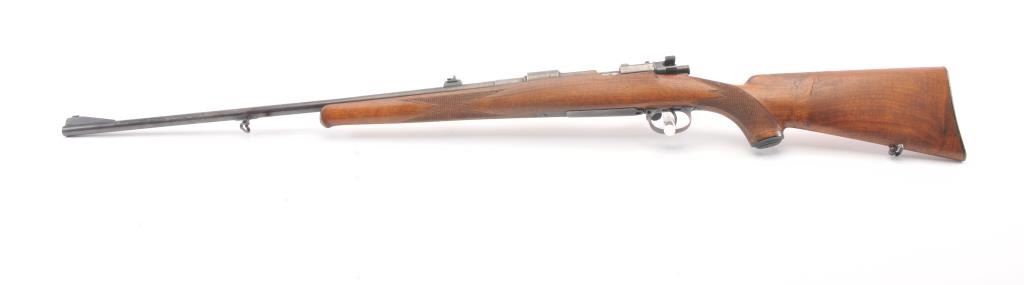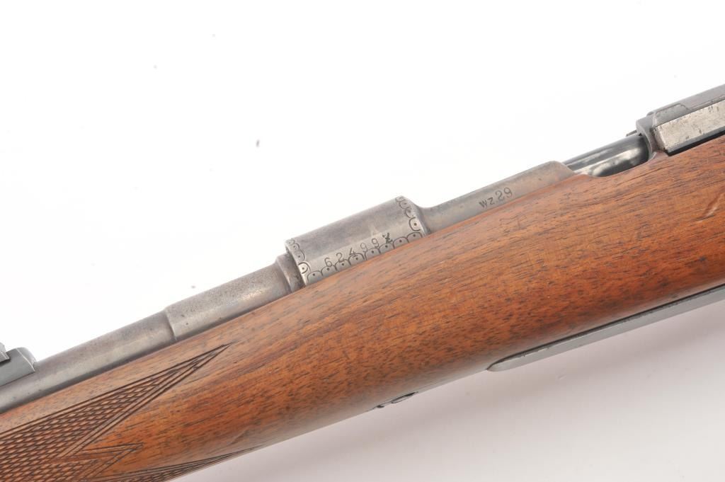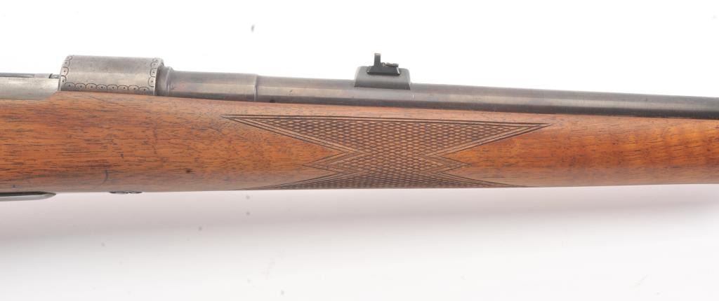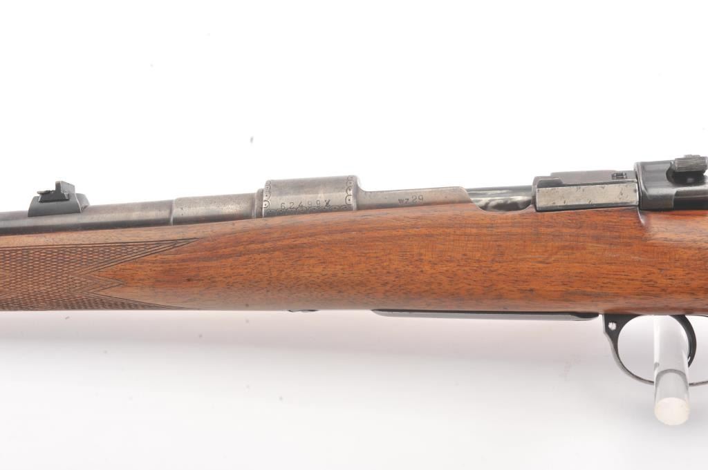 Custom German Mauser 98 pre-war sporting rifle, 8mm caliber, Serial #62499Z. The rifle is in very good overall condition with a 26” barrel with a ramped blade front, two blade folding rear sights and sling swivel.The metal surfaces have gone to mottled patina with light border engraving visible on the receiver, marked wz.29 on the side wall. The checkered wood stock has a slight Schnabel fore end, horn grip cap and buttplate. The bore is fair, the action is crisp and the markings are sharp on this pre-war 98 sporter. Est.: $300-$600. (C+R).
