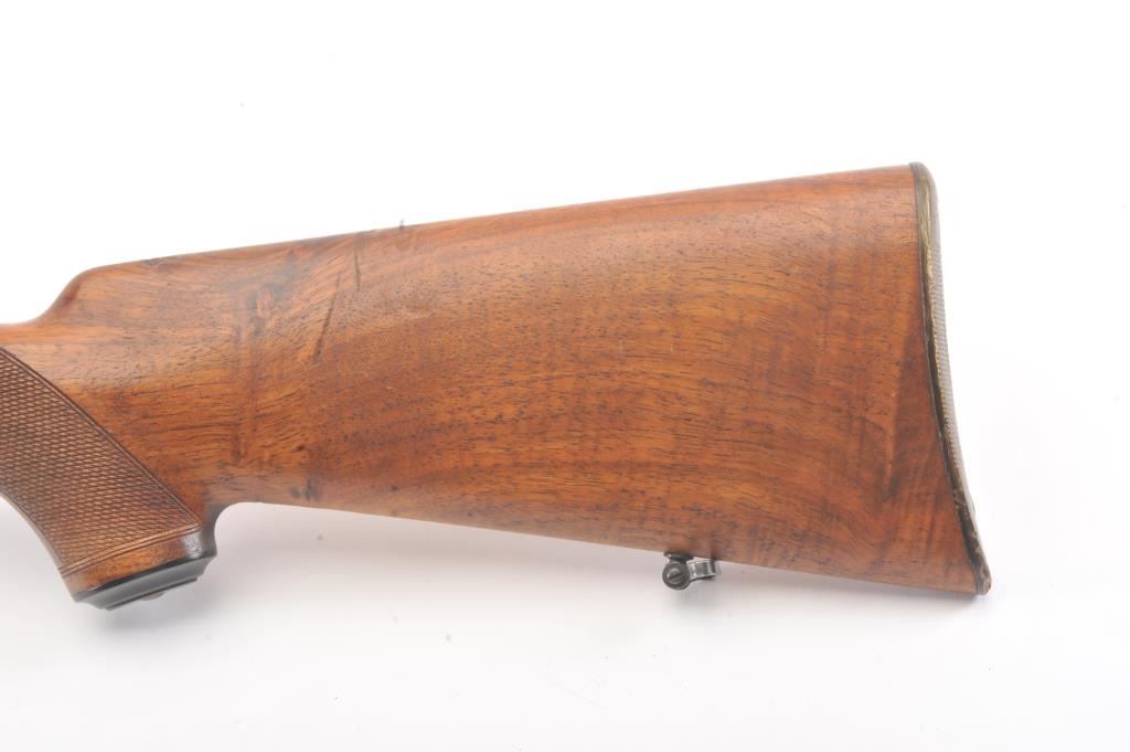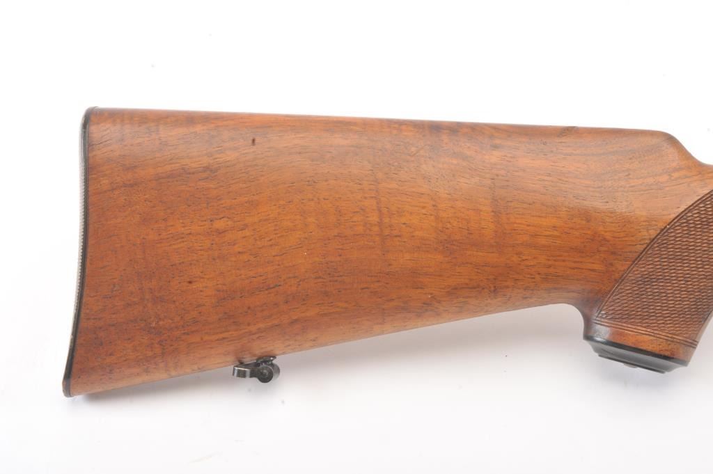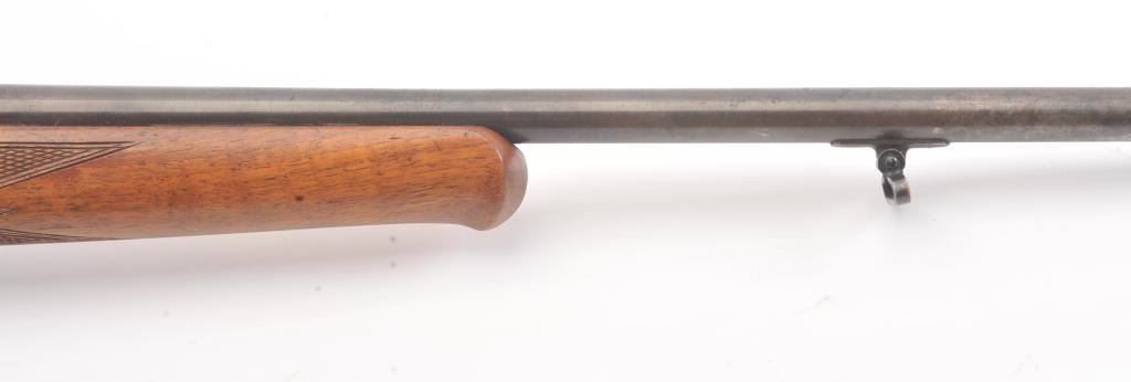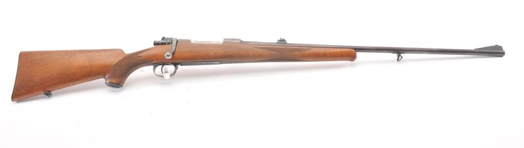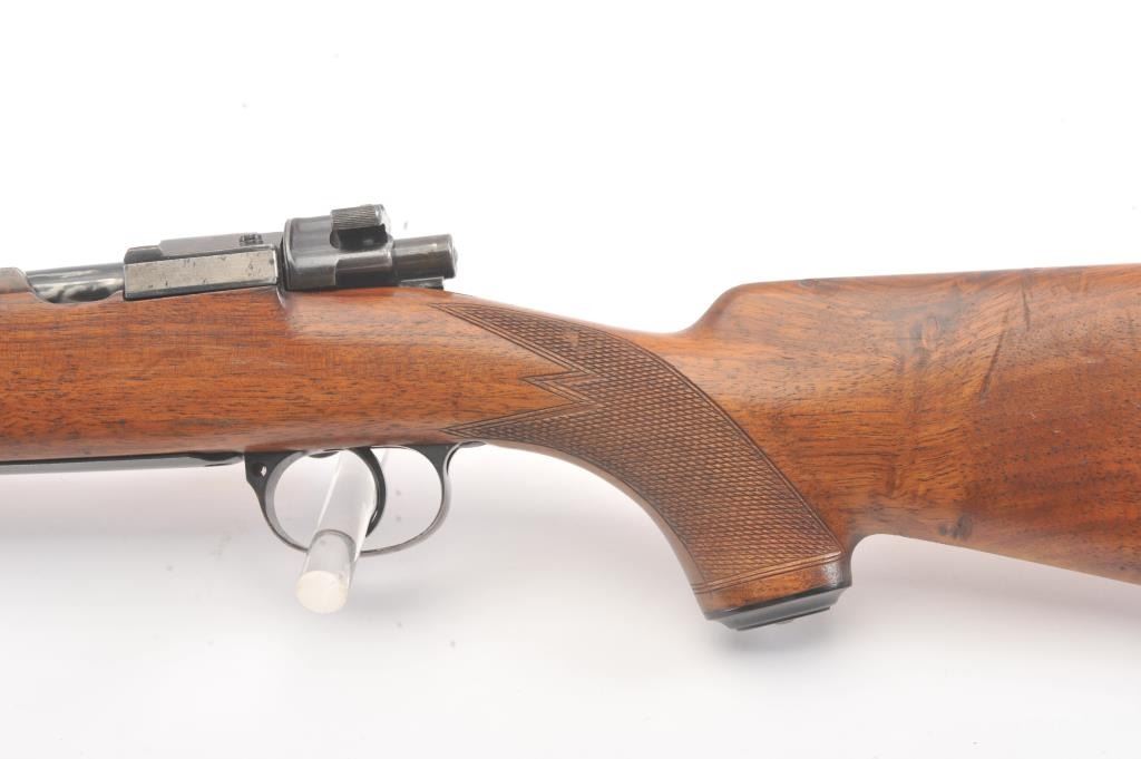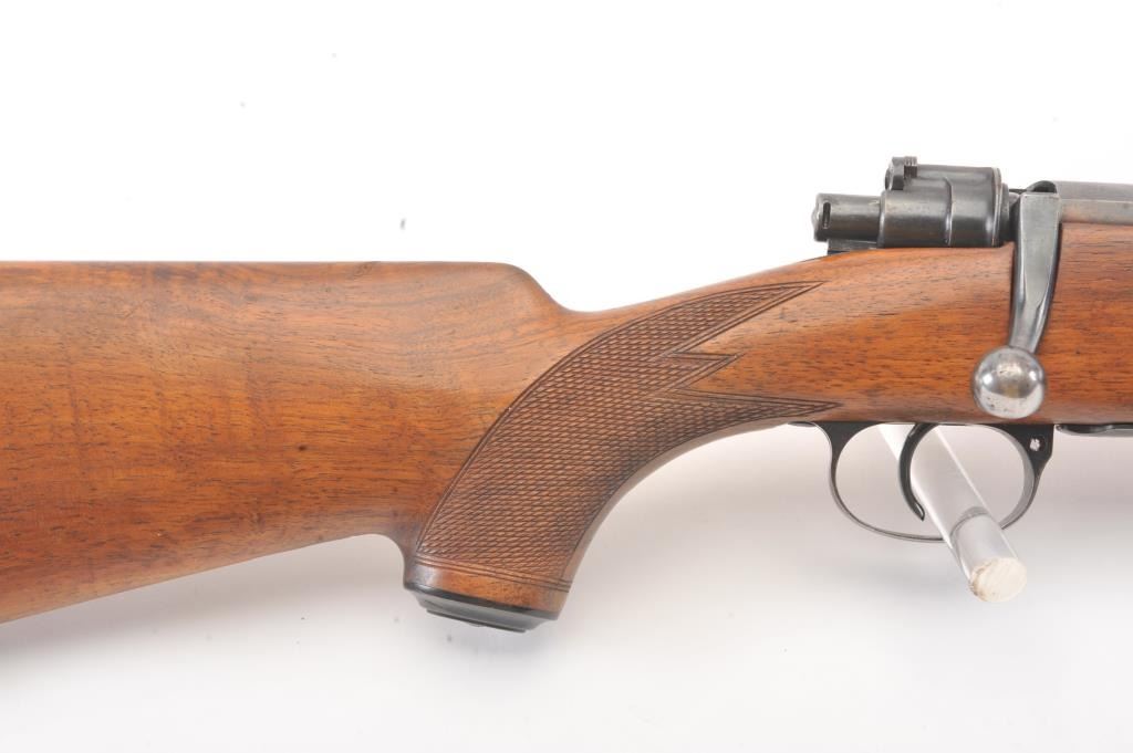 Custom German Mauser 98 pre-war sporting rifle, 8mm caliber, Serial #62499Z. The rifle is in very good overall condition with a 26” barrel with a ramped blade front, two blade folding rear sights and sling swivel.The metal surfaces have gone to mottled patina with light border engraving visible on the receiver, marked wz.29 on the side wall. The checkered wood stock has a slight Schnabel fore end, horn grip cap and buttplate. The bore is fair, the action is crisp and the markings are sharp on this pre-war 98 sporter. Est.: $300-$600. (C+R).