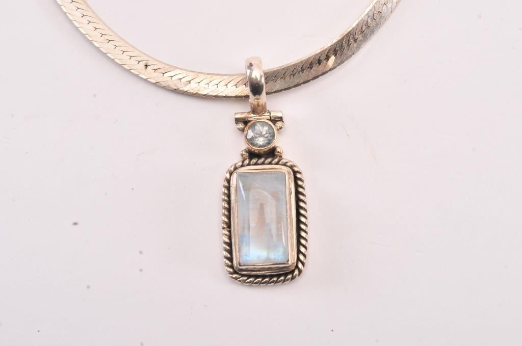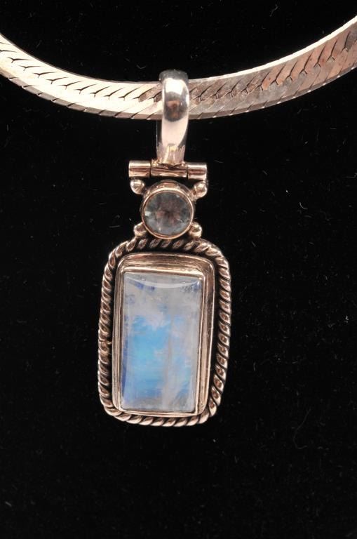 One handmade pendant in sterling silver set with a very unusual chatoyant purplish serpentine and a blue zircon Est:$150-300