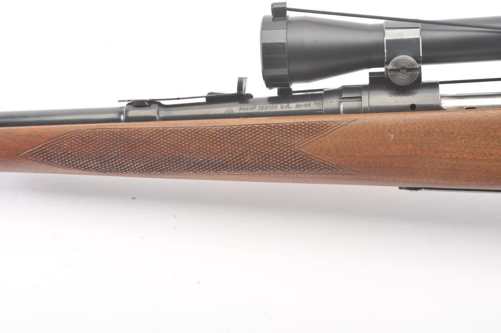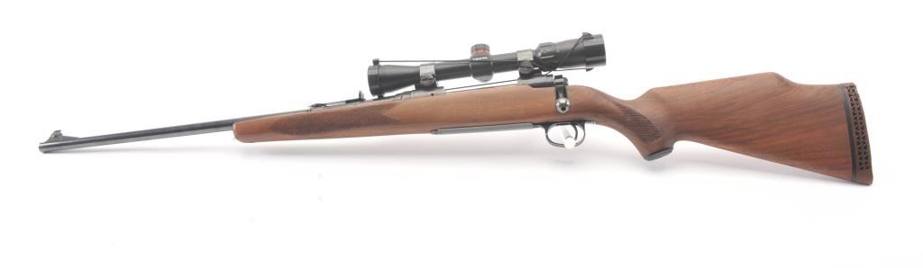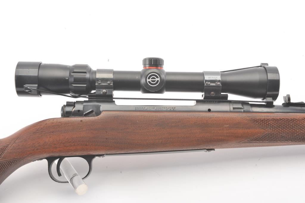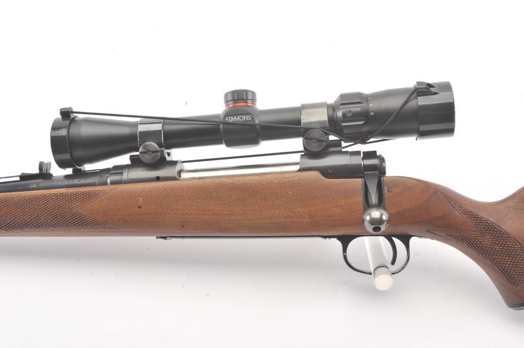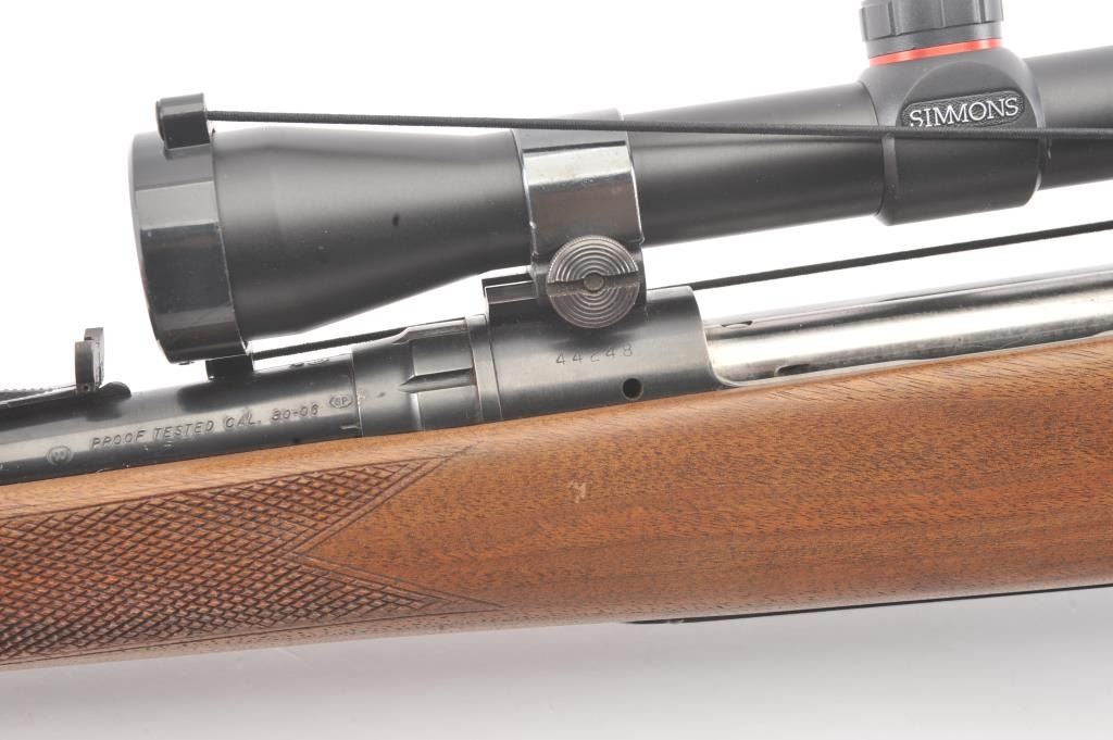 Savage Model 110L left handed bolt action rifle, .30-06 caliber, Serial #44248. The rifle is in very good overall condition with a 22” barrel. The rifle retains approximately 90% of the blue finish withlight surface erosion on the barrel. The checkered wood stock is in very good condition with small mars and compressions consistent with field use. The butt stock ends with a ventilated rubber recoil pad.The rifle is topped with a Simmons 3 x 9 variable power scope. The bore is good, the action is crisp and the markings are sharp. Est.: $250-$500. (Modern).