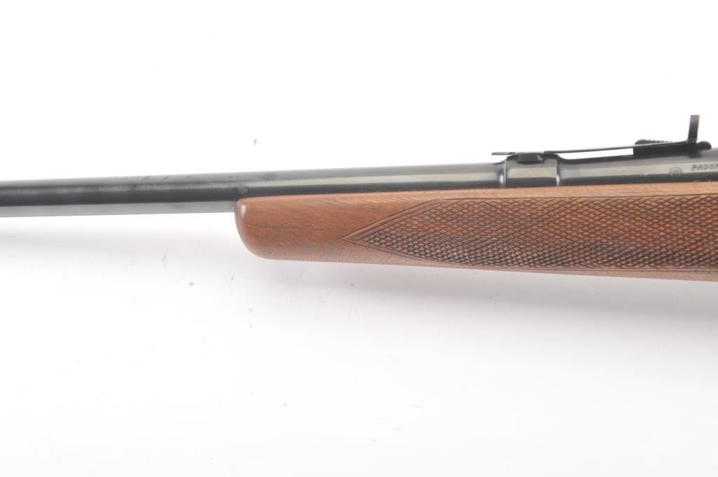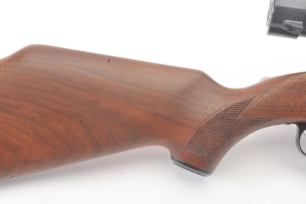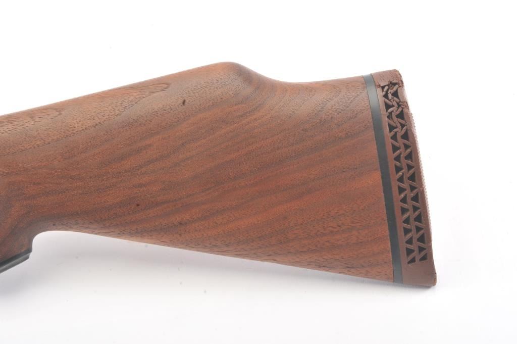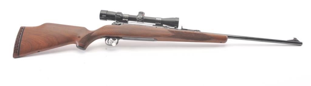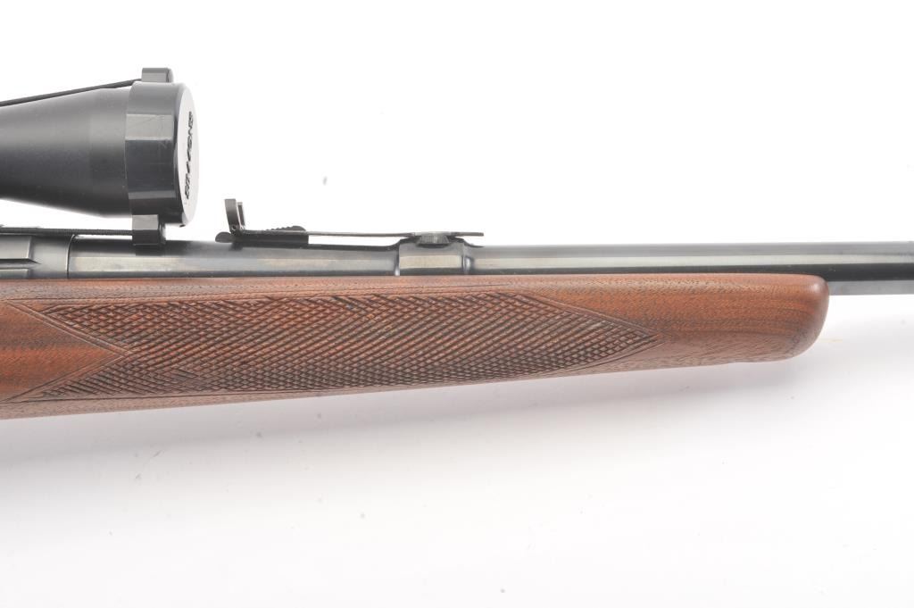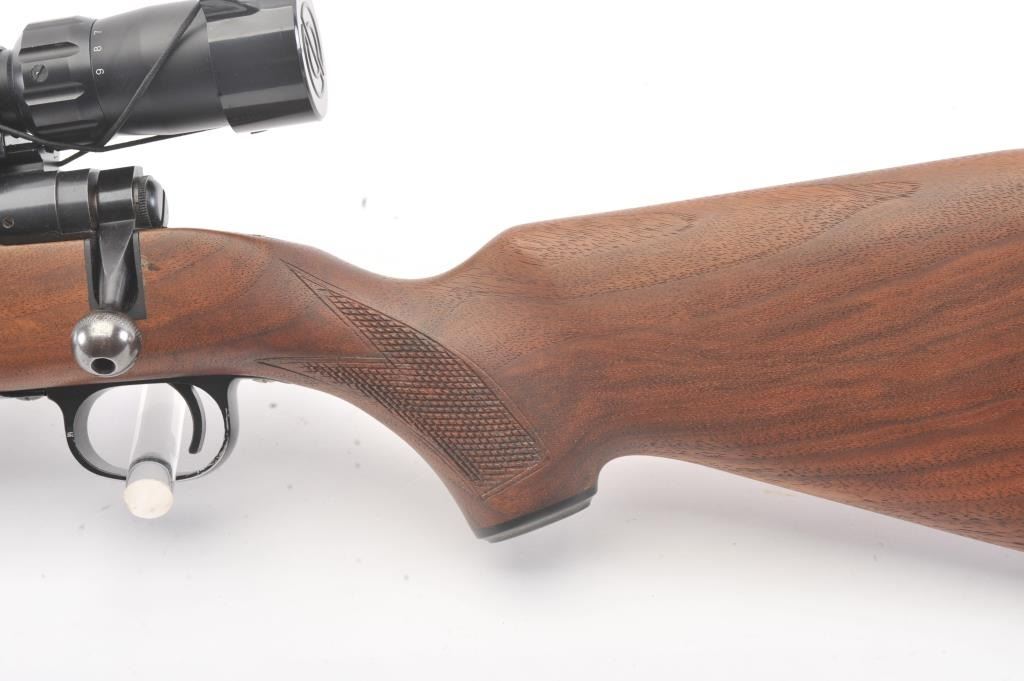 Savage Model 110L left handed bolt action rifle, .30-06 caliber, Serial #44248. The rifle is in very good overall condition with a 22” barrel. The rifle retains approximately 90% of the blue finish withlight surface erosion on the barrel. The checkered wood stock is in very good condition with small mars and compressions consistent with field use. The butt stock ends with a ventilated rubber recoil pad.The rifle is topped with a Simmons 3 x 9 variable power scope. The bore is good, the action is crisp and the markings are sharp. Est.: $250-$500. (Modern).