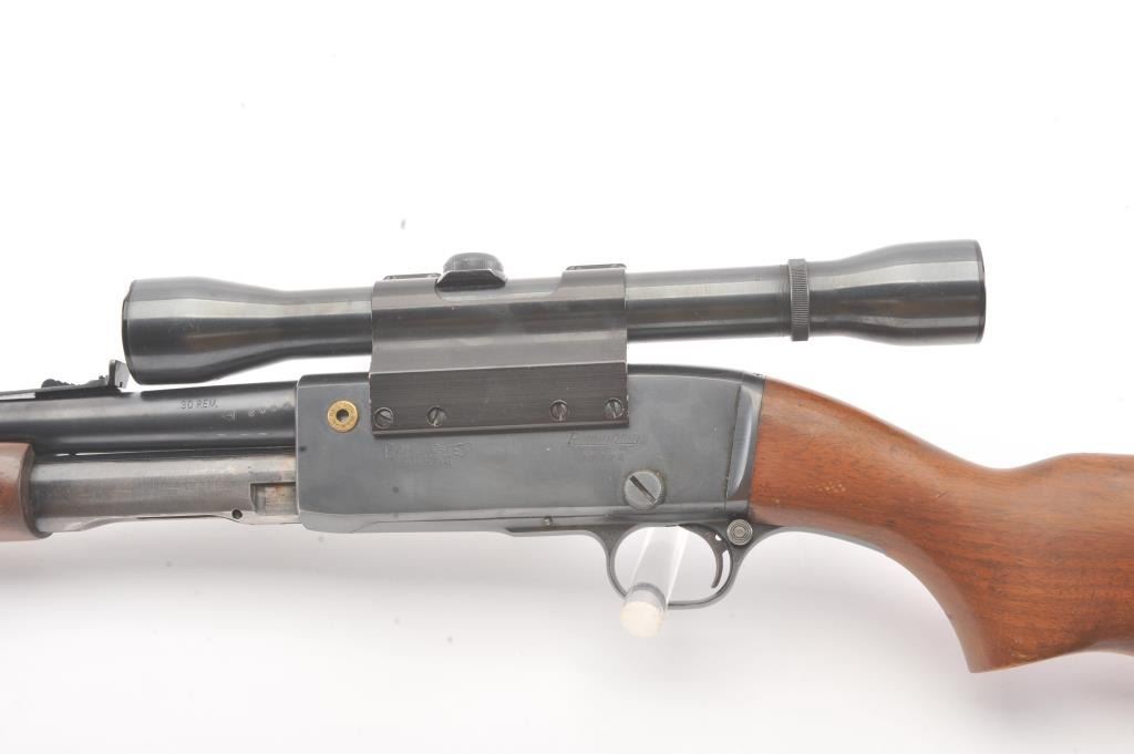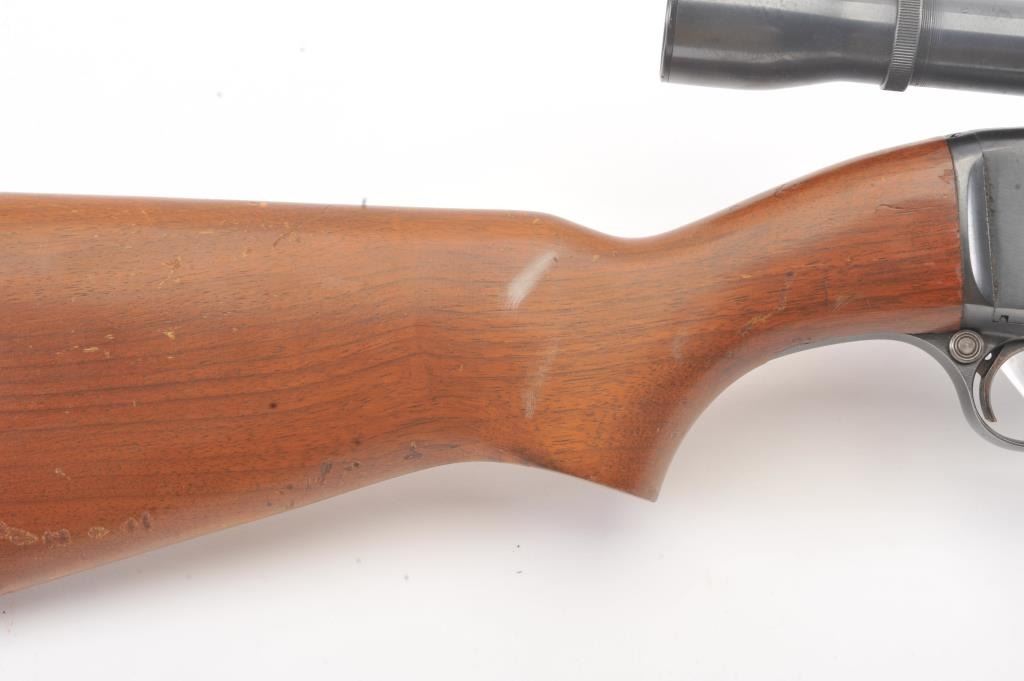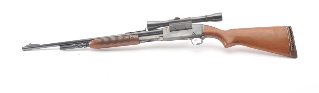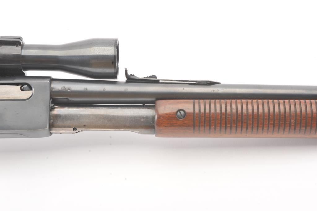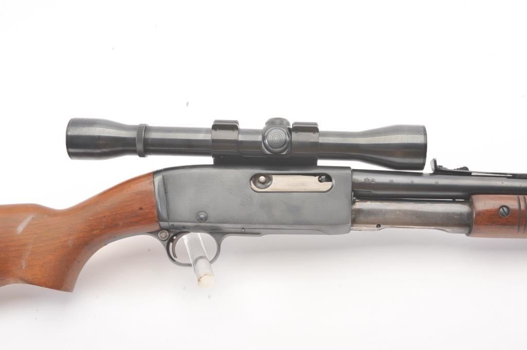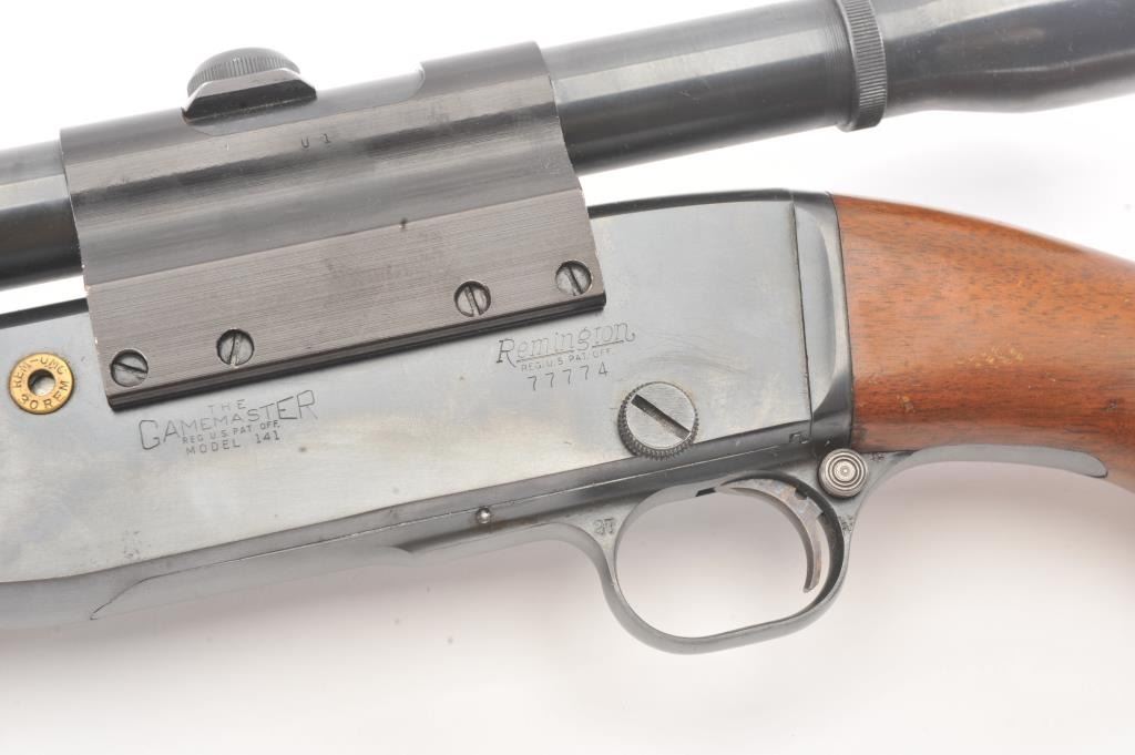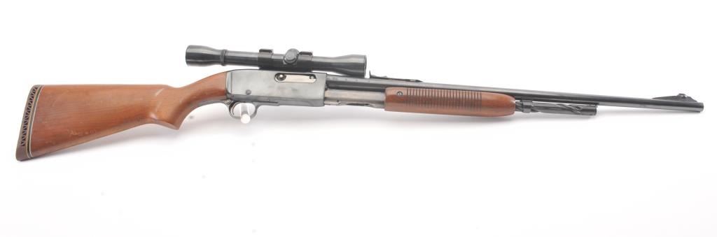 Remington Model 141 pump rifle, .30 Remington caliber, Serial #77774. The rifle is in very good to nearly fine overall condition with a 24” barrel with a ramped blade front and standard rear sights. The metal surfaces retain nearly all of the muted blue finish with light scratches and wear at the muzzle. The smooth wood stocks are in very good condition with a ventilated rubber pad added. The bore is good, the action is crisp andthe markings are sharp. The rifle is topped with a Weaver K4 fixed power scope with clear, crisp optics. Est.: $250-$500. (C+R).