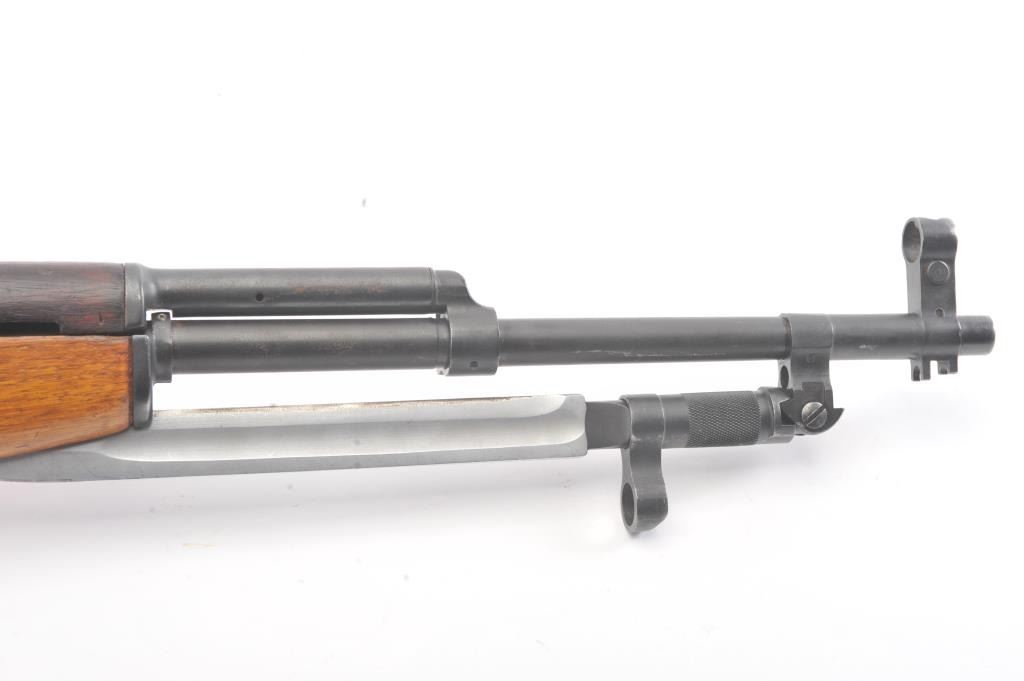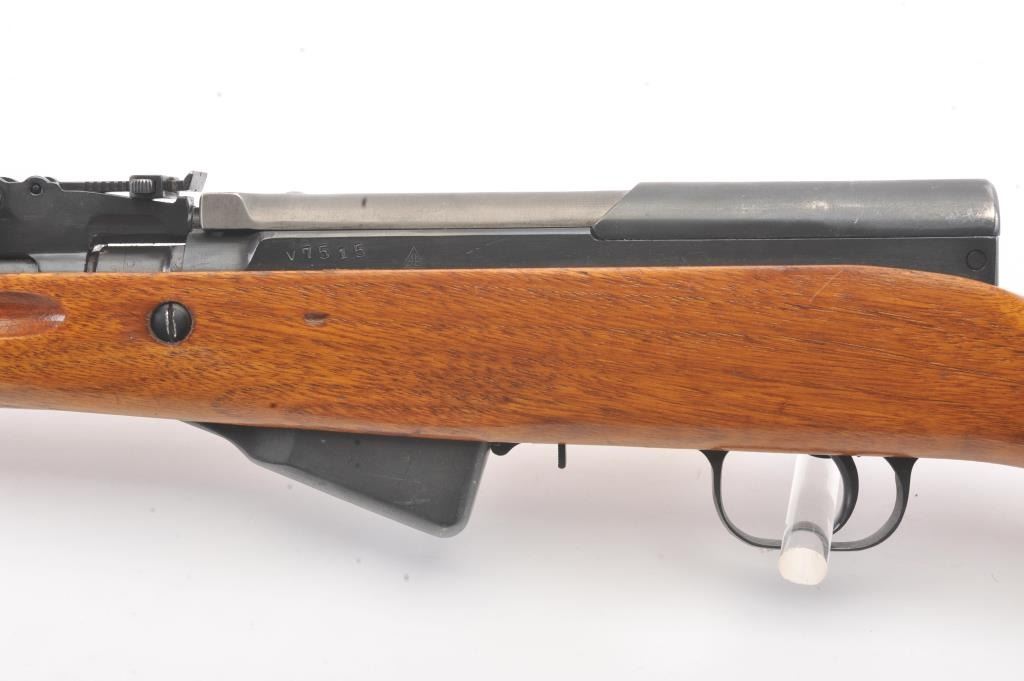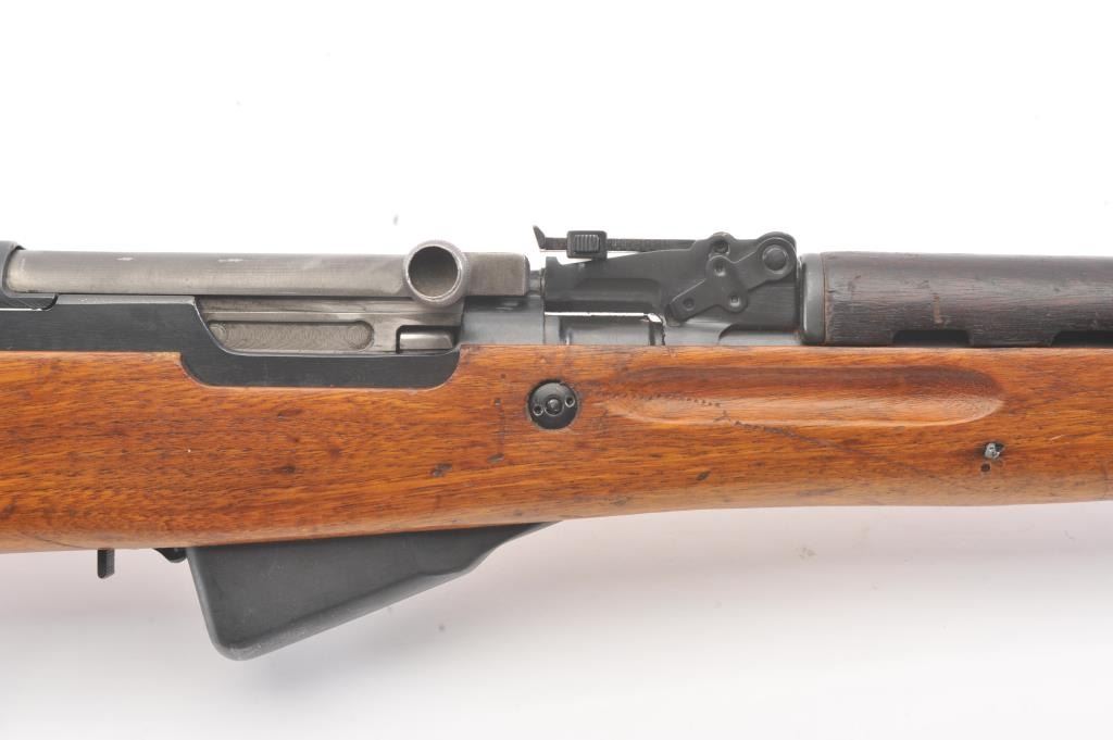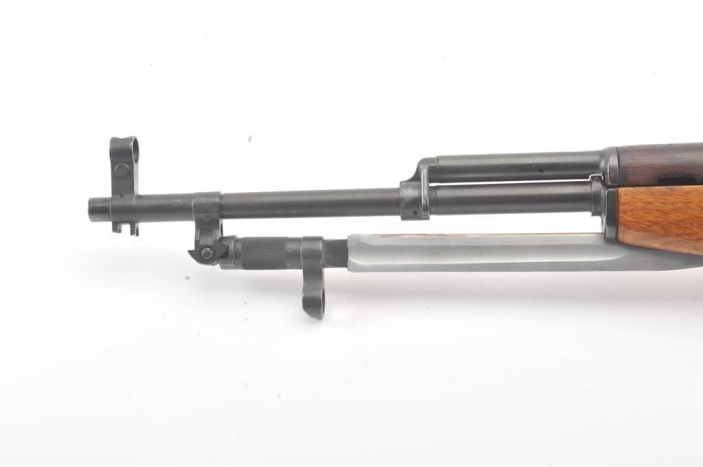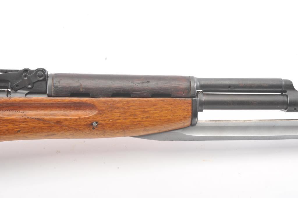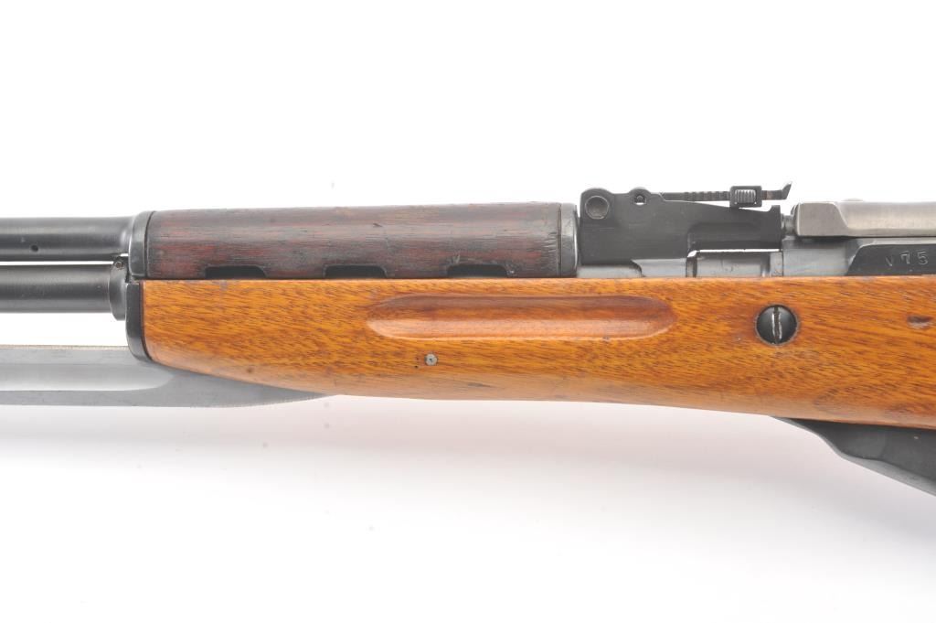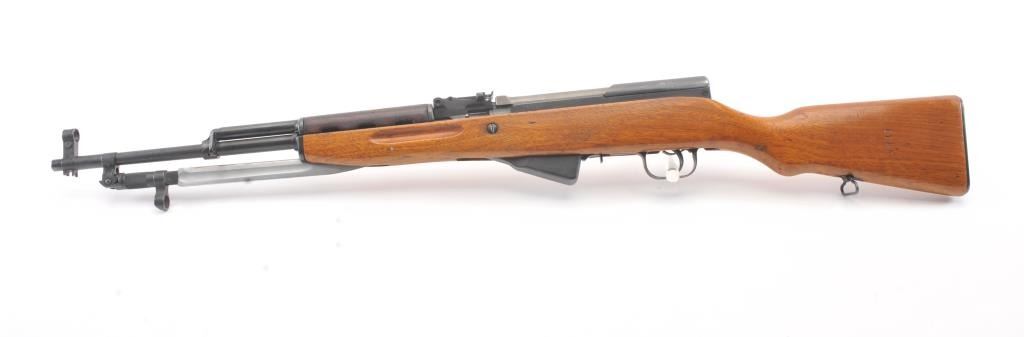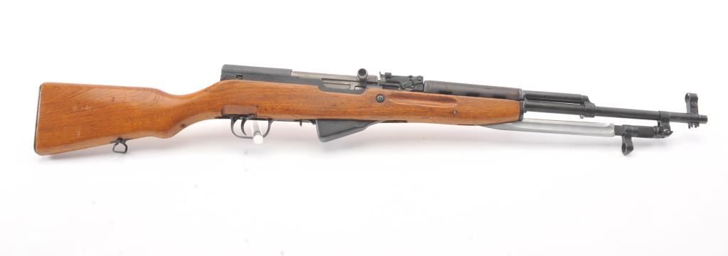 Chinese Norinco SKS semi-automatic rifle, 7.62 x 39 caliber, Serial #V7515. The rifle is in very good overall condition with a 20” barrel with a hooded aircraft front and military tangent rear sights. The rifleretains the majority of the military finish with all matching visible serial numbers. The smooth wood stock is in good overall condition with a mismatched piece on the fore end showing mars and compressions consistent with service use. The butt stock has had sling swivels and the folding bayonet is retained. The bore is good, the action is crisp and the markings are sharp. Est.: $250-$500. (Modern).